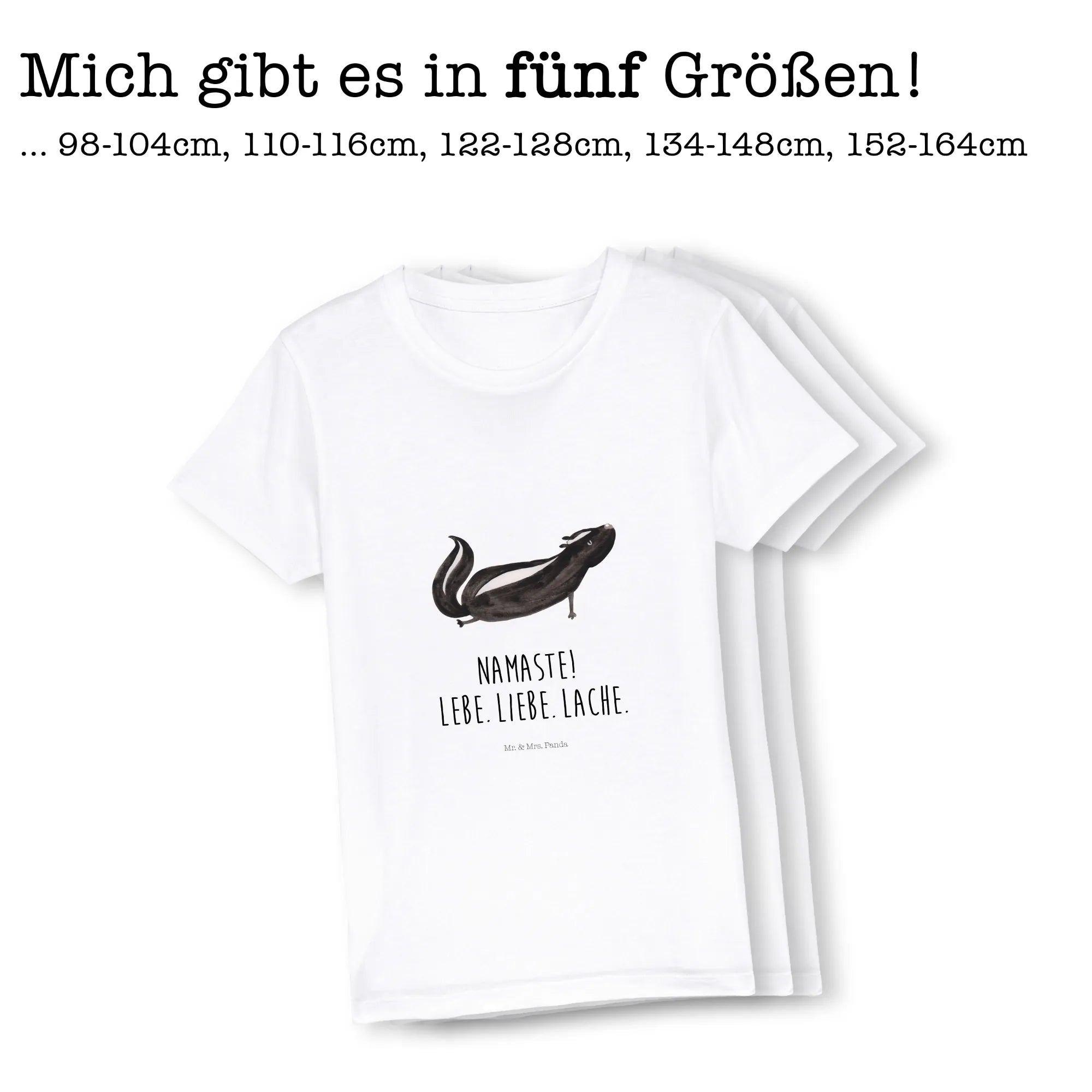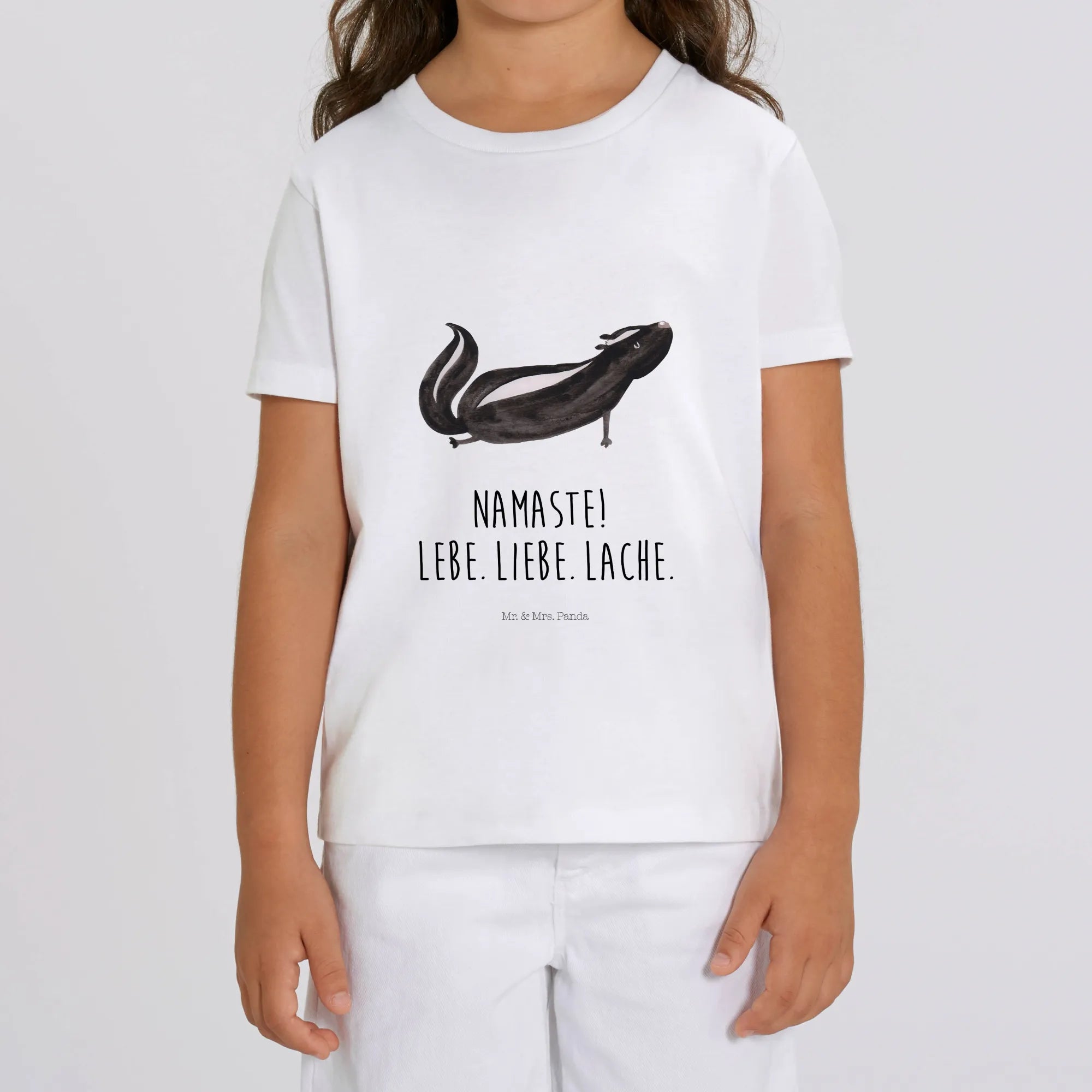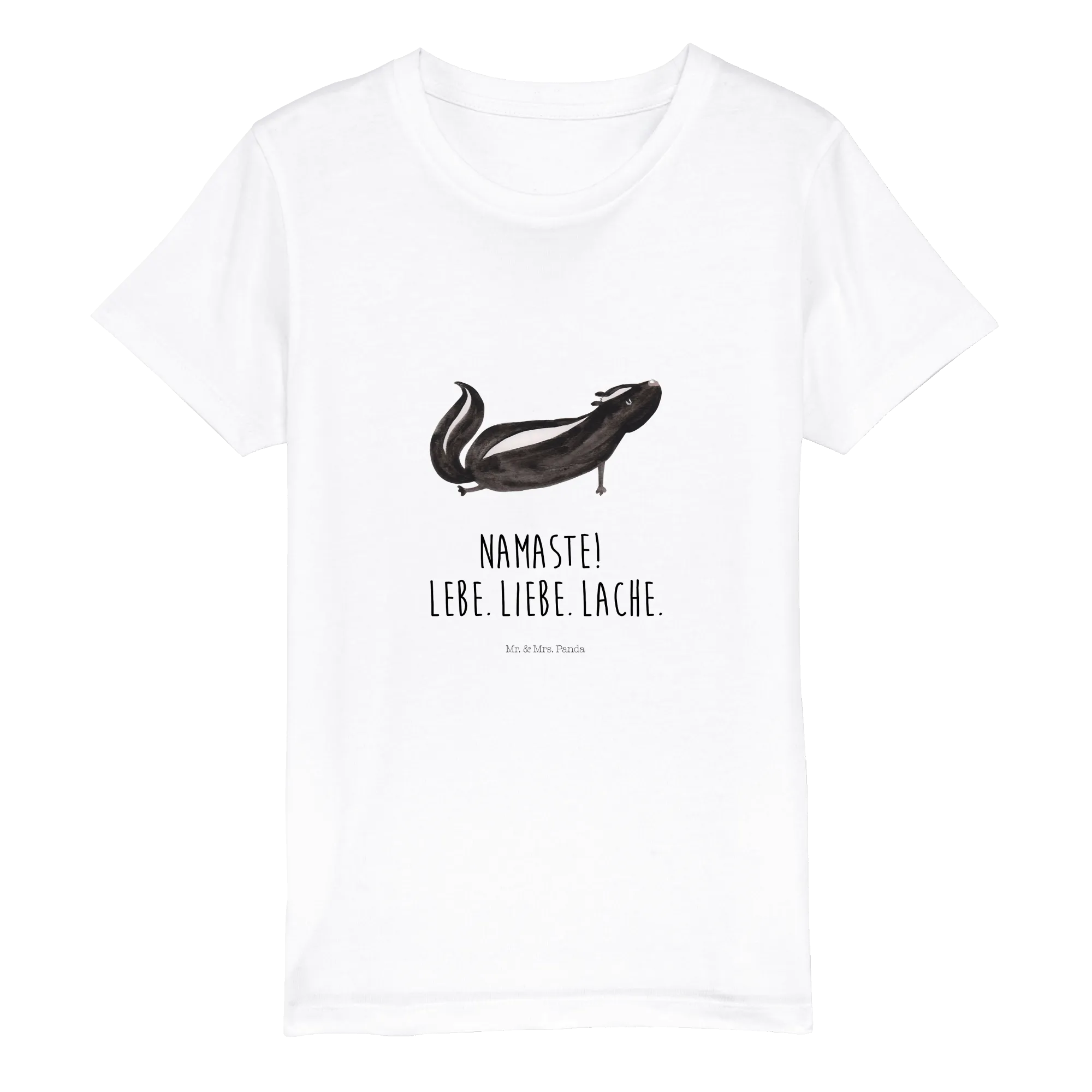 Wunderschönes Organic Kinder T-Shirt „Stinktier Yoga“ aus der Stinktier - Kollektion von Mr. & Mrs. Panda. Ein süßes Stinktier im Aquarellstil, das Yoga macht und dabei den liebevollen Spruch „Namaste! Lebe. Liebe. Lache.“ trägt. Perfekt für Kinder, die Tiere und kleine, lebensfrohe Botschaften lieben. 🧘♀️🦨
