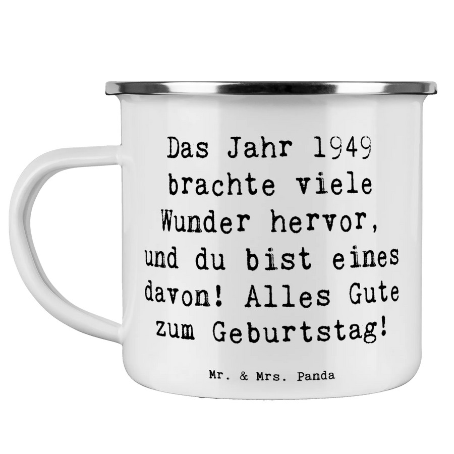 Die wunderschöne Camping Emaille Tasse von Mr. & Mrs. Panda ist das perfekte Geschenk für all jene, die 1949 geboren wurden! Diese praktische und zugleich liebevolle Trinkbecher wird die Gesichter Deiner Freunde und Familie zum Strahlen bringen und eignet sich perfekt für jeden Outdoor-Liebhaber. Egal ob beim Camping, Wandern oder einfach nur beim gemütlichen Kaffee trinken im Garten – mit dieser genialen Emaille Tasse bist Du bestens ausgestattet.