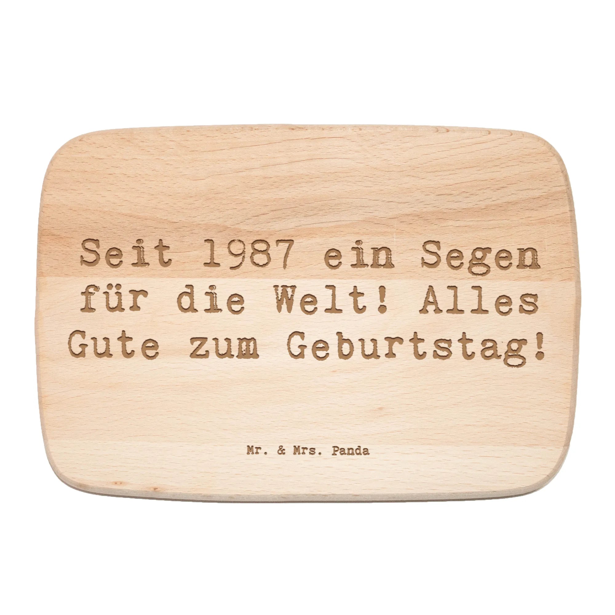 Das Frühstücksbrett von Mr. & Mrs. Panda ist das perfekte Geschenk für alle, die 1987 geboren wurden oder deren jahreszeitlichen Geburtstagsfeiern im Zeichen der Lebensfreude stehen. Mit dem liebevoll gestalteten Spruch 'Seit 1987 ein Segen für die Welt! Alles Gute zum Geburtstag!' bringt dieses robuste Frühstücksbrett eine persönliche Note in jede Küche.