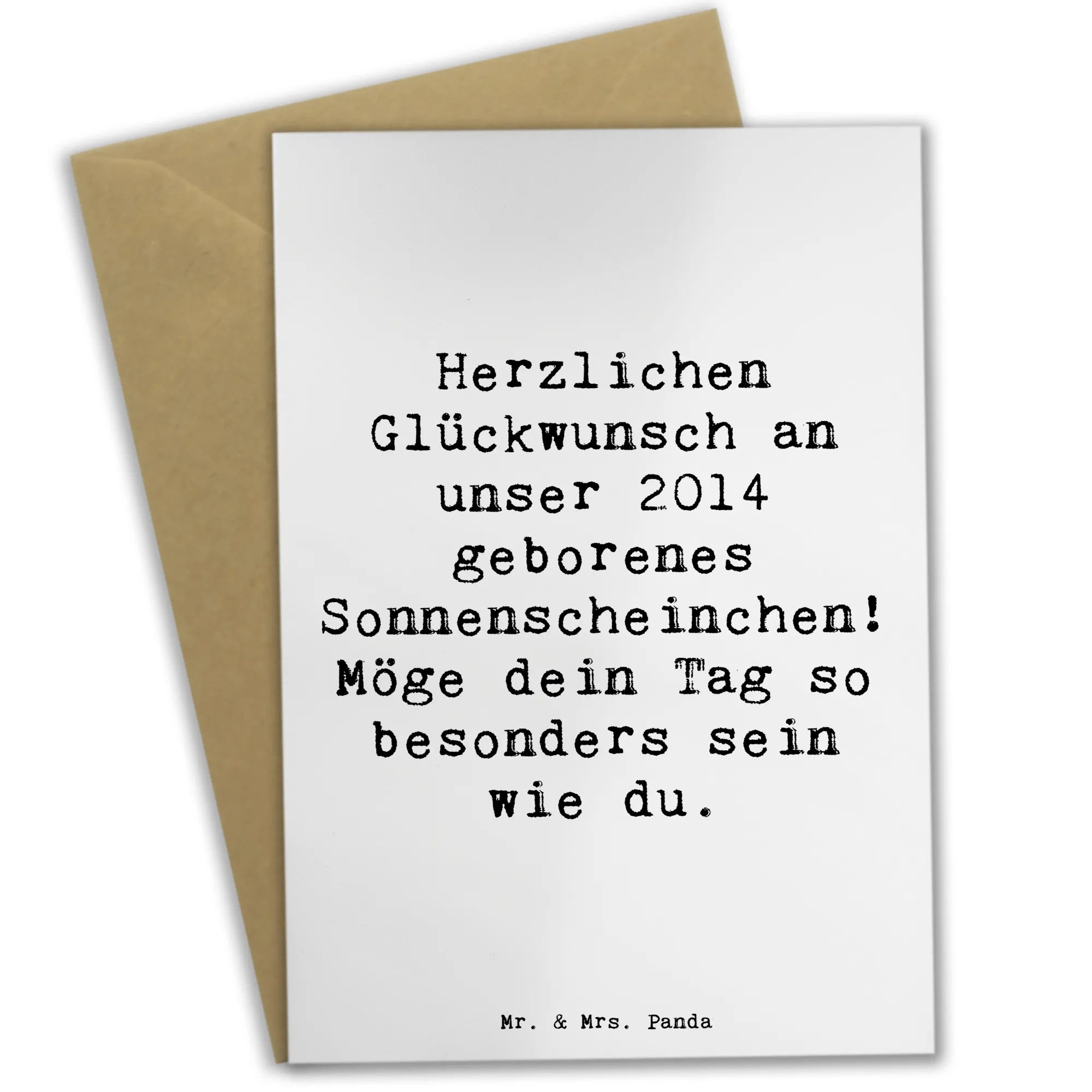 Die Grußkarte "Herzlichen Glückwunsch an unser 2014 geborenes Sonnenscheinchen! Möge dein Tag so besonders sein wie du." aus der Geburtstag Geburtsjahr-Kollektion von Mr. & Mrs. Panda ist das perfekte Geschenk für alle Jubilaren, die im Jahr 2014 geboren wurden. Egal, ob du eine Geburtstagsfeier planst oder einfach nur einem besonderen Menschen eine Freude bereiten willst, diese Karte wird garantiert für lächelnde Gesichter sorgen.