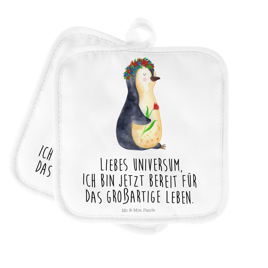 Diese beiden wunderschönen Topflappen sind nicht nur ein echter Hingucker, sondern auch äußerst praktisch in der Küche. Sie sind hochwertig bedruckt mit einem bezaubernden Motiv, das einen fröhlichen Pinguin mit einem Blumenkranz zeigt. Mit dem Slogan 'Liebes Universum, ich bin jetzt bereit für das großartige Leben.' inspirieren sie dich und deine Liebsten, das Leben in vollen Zügen zu genießen!
