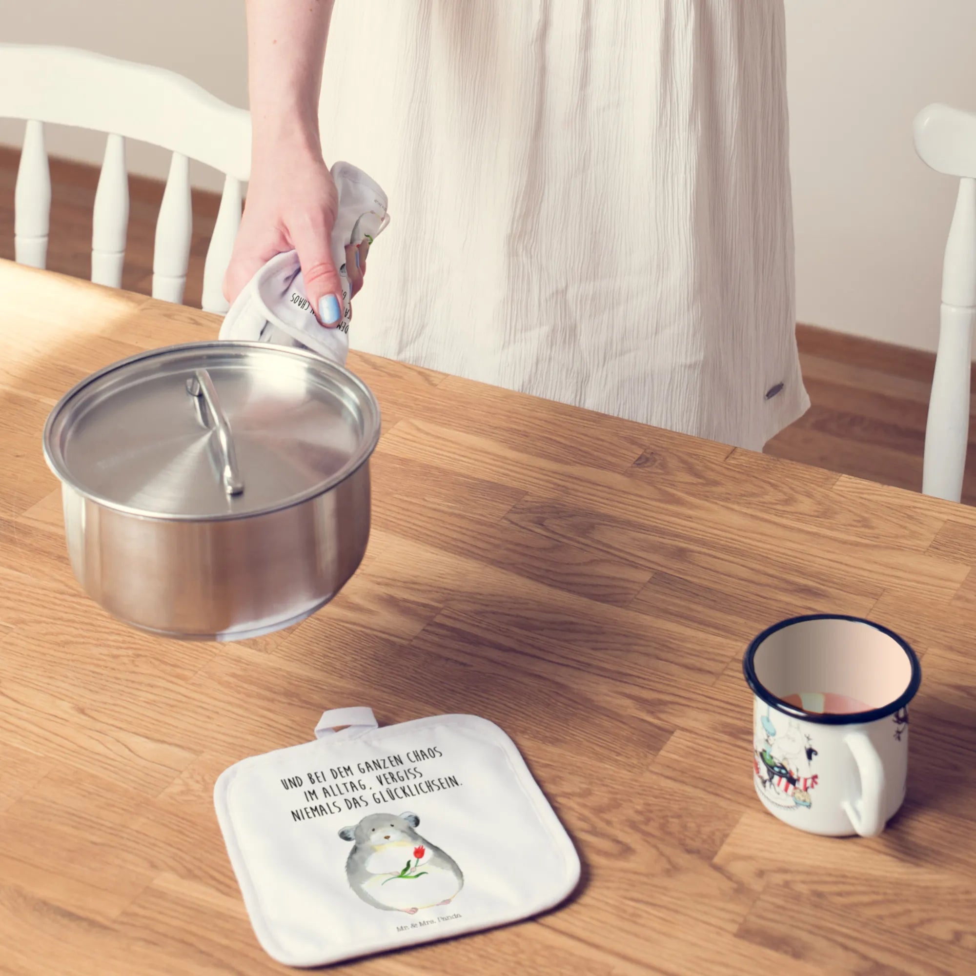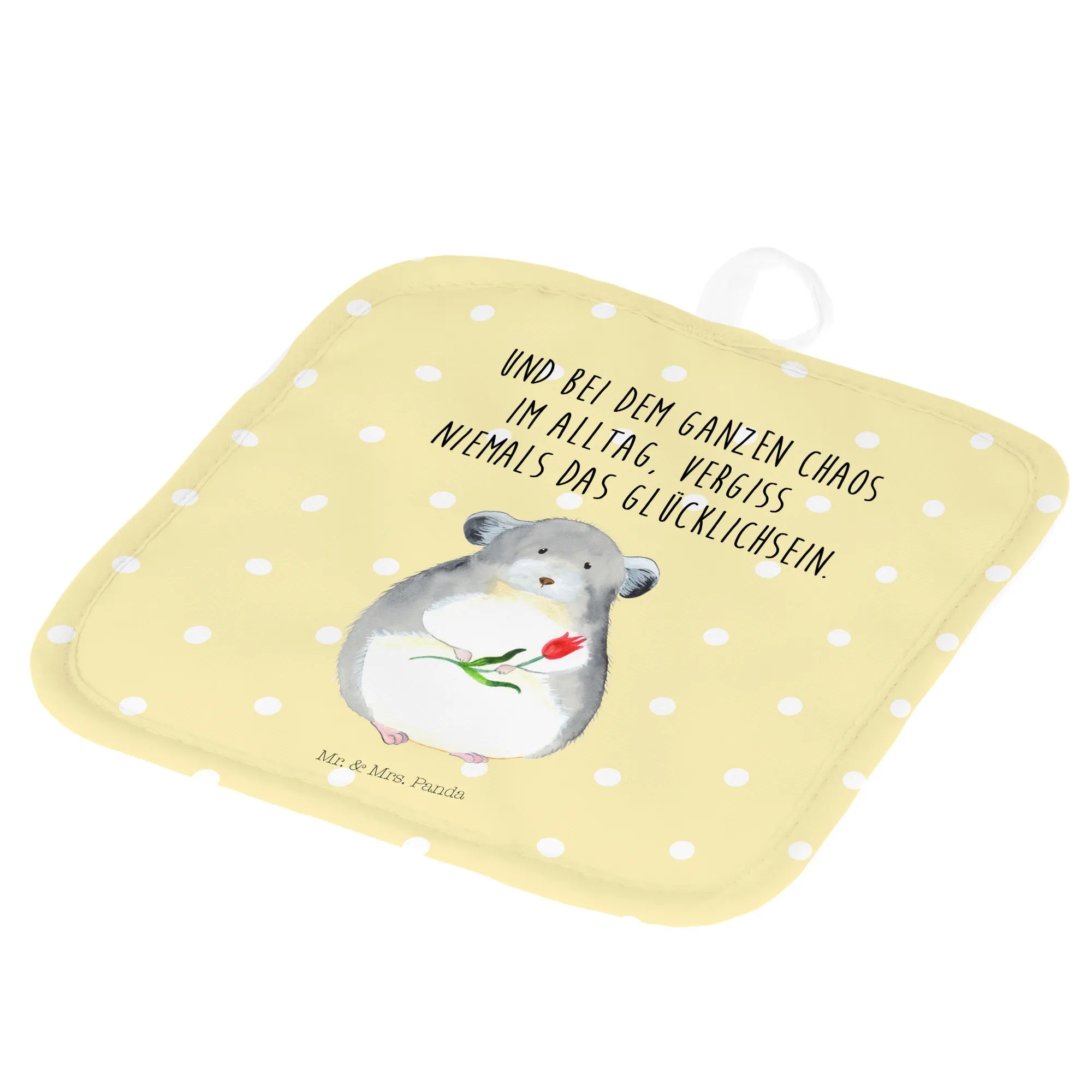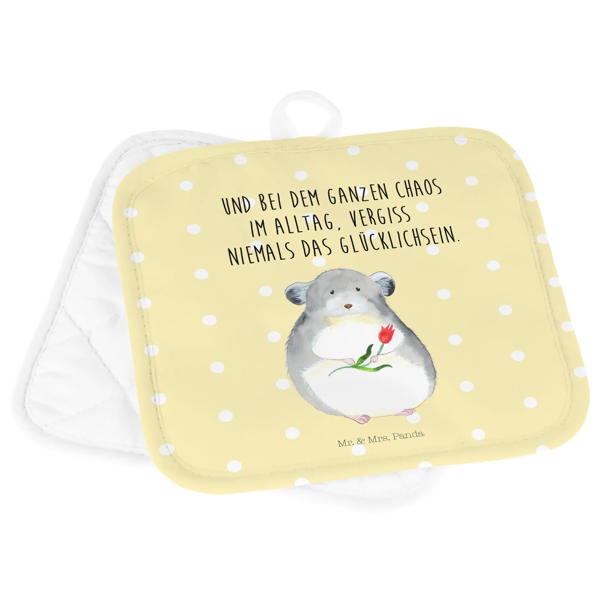 Verschenke ein Lächeln in der Küche! Unser 2er Set Topflappen „Chinchilla mit Blume" aus der Small World Kollektion von Mr. & Mrs. Panda verbindet praktische Funktion mit zauberhafter Optik. Das süße Chinchilla-Motiv hält eine Blume und wird von dem liebevollen Spruch begleitet: „Und bei dem ganzen Chaos im Alltag, vergiss niemals das Glücklichsein." 🌸