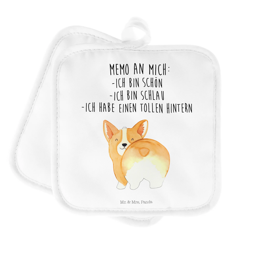 Du suchst nach dem perfekten Geschenk für einen Hundeliebhaber? Unsere zwei wunderschönen Topflappen mit dem niedlichen Corgie Po aus der Hunde Kollektion von Mr. & Mrs. Panda sind genau das Richtige für dich! Diese Topflappen bringen nicht nur Farbe in deine Küche, sie bringen auch ein riesiges Lächeln auf dein Gesicht. Dank des lustigen Spruchs "Memo an mich: ich bin schön, ich bin schlau, ich habe einen tollen Hintern" wird jeder Kochmoment zu einem echten Highlight.