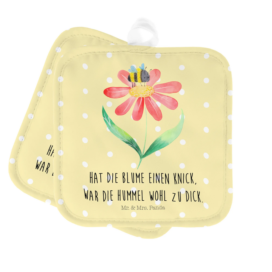 Entdecke die bezaubernden 2er Set Topflappen mit dem süßen Motiv Hummel Blume aus der beliebten Small World Kollektion von Mr. & Mrs. Panda! Diese zwei wunderschönen Topflappen sind mehr als nur ein praktisches Küchenaccessoire – sie bringen gute Laune und ein Stück Natur in dein Zuhause! Mit ihrer einzigartigen, handgezeichneten Hummel, die auf einer bunten Blüte landet, zaubern sie jedem ein Lächeln ins Gesicht. Der witzige Spruch „Hat die Blume einen Knick, war die Hummel wohl zu dick“ sorgt für Schmunzeln und ist das perfekte Gesprächsthema bei jeder Koch- oder Grillparty.