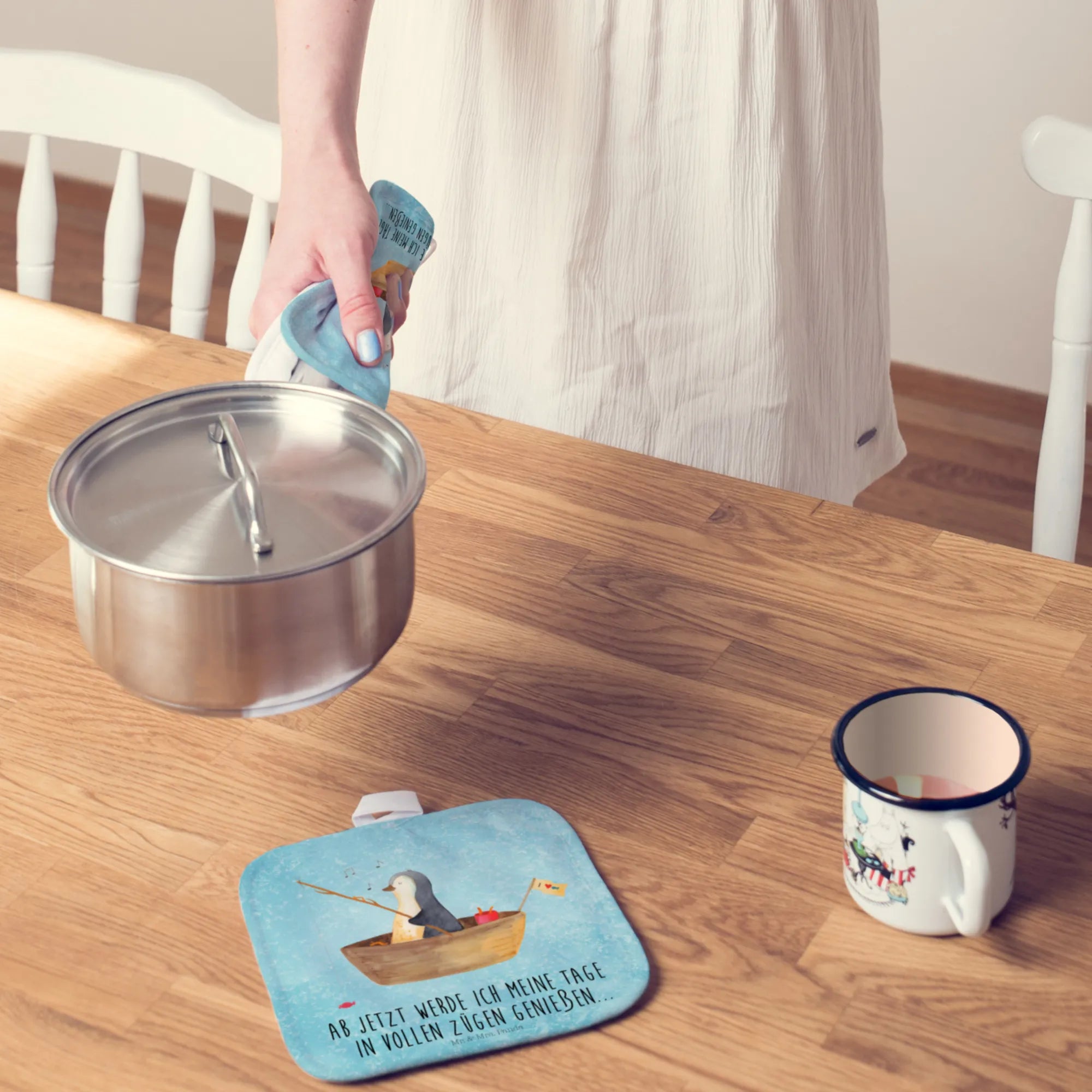 Freue Dich auf das exklusive Topflappen Set von Mr. & Mrs. Panda, das mit Liebe und Sorgfalt für Deine Küche entworfen wurde. Diese Topflappen messen jeweils 170 mm x 170 mm und besitzen eine ideale Dicke von 5 mm, womit sie hervorragend vor Hitze isolieren. Gefertigt aus 100% Polyester, zeichnen sie sich durch ihre besondere Strapazierfähigkeit und die leichte Reinigungsmöglichkeit bei 30°C aus. Die einzigartigen Druckmotive und Sprüche auf jedem Topflappen spiegeln den unverwechselbaren Charme und die Kreativität von Mr. & Mrs. Panda wider. Dank der praktischen Aufhängeschlaufen lassen sie sich spielend leicht in jeder Küche integrieren. Egal ob als stilvoller Topfuntersetzer oder als praktischer Ofenhandschuh genutzt – dieses Set ist ein absolutes Must-have für jede küchenliebende Person, die Wert auf Design und Funktionalität legt.