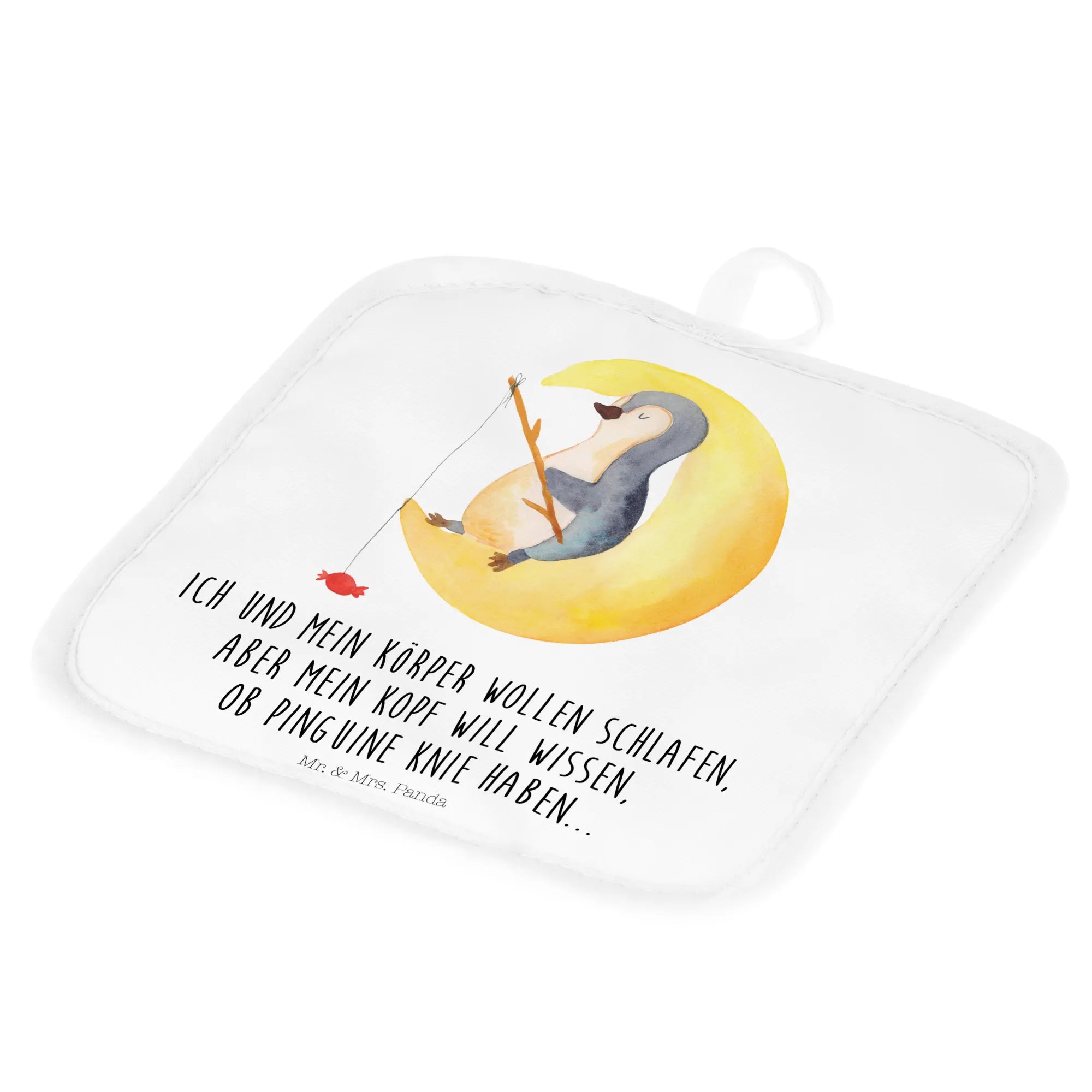 Mit einem Maß von 170 mm x 170 mm und einer Dicke von 5 mm bieten sie die optimale Isolation gegen Hitze und sind ideal für alle Kochabenteuer. Das süße Motiv zeigt einen Pinguin, der es sich auf einer Mondsichel gemütlich gemacht hat und mit einer Angel nach Sternen angelt – ein absoluter Lieblingsmoment für alle Pinguin-Fans! Und die dazugehörige Spruch "Ich und mein Körper wollen schlafen, aber mein Kopf will wissen, ob Pinguine Knie haben..." bringt nicht nur ein Lächeln ins Gesicht, sondern auch ein bisschen Humor in die alltäglichen Küchenarbeiten.