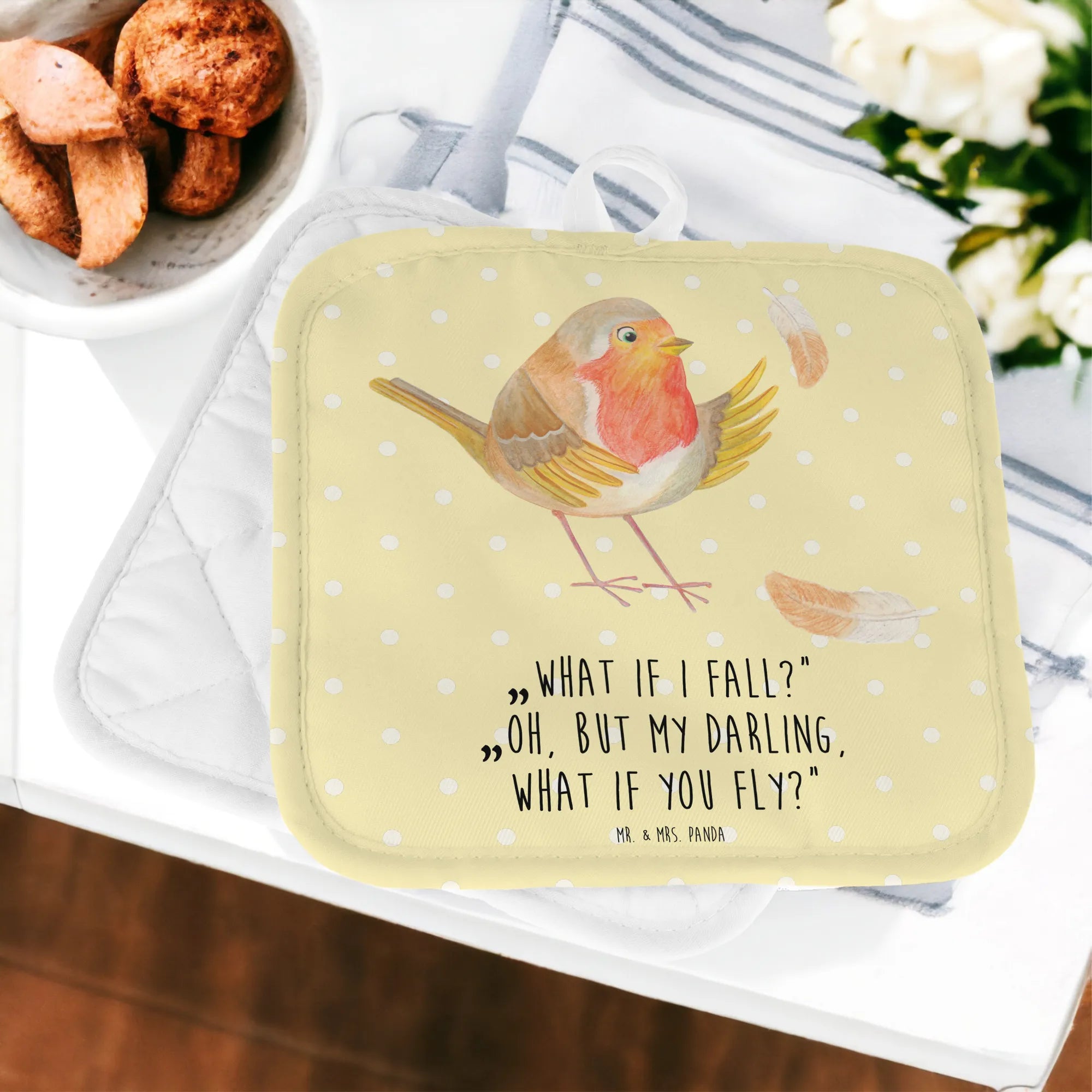 Zwei bezaubernde Topflappen im 2er Set – liebevoll gestaltet von Mr. & Mrs. Panda aus der Small World Kollektion. Das niedliche Rotkehlchen mit bunten Federn wirkt wie ein kleiner Glücksbringer in deiner Küche und verströmt Ruhe und Zuversicht. Das Motiv erinnert daran, dem Herzen zu folgen und mutig zu sein: „What if I fall? Oh, but my darling, what if you fly?“ ✨