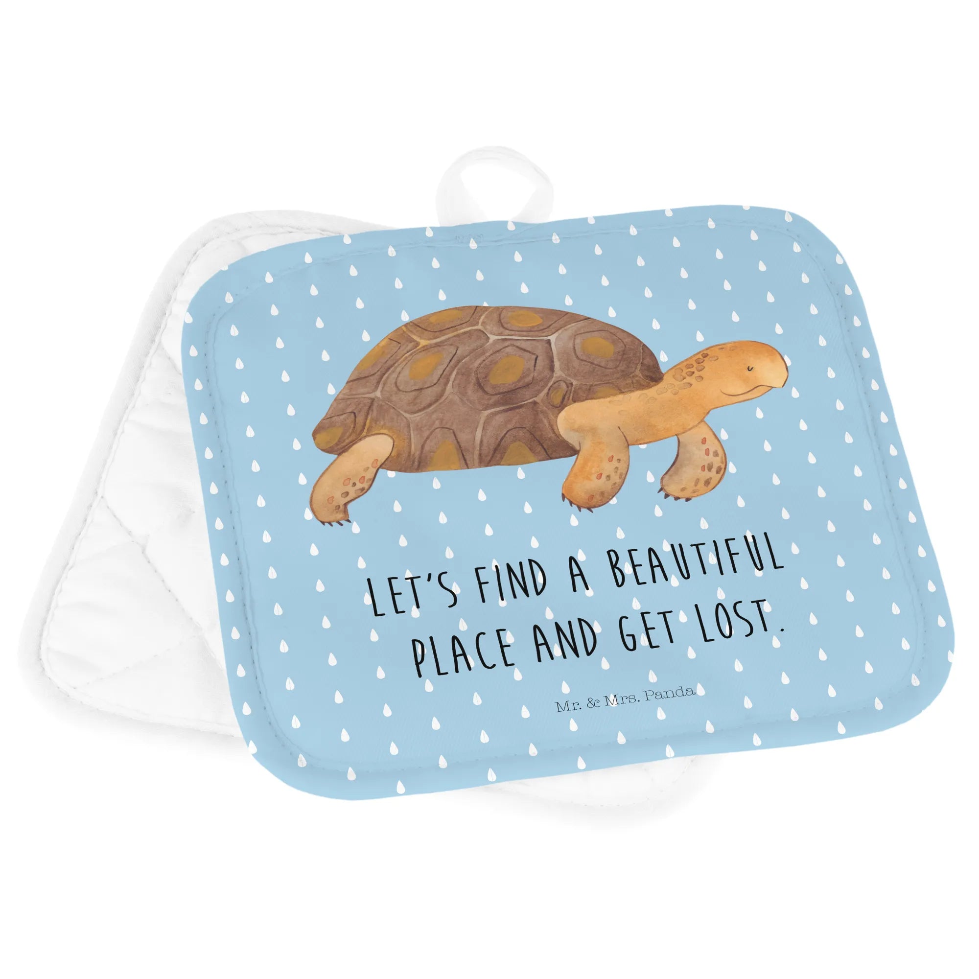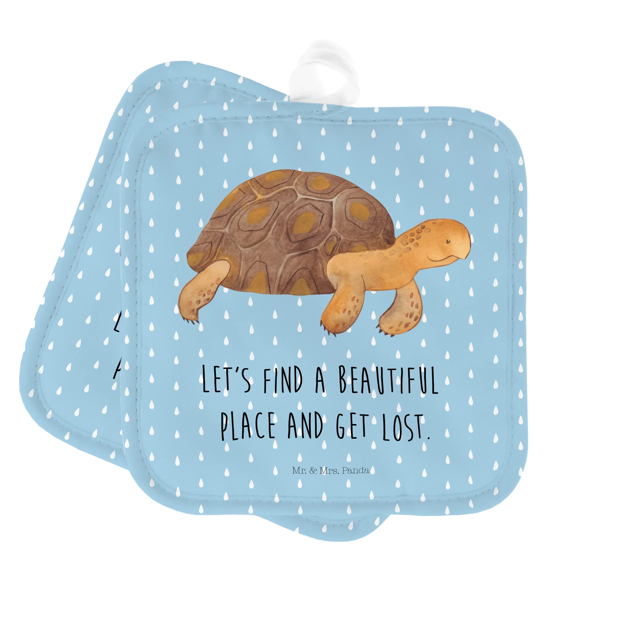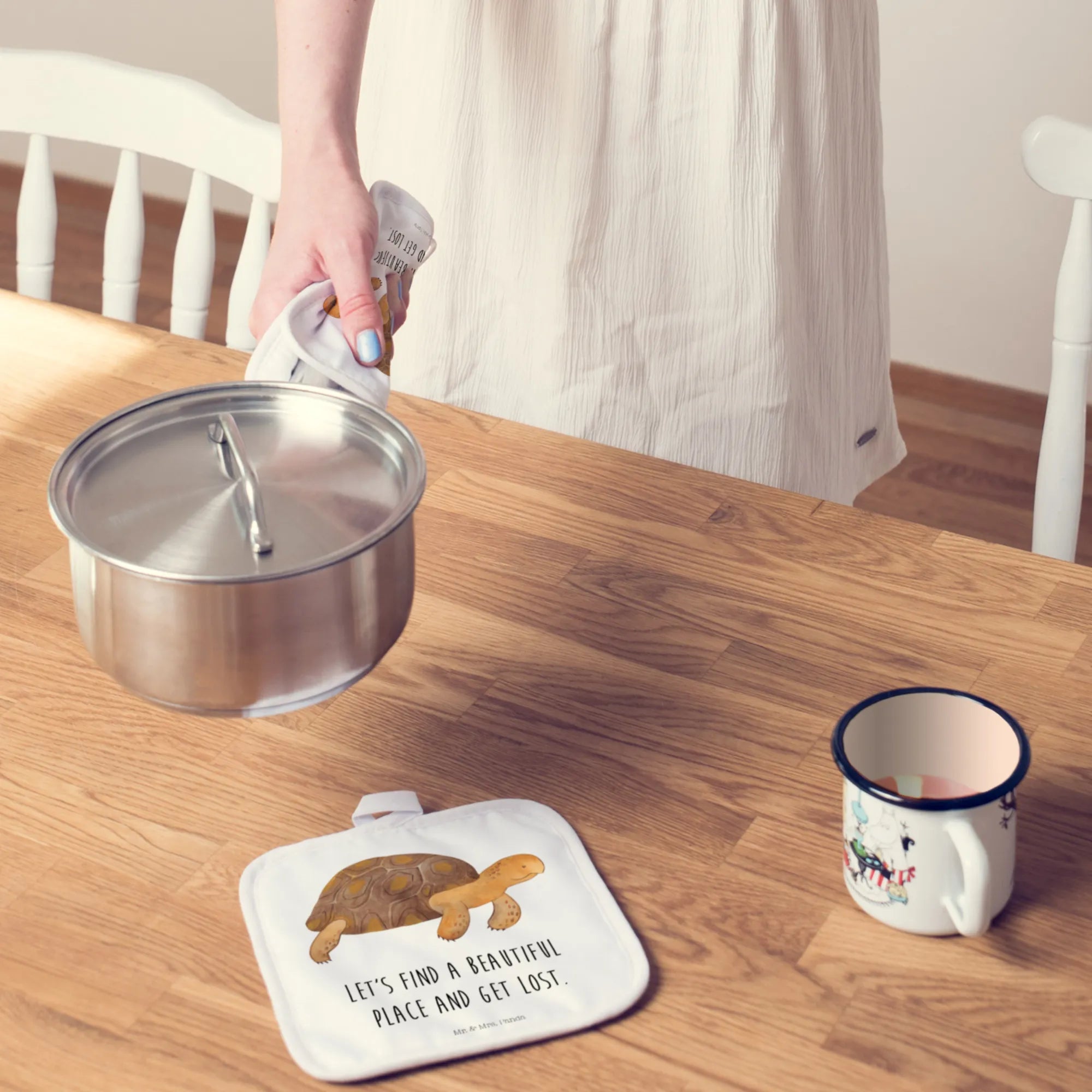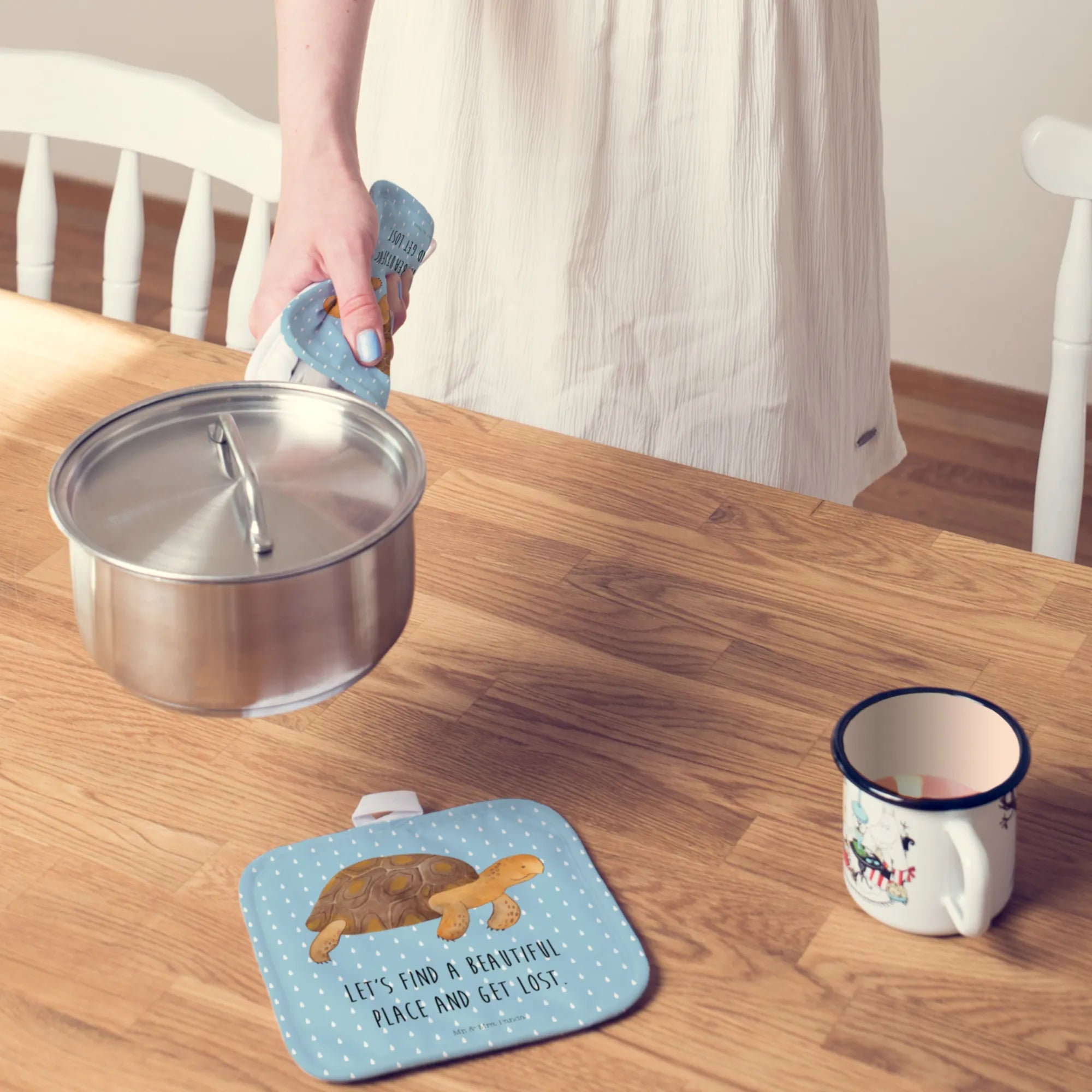 Bringe Meereszauber in Deine Küche mit unseren liebevoll gestalteten Topflappen von Mr. & Mrs. Panda. Die entspannte Schildkröte auf pastellblauem Hintergrund und der inspirierende Spruch „Let's find a beautiful place and get lost.“ erinnern Dich daran, das Leben auch mal langsam und genussvoll anzugehen. 🐢🌊
