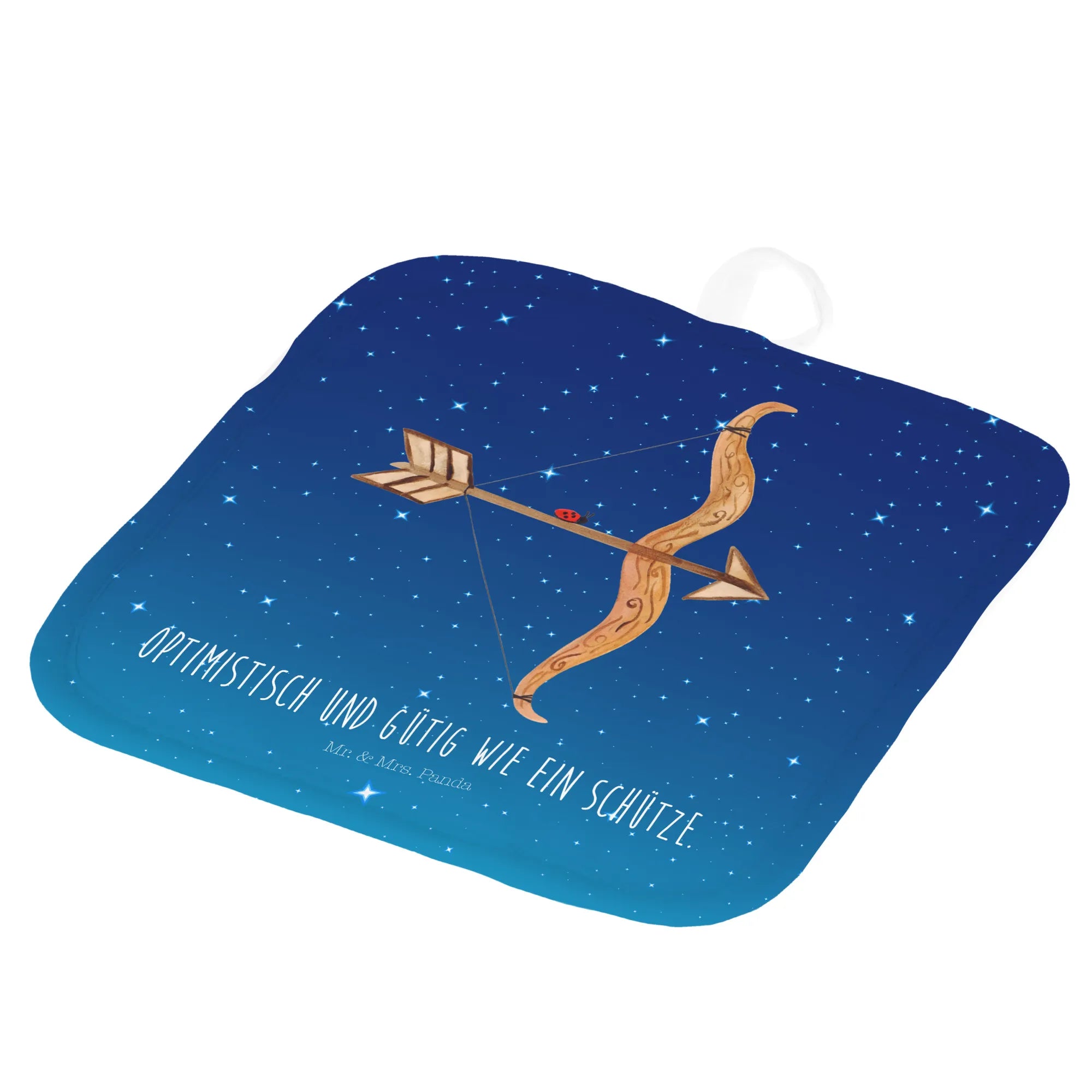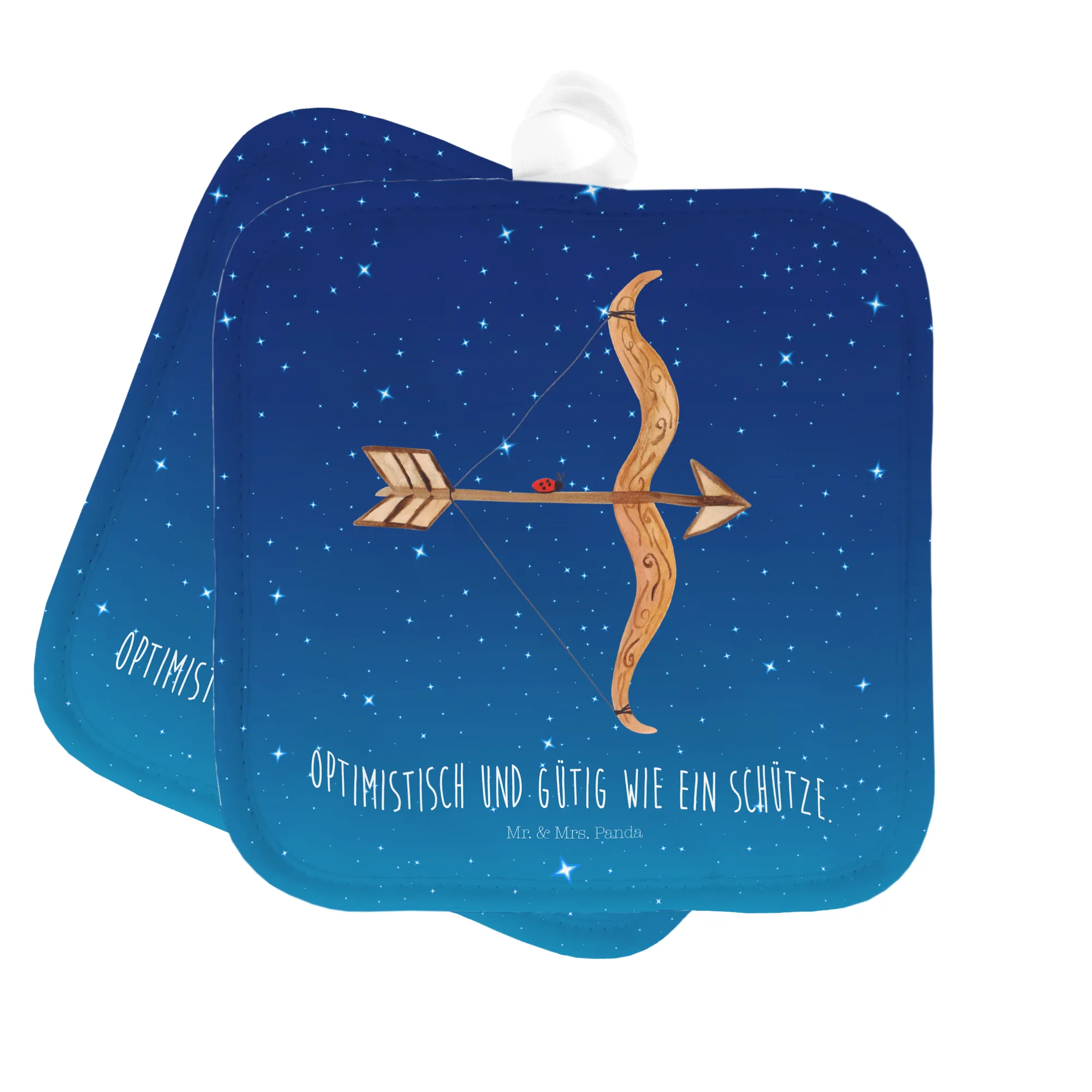 Entdecke die zauberhaften 2er Set Topflappen mit dem Motif "Sternzeichen Schütze" von Mr. & Mrs. Panda! Diese zwei wunderschönen Topflappen sind nicht nur praktische Küchenbegleiter, sondern auch der perfekte Weg, um ein Stück Persönlichkeit in Deine Küche zu bringen. Mit dem liebevoll handgezeichneten Motiv und dem charmanten Spruch "Optimistisch und gütig wie ein Schütze" bringen sie Freude und Farbe in deinen Kochalltag. Das Sternzeichen Schütze zeugt von Optimismus und Güte und verhindert, dass Du beim Kochen ins Schwitzen gerätst!