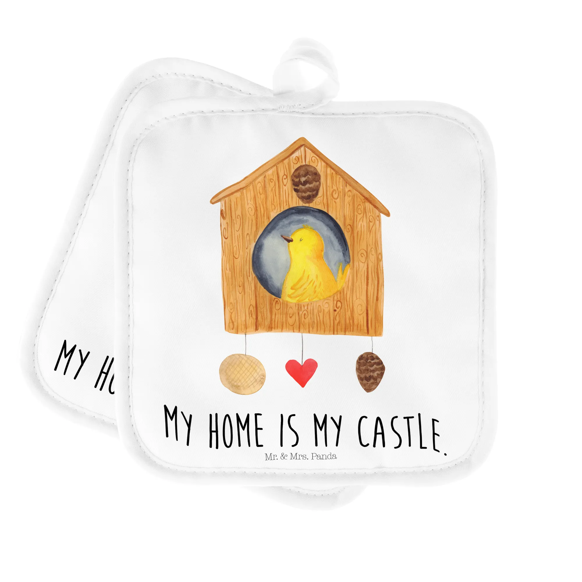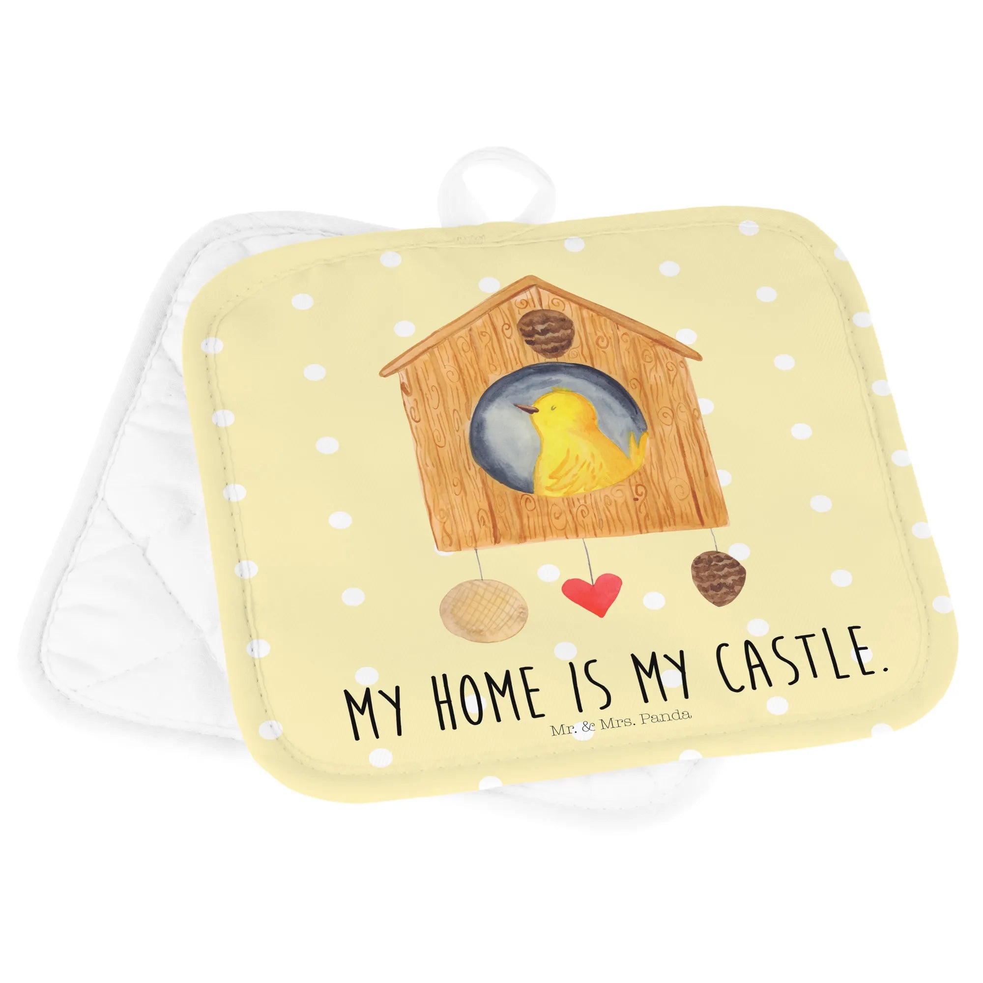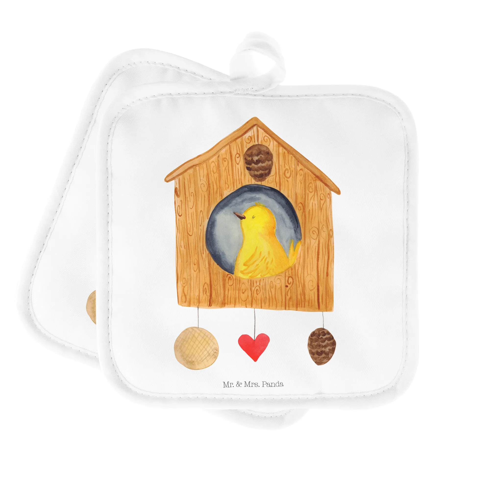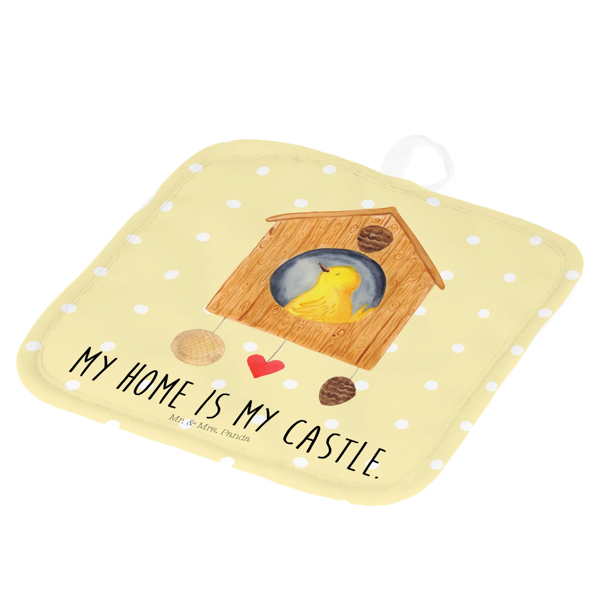 2er Set Topflappen Vogel Haus - mit Spruch - Gelb Pastell