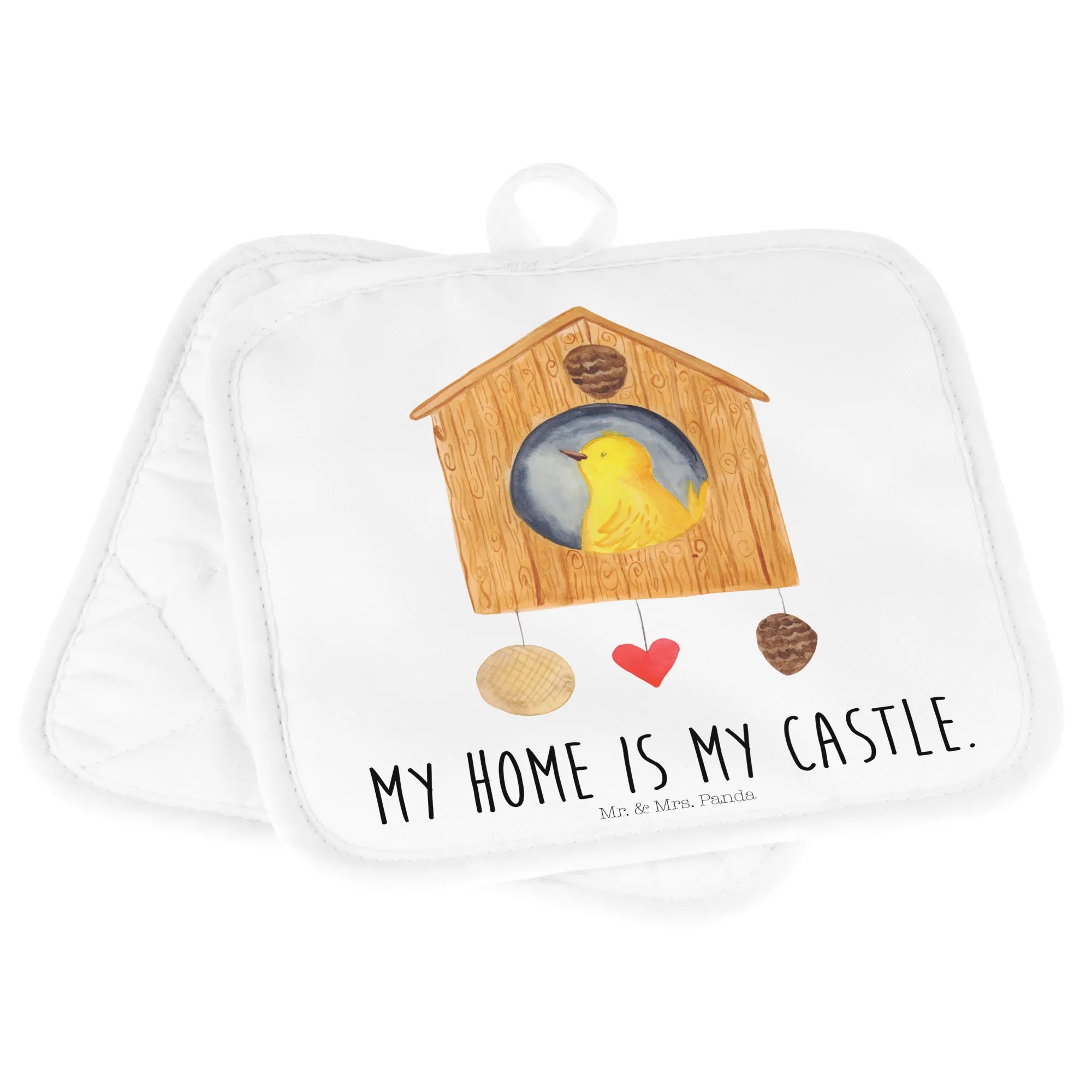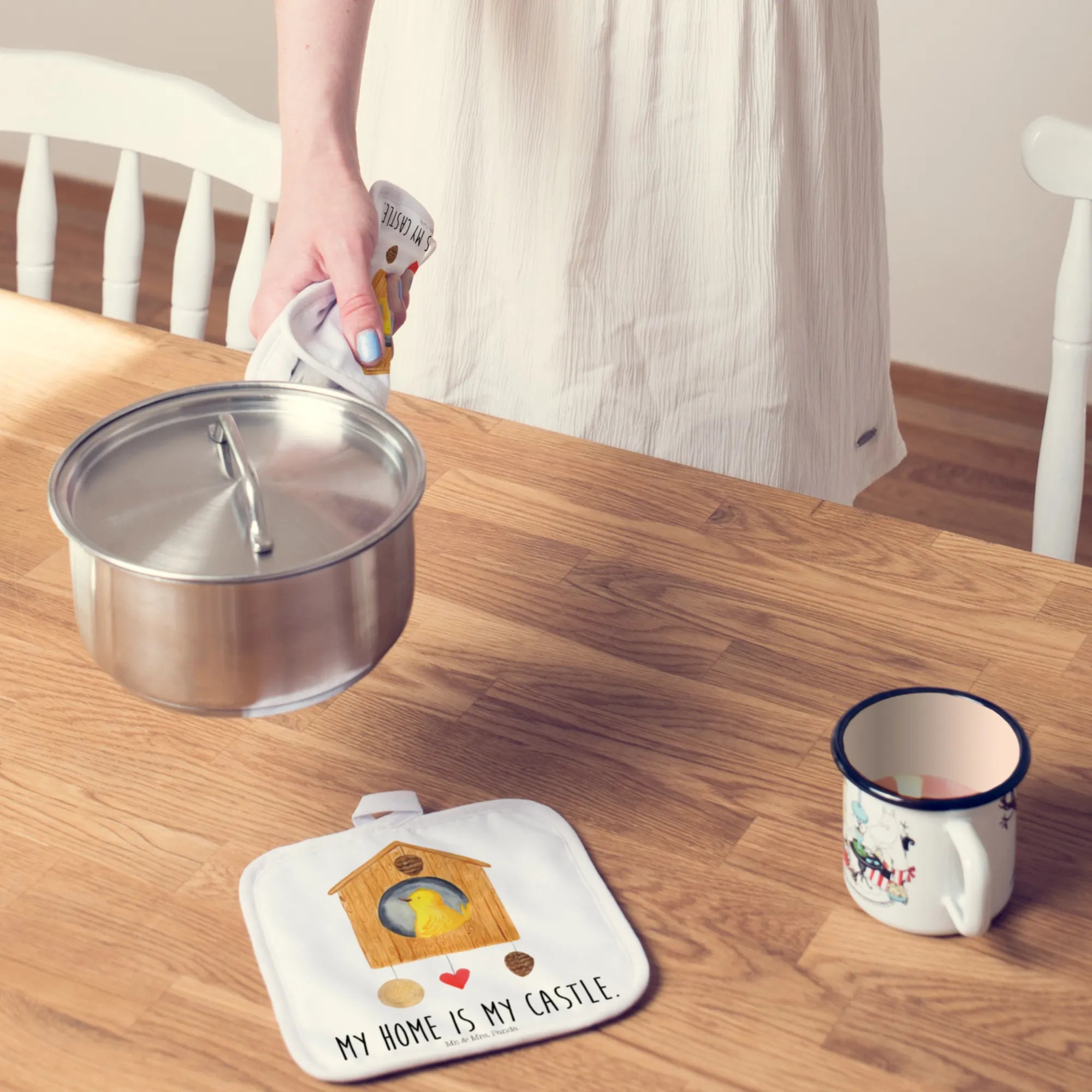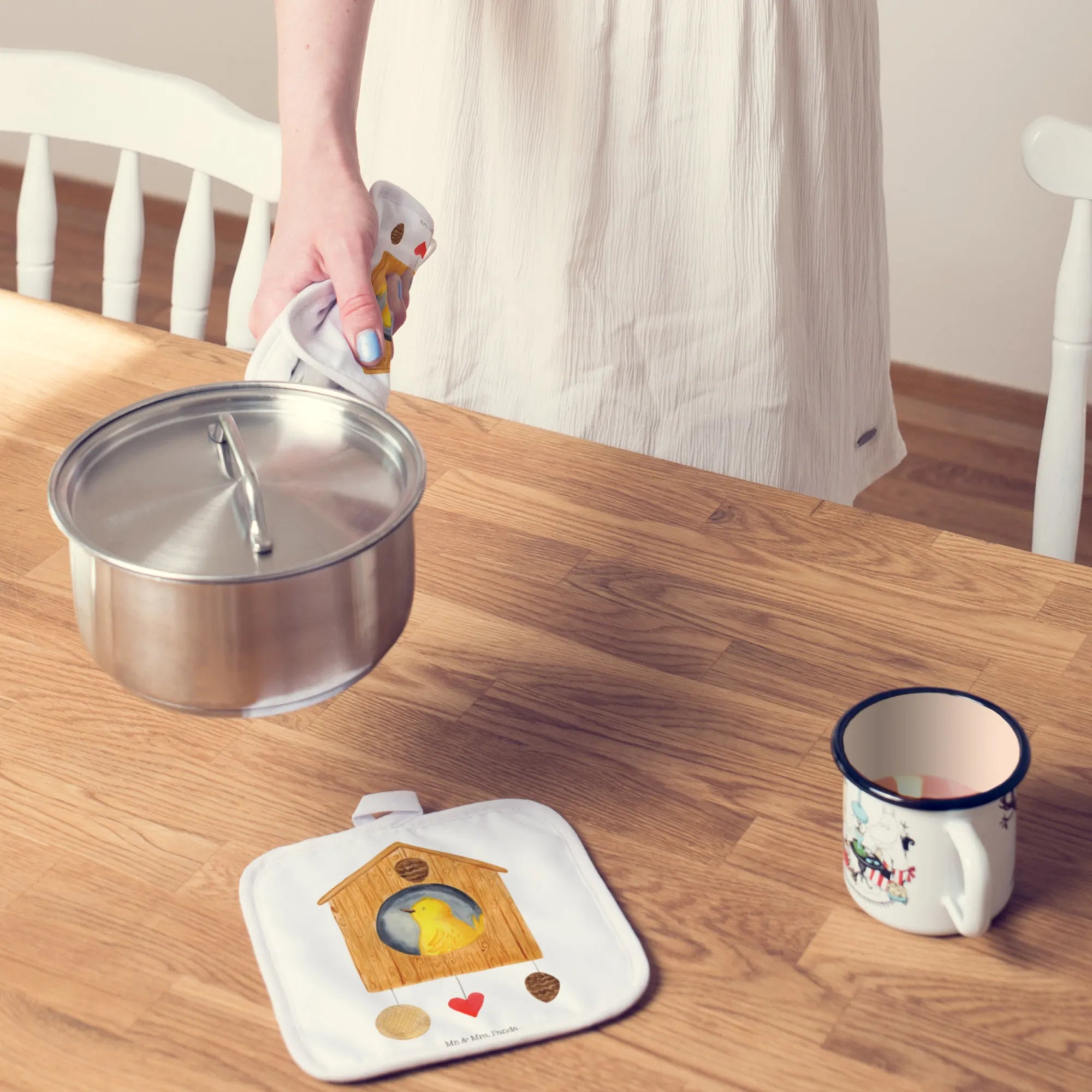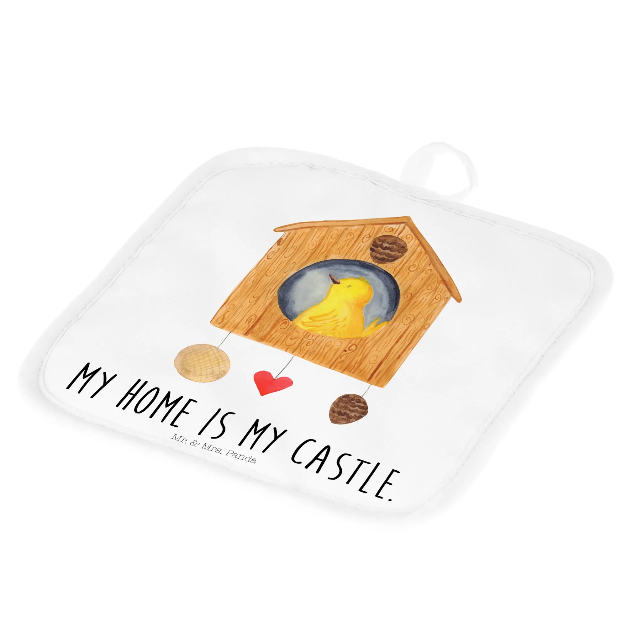 2er Set Topflappen Vogel Haus - mit Spruch - Gelb Pastell
