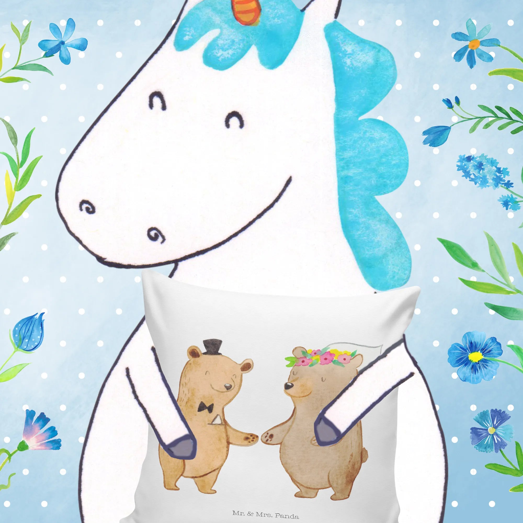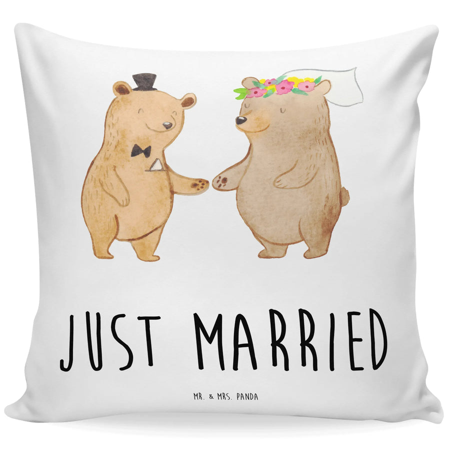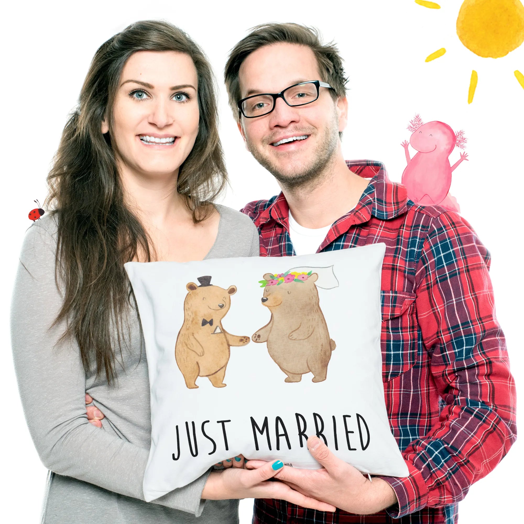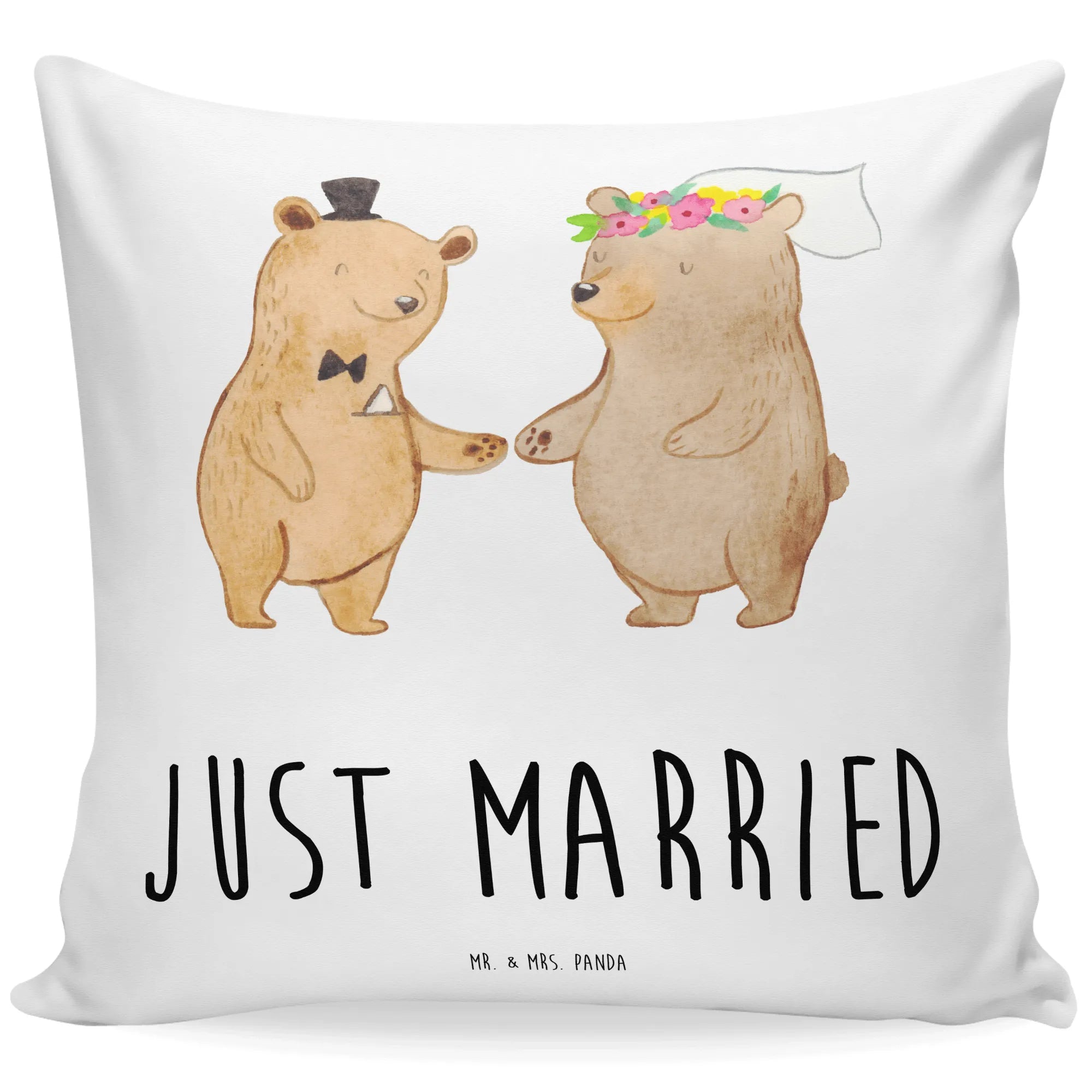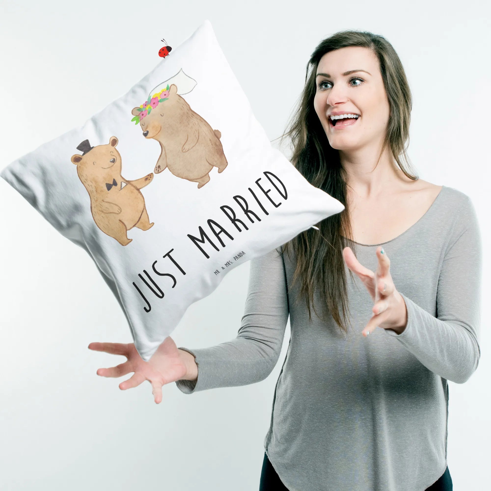 Das wunderschöne 40x40 Kissen mit dem Motiv der Bären Heirat von Mr. & Mrs. Panda ist das perfekte Geschenk für frisch verheiratete Paare oder zur Feier eines Hochzeitstags. Dieses liebevoll gestaltete Kissen bringt nicht nur Gemütlichkeit in dein Zuhause, sondern auch ein Stück liebevolle Erinnerung an den schönsten Tag im Leben. Die beiden süßen Bären, die sich zärtlich an den Pfoten halten, symbolisieren die Liebe und Verbundenheit, die man sich an einem solchen besonderen Anlass wünscht. Der Bräutigam mit Hut und Fliege und die Braut im Blumenkranz und mit Brautschleier – alles in sanften Aquarellfarben gehalten – machen das Kissen zu einem echten Eyecatcher.