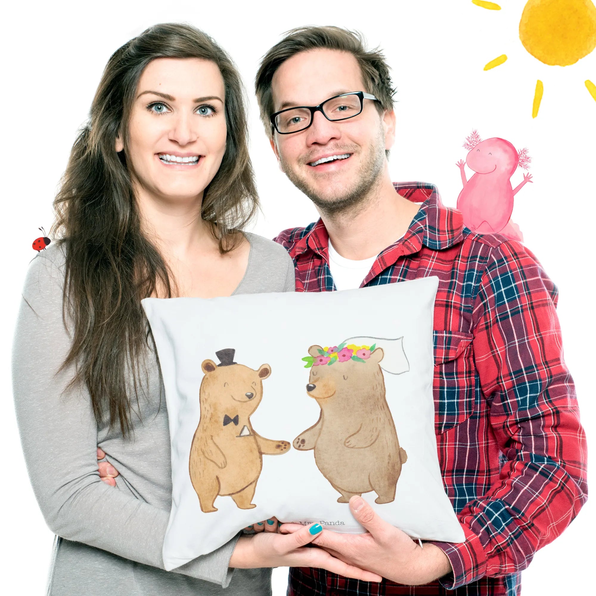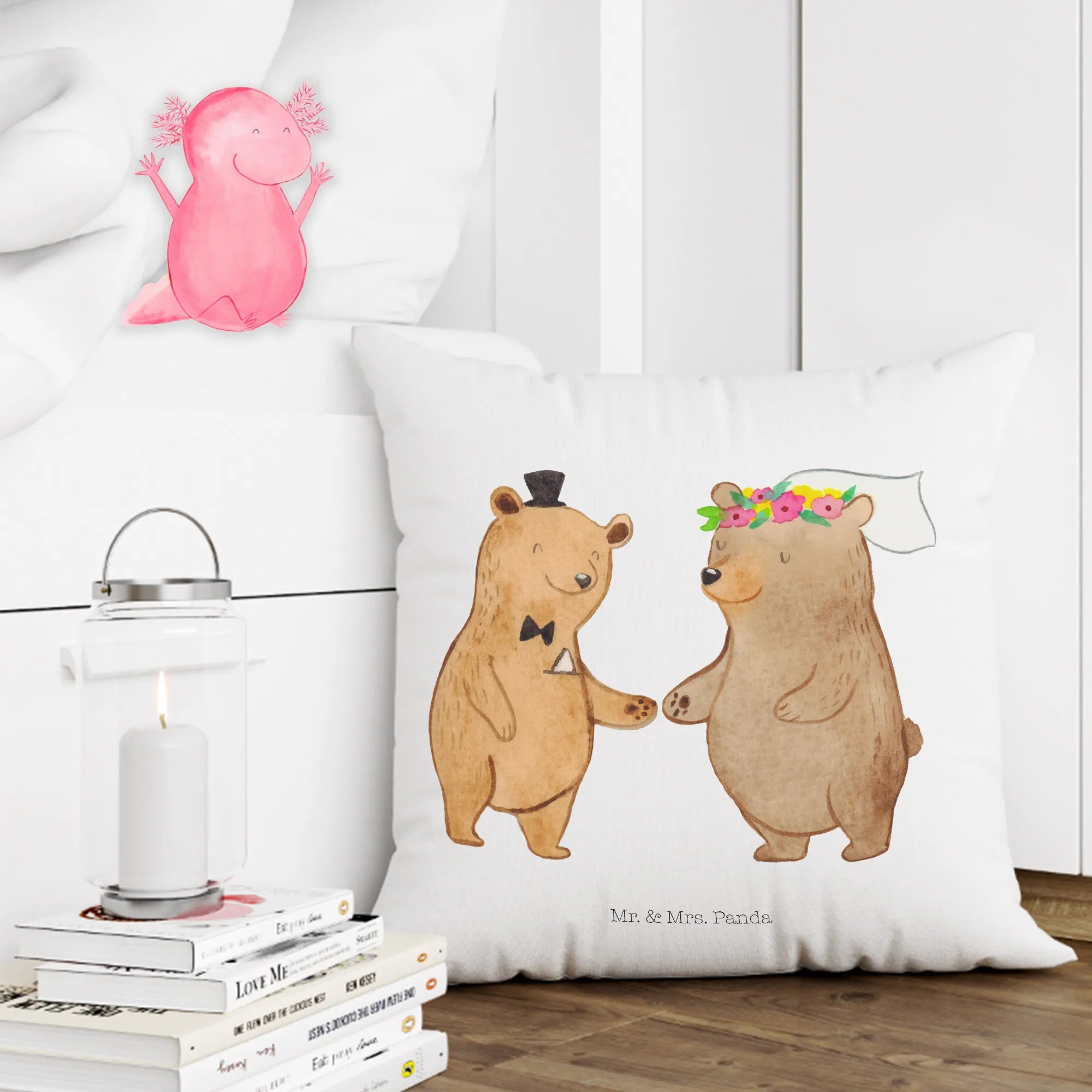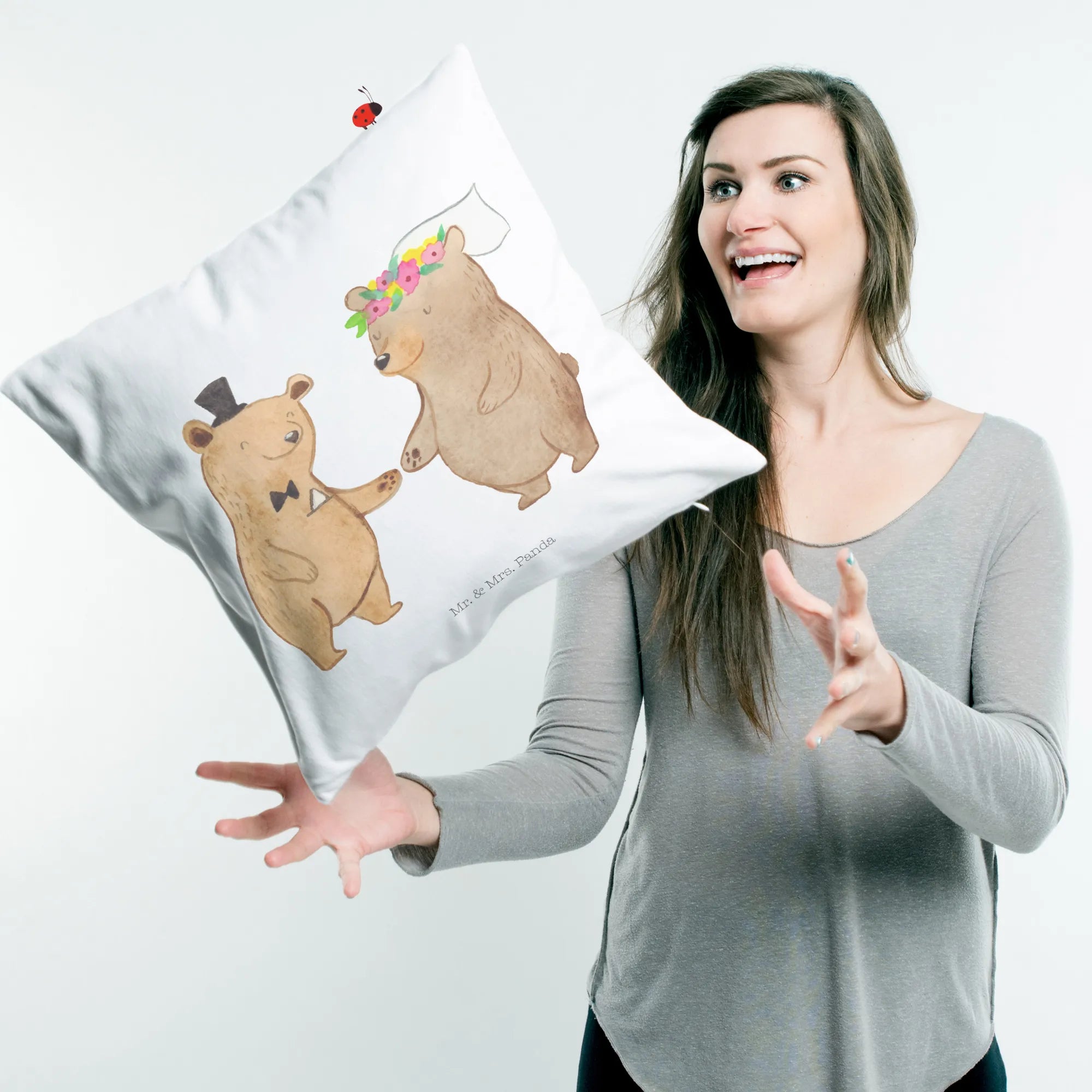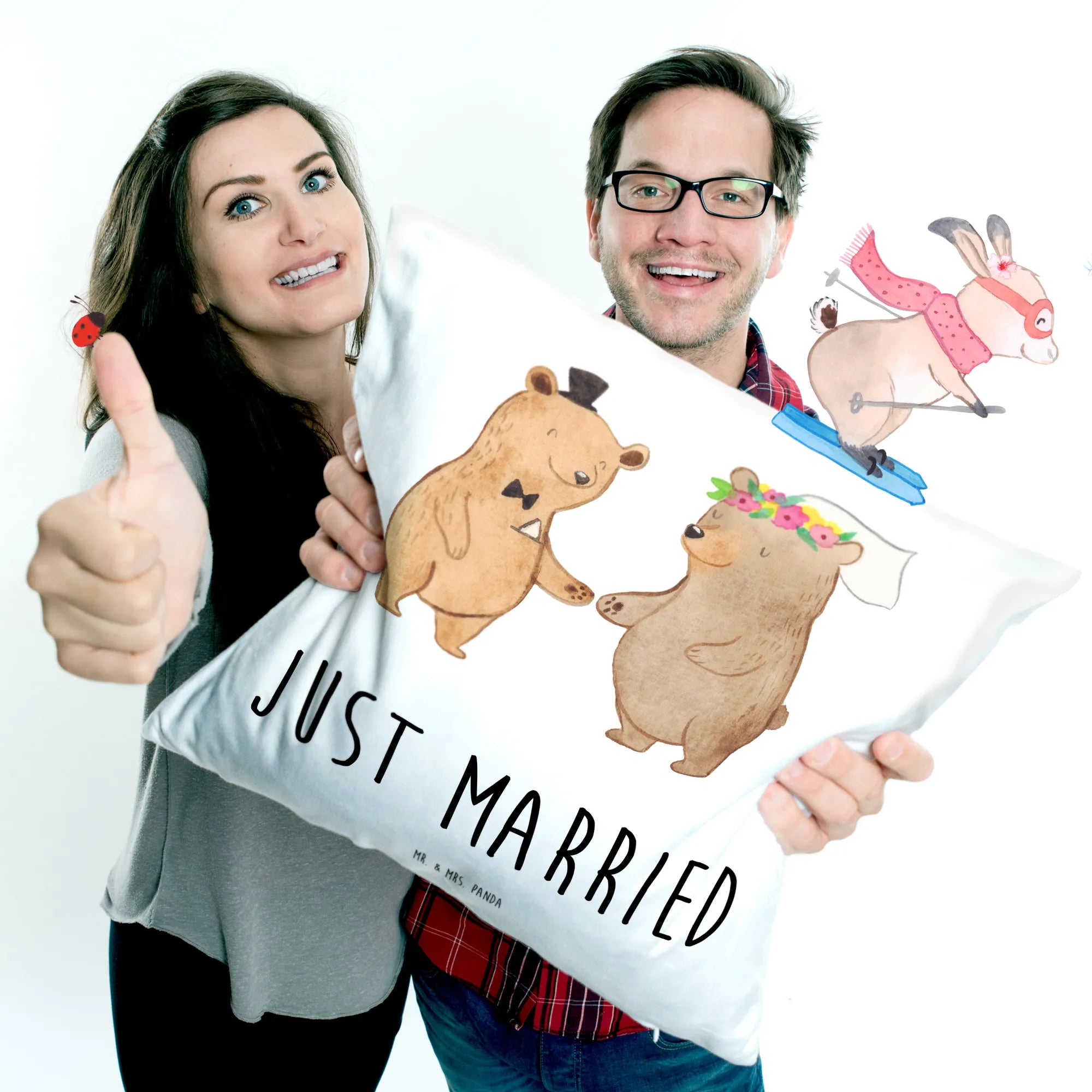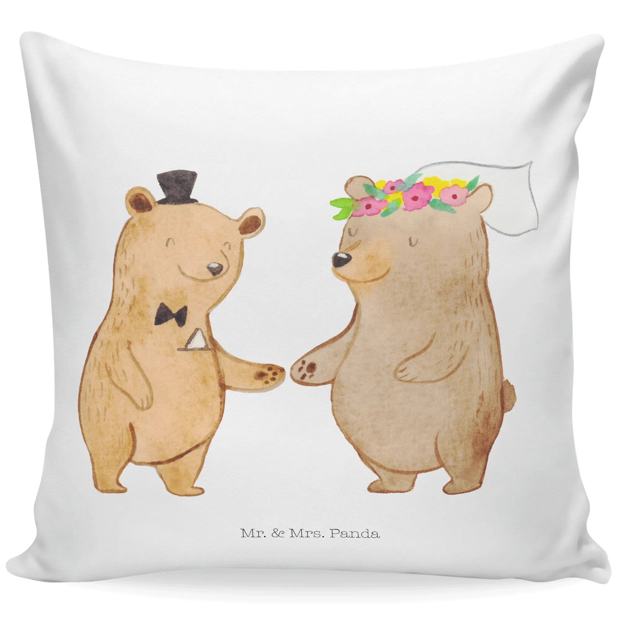 Das 40x40 Kissen mit dem bezaubernden Motiv "Bären Heirat" von Mr. & Mrs. Panda ist das perfekte Geschenk für alle, die Liebe und Romantik im Alltag schätzen. Egal, ob Du ein Hochzeitsgeschenk, ein Trauungsgeschenk oder ein nettes Präsent zur Verlobung suchst, dieses Kissen wird garantiert das Herz des Beschenkten erobern. Die zwei süßen Bären, die sich an den Pfoten halten, symbolisieren eine tiefe Verbindung zueinander und strahlen pure Freude aus. Der Bräutigam, lässig in einem kleinen Hut und mit einer schicke Fliege, und die Braut mit ihrem romantischen Blumenkranz und dem üppigen Schleier sind liebevoll in Aquarell-Malerei eingefangen.