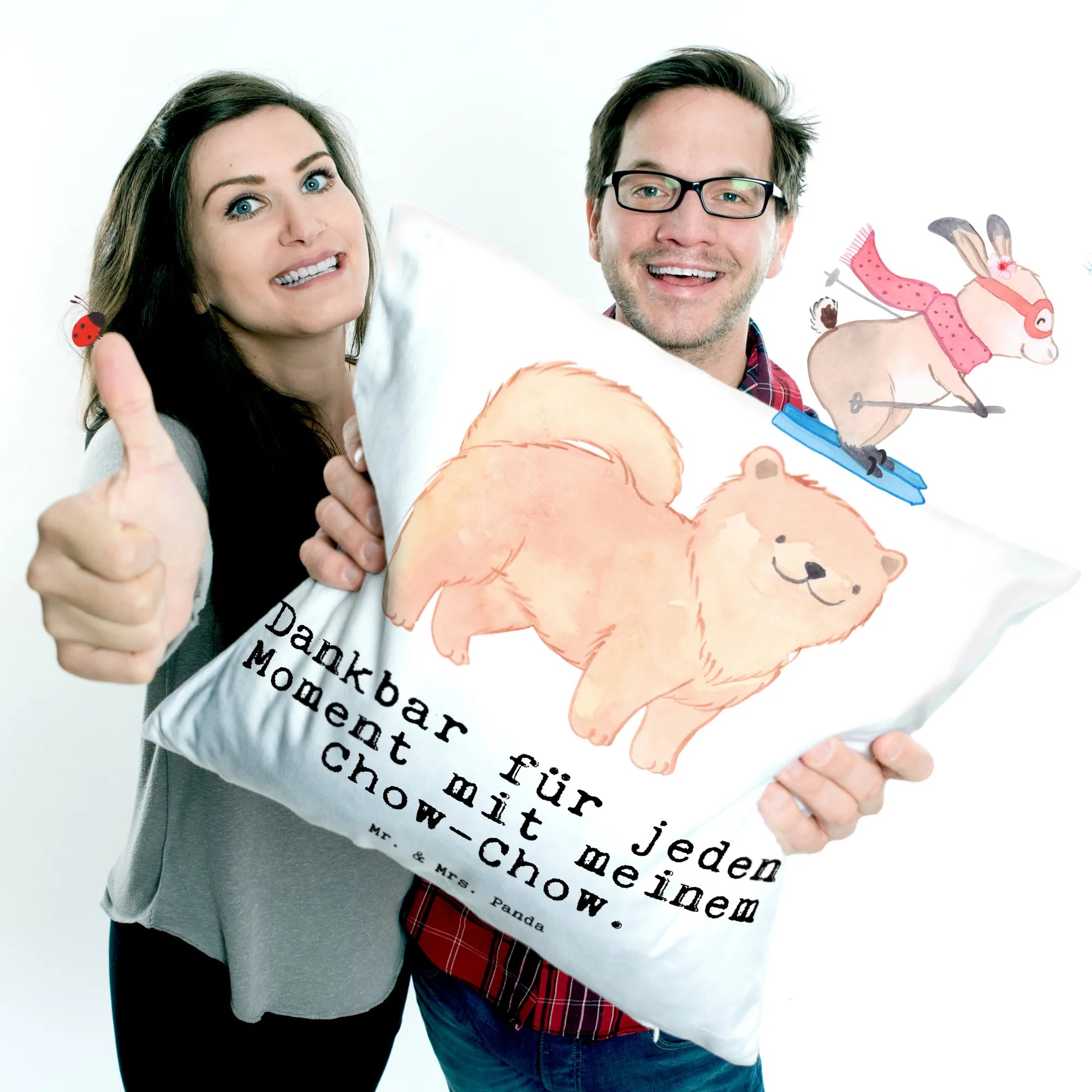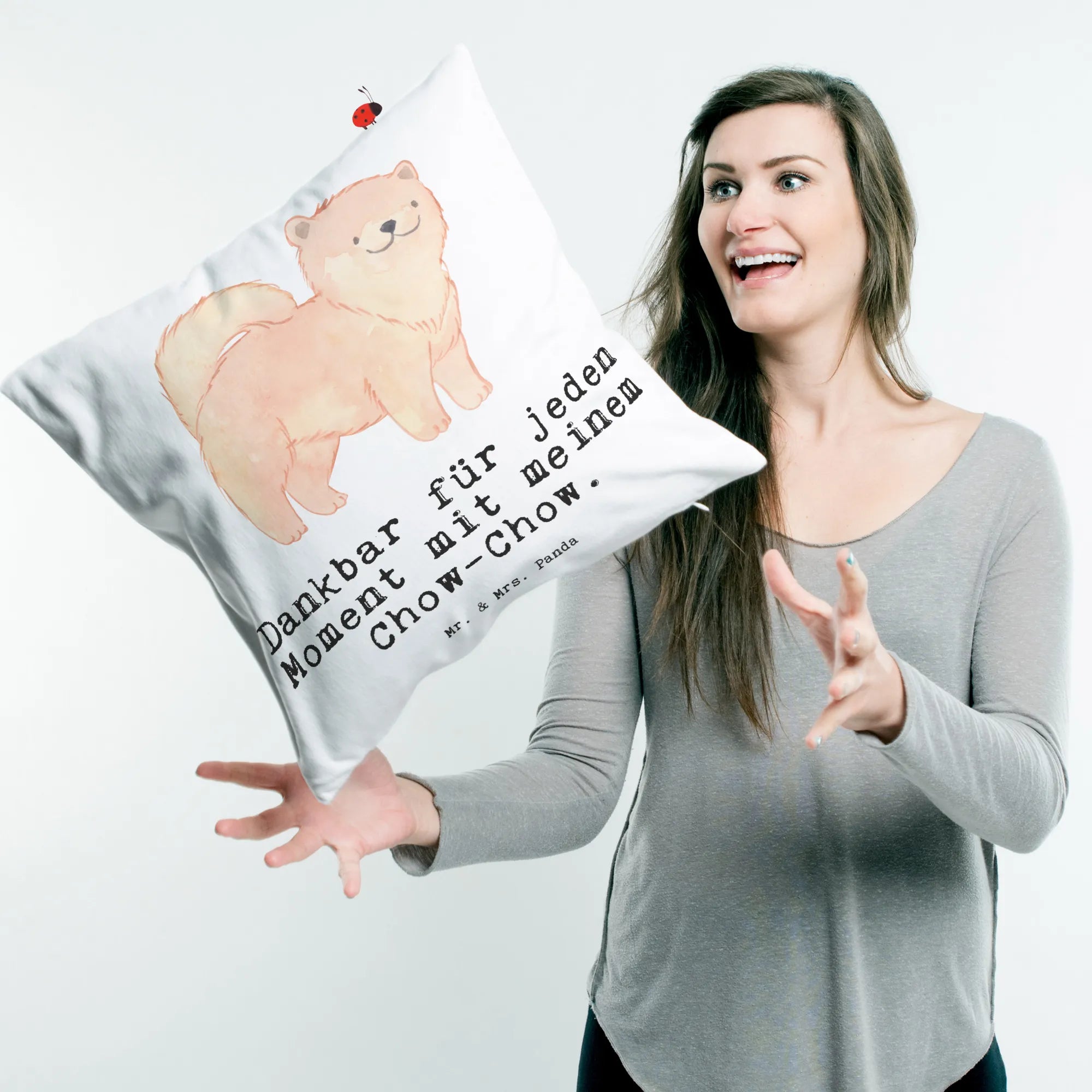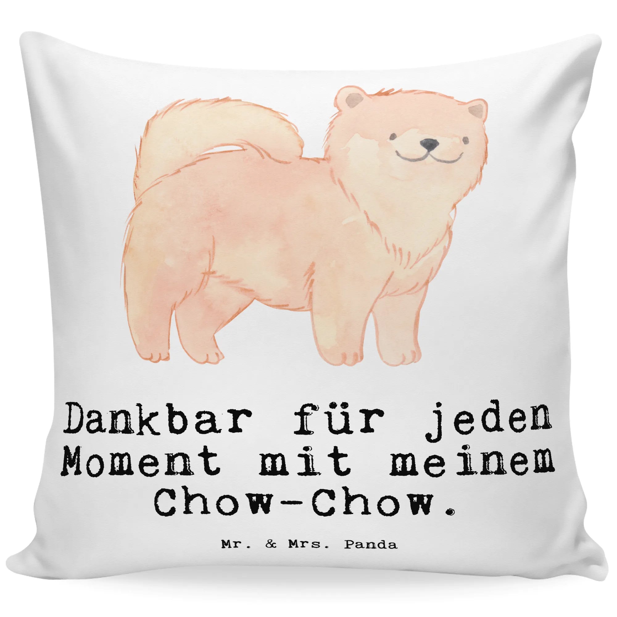 Das perfekte Geschenk für Hundeliebhaber: unser 40x40 Kissen mit dem bezaubernden Motiv 'Chow-Chow Moment' von Mr. & Mrs. Panda! Dieses wunderschöne, kuschelige Kissen aus superflauschiger Mikrofaser verzaubert nicht nur jeden Raum, sondern erzählt auch die liebenswertesten Geschichten über Deinen treuen Vierbeiner. Es ist mit einem strahlenden, handgezeichneten Chow-Chow versehen, der in warmen, sanften Farben strahlt. Ein Hund, der entspannt lächelt – das ist die pure Freude, die dieses Kissen ausstrahlt! Der Slogan 'Dankbar für jeden Moment mit meinem Chow-Chow' bringt es auf den Punkt und lässt das Herz eines jeden Hundebesitzers höher schlagen.