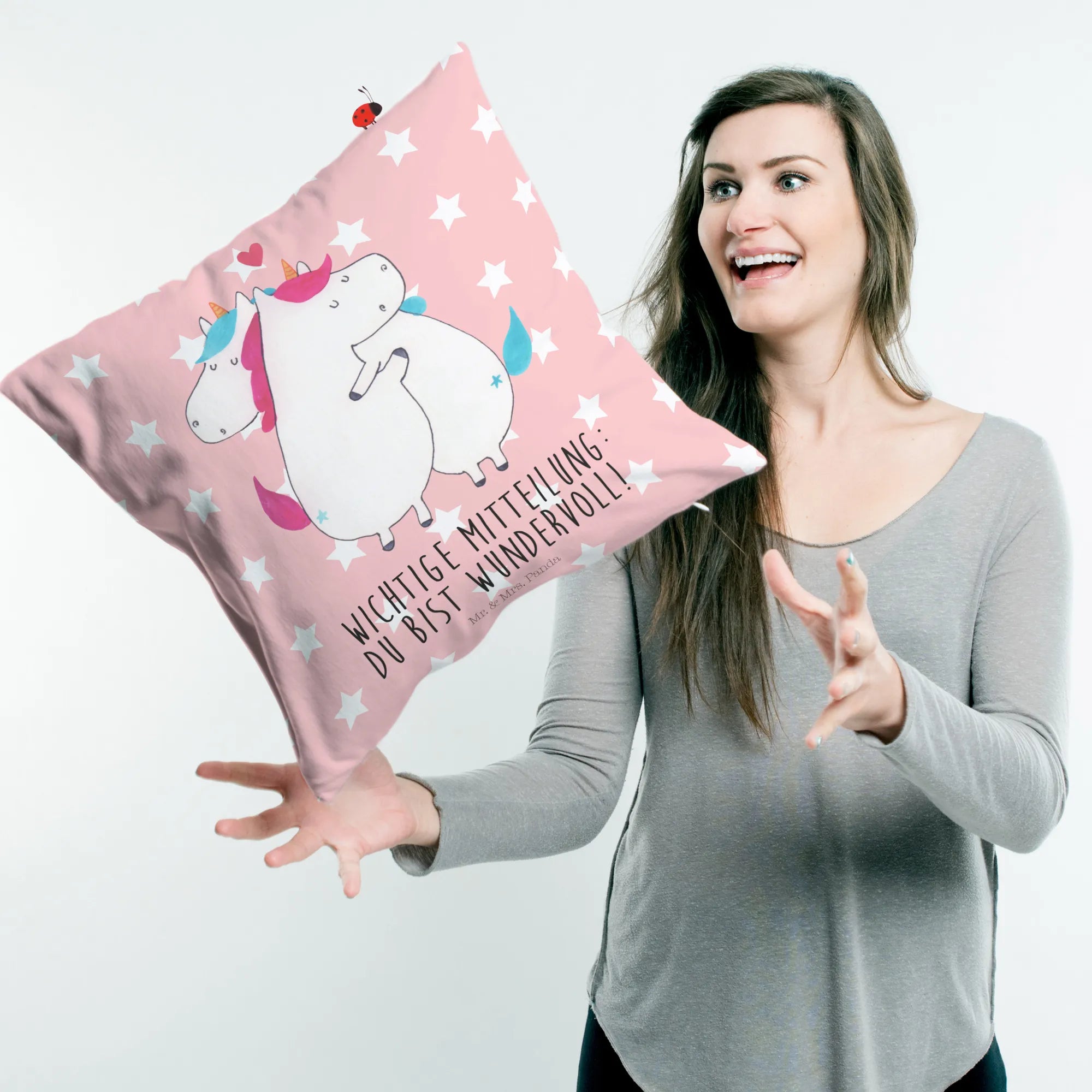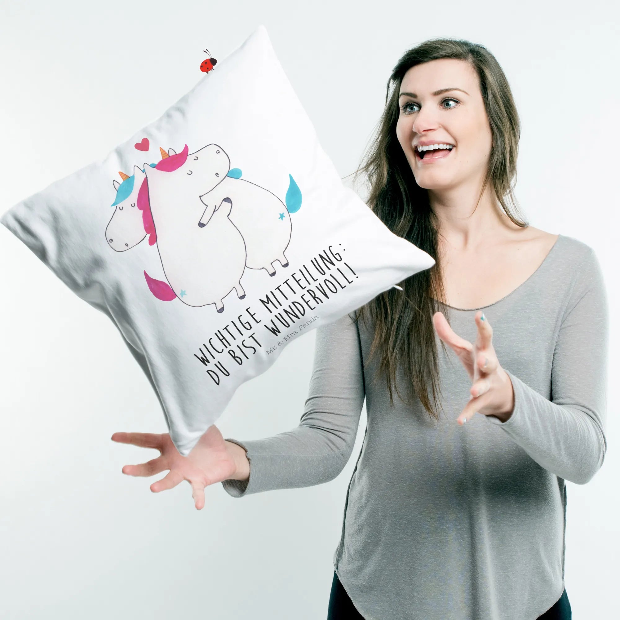 Das 40x40 Kissen Einhorn Mitteilung von Mr. & Mrs. Panda ist das perfekte Geschenk für alle, die fantastischen Einhörnern und zauberhafte Botschaften lieben. Es ist nicht nur ein Kissen, sondern ein Stück Magie, das deinem Zuhause eine positive Note verleiht. Wunderschön bedruckt mit zwei niedlichen Einhörnern, die sich umarmen, trägt es die wichtige Mitteilung: 'Wichtige Mitteilung: Du bist wundervoll!'. Diese süße Botschaft bringt garantiert ein Lächeln auf die Gesichter deiner Liebsten und erinnert sie daran, wie besonders sie sind.