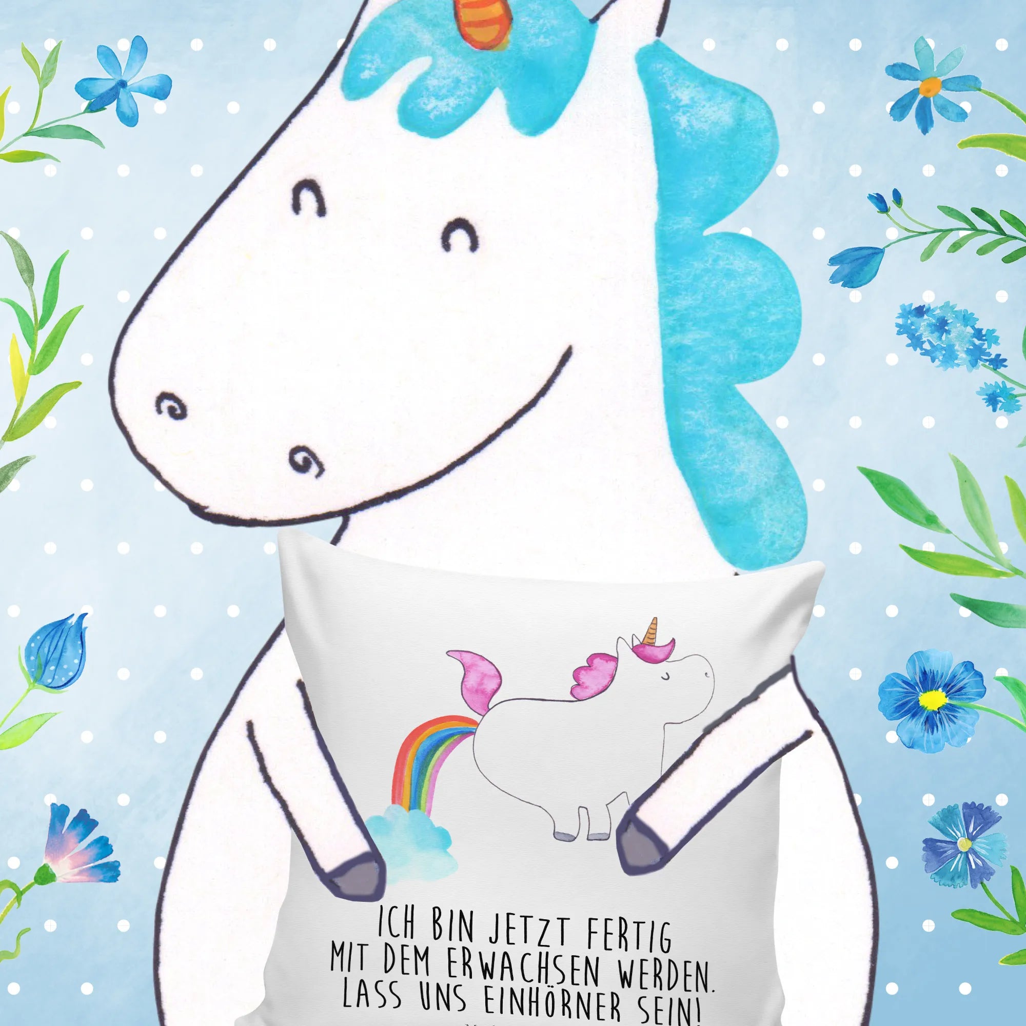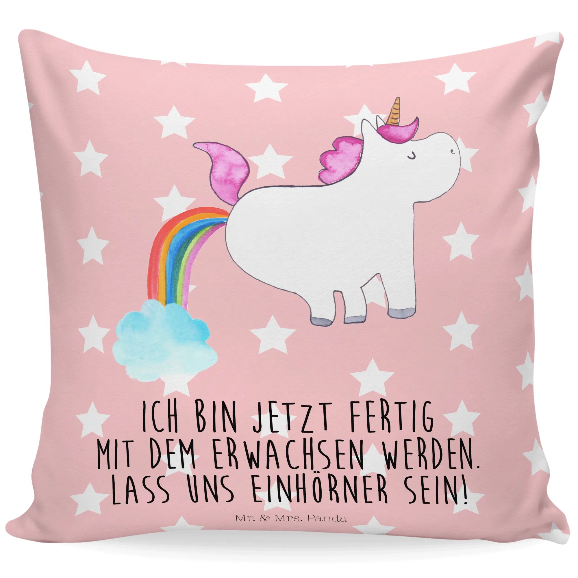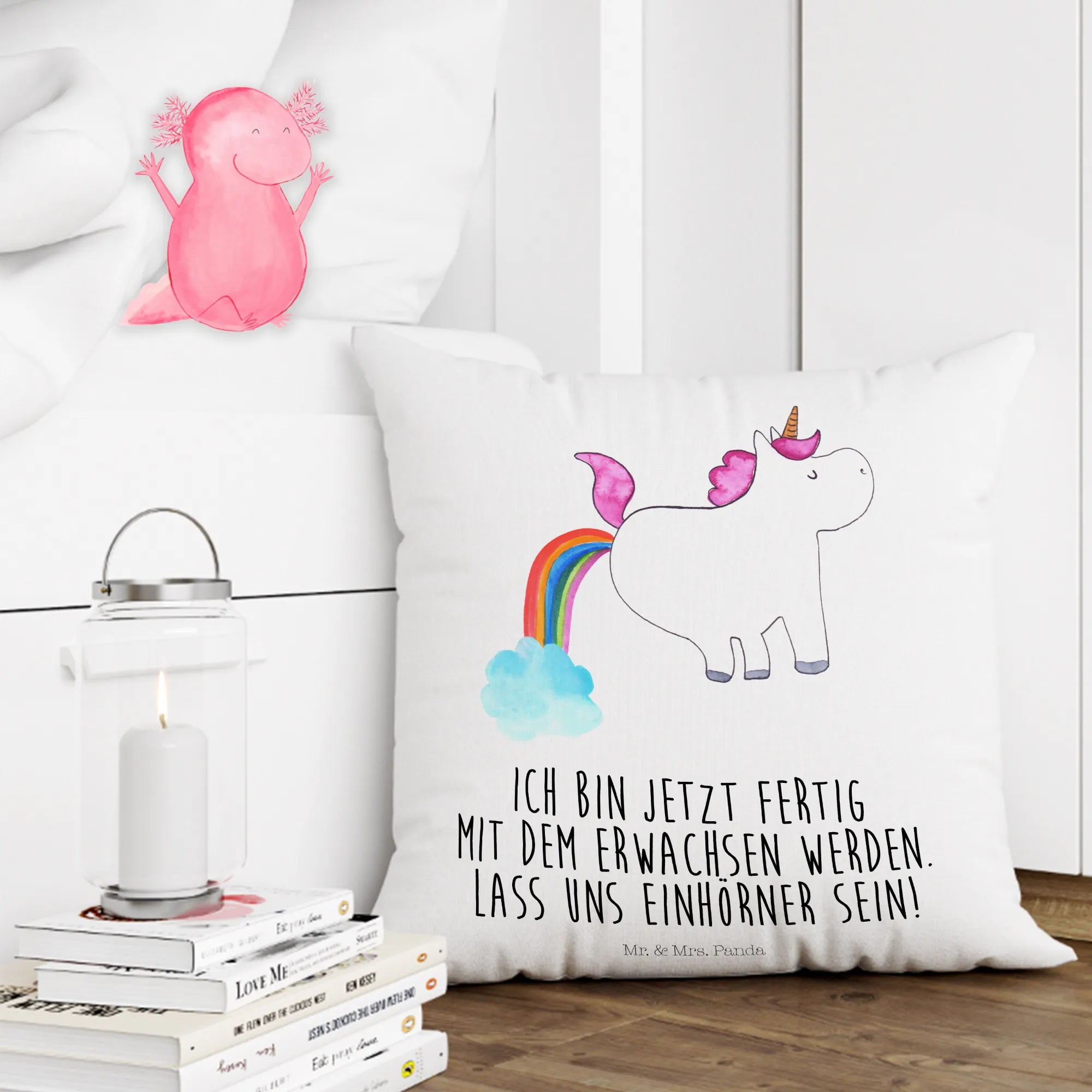 Entdecke das wunderschöne 40x40 Kissen mit dem zauberhaften Motiv "Einhorn Pupsend" aus der Einhorn-Kollektion von Mr. & Mrs. Panda! Dieses kuschelige Dekokissen ist die perfekte Kombination aus Komfort und einem Hauch von Magie. Bedruckt mit einem süßen Einhorn, das fröhlich einen Regenbogenpups versprüht, bringt es Farbe und Spaß in jeden Raum. Das Kissen ist nicht nur ein echter Hingucker auf deiner Couch oder im Schlafzimmer, sondern versteht sich auch darauf, Lächeln zu zaubern!