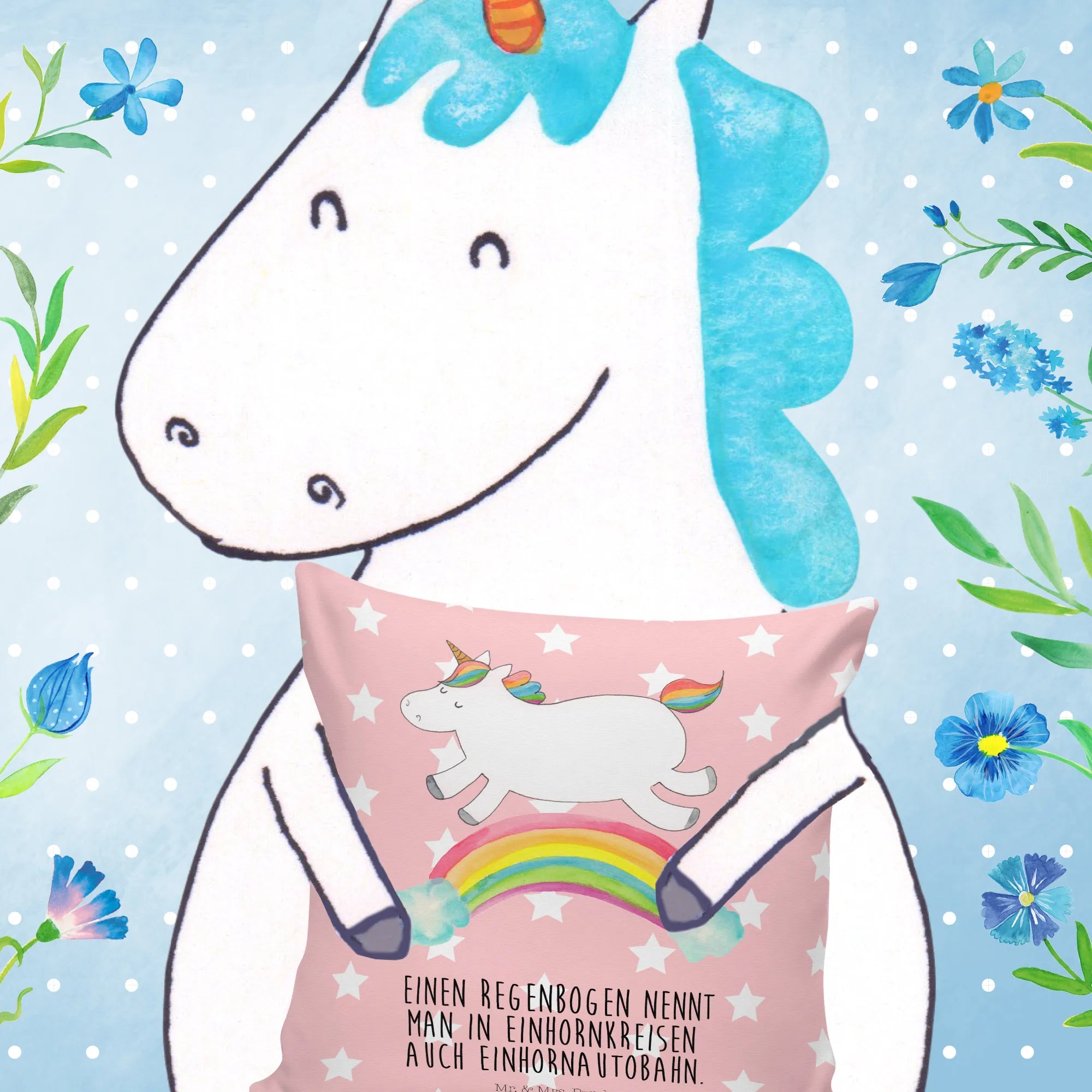 Entdecke das perfekte Geschenk für alle Einhornliebhaber und Freunde der bunten Träume mit unserem 40x40 Kissen "Einhorn Regenbogen" aus der bezaubernden Einhorn - Kollektion von Mr. & Mrs. Panda. Dieses wunderschöne Kissen hat nicht nur eine superfluffy Füllung, sondern besticht auch durch sein zauberhaftes Design. Das farbenfrohe Motiv zeigt ein fröhliches Einhorn, das über eine glitzernde Einhornautobahn flitzt und den Slogan "Einen Regenbogen nennt man in Einhornkreisen auch Einhornautobahn." trägt.