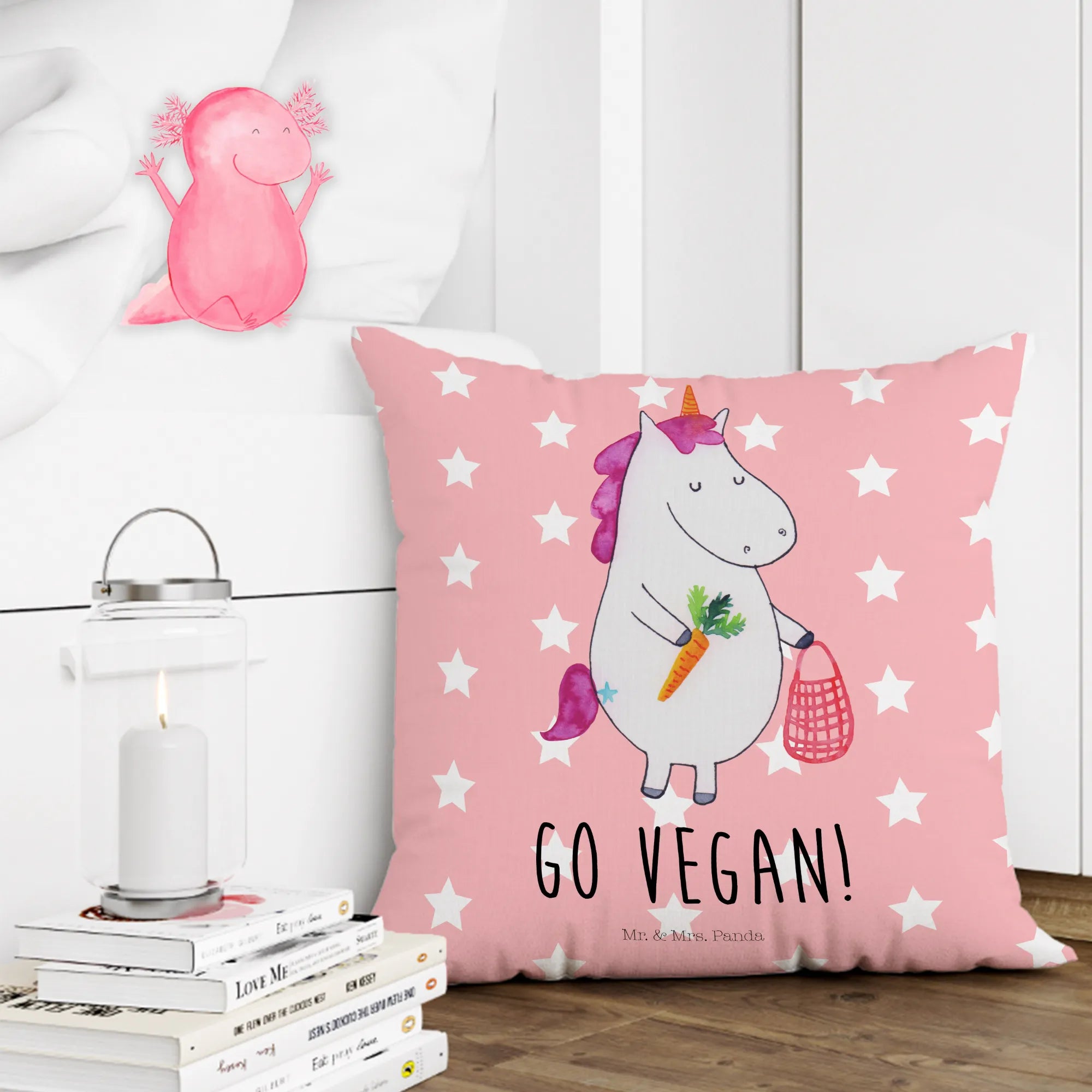 Das 40x40 Kissen Einhorn Vegan von Mr. & Mrs. Panda ist das perfekte Geschenk für alle, die ein Herz für Einhörner und einen veganen Lebensstil haben. Mit seinem zauberhaften Motiv eines süßen Einhorns, das fröhlich mit seiner Einkaufstasche voller veganer Köstlichkeiten durch die Welt schreitet, bringt dieses Kissen nicht nur Freude, sondern auch eine wichtige Botschaft: GO VEGAN!
