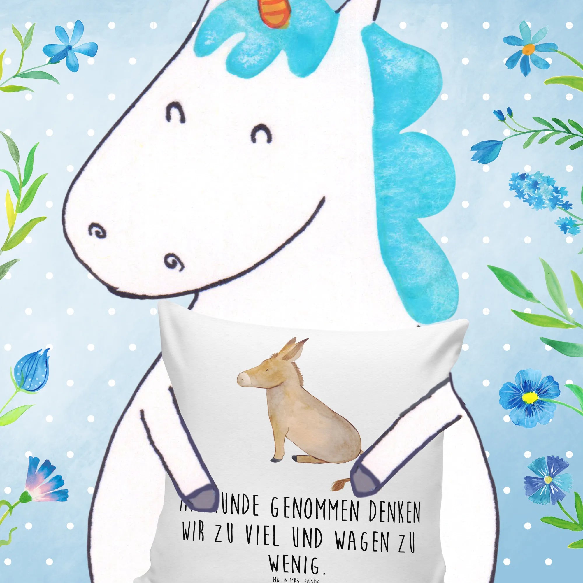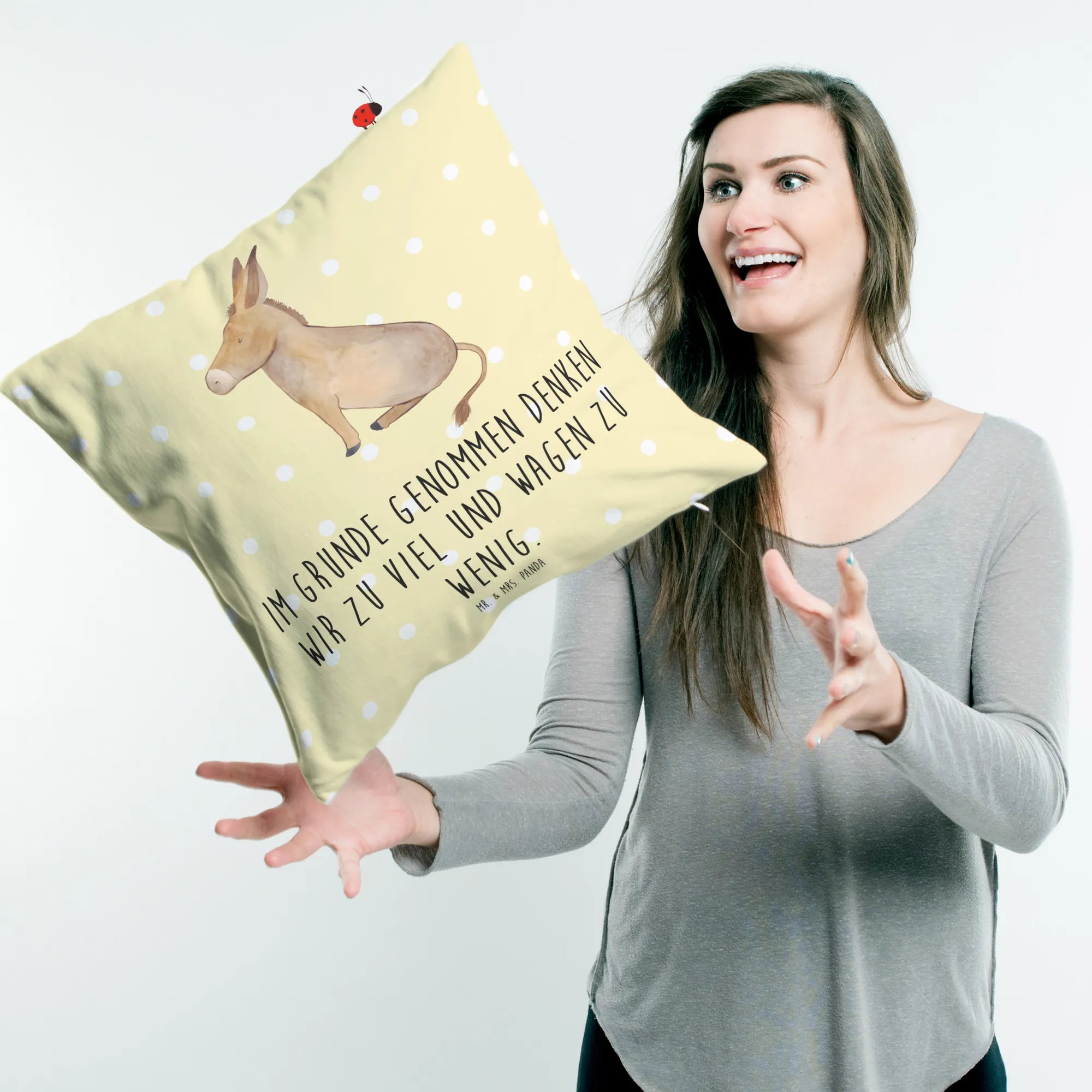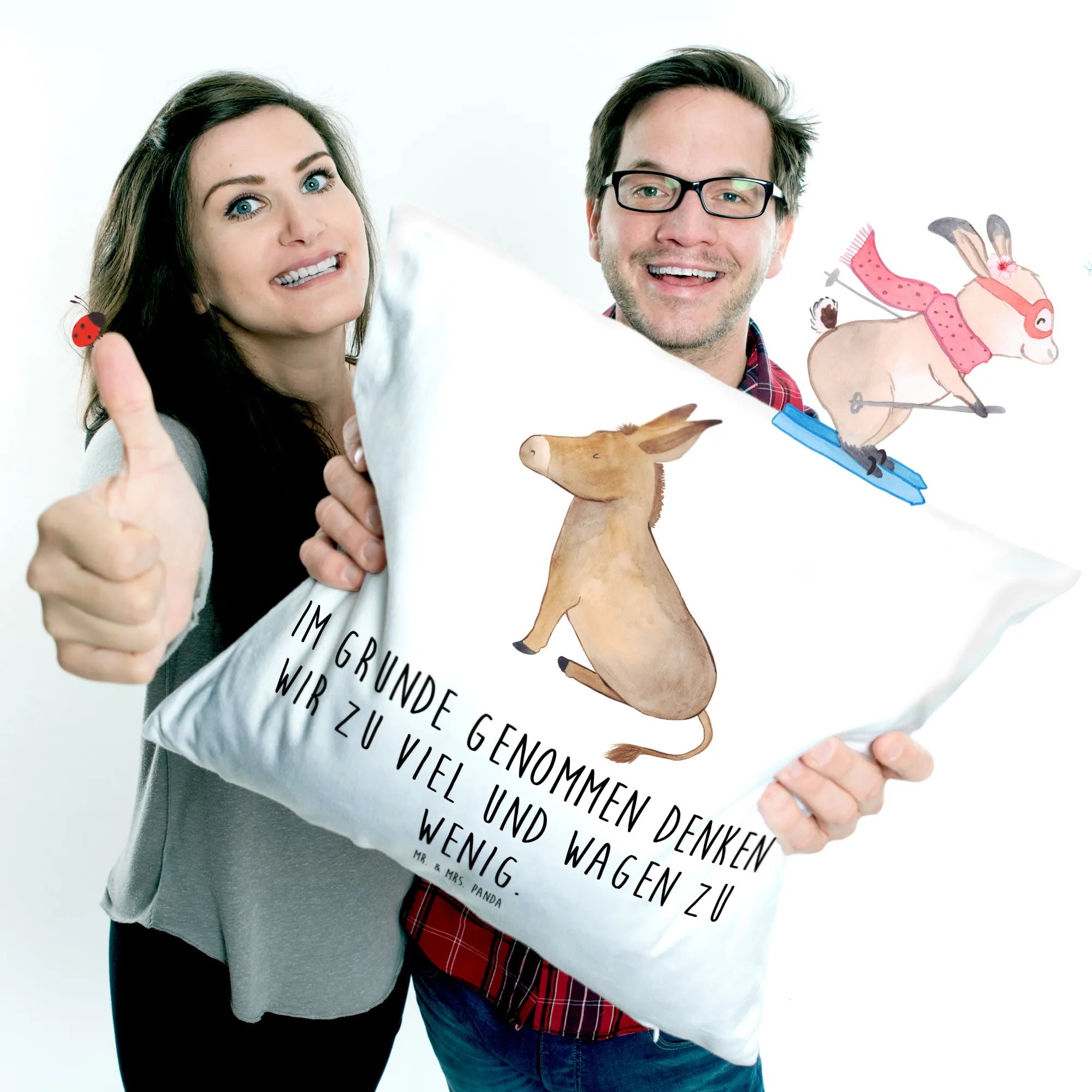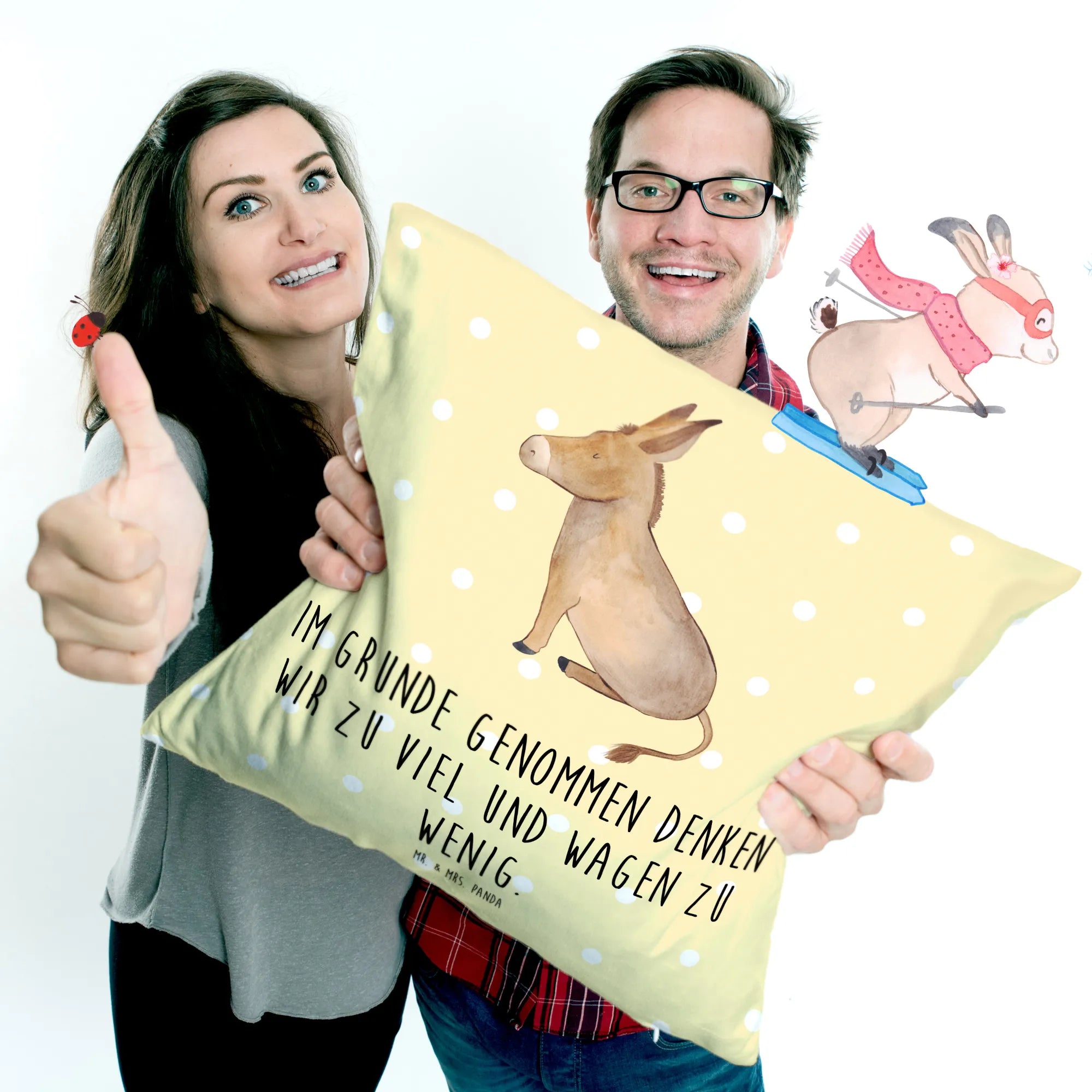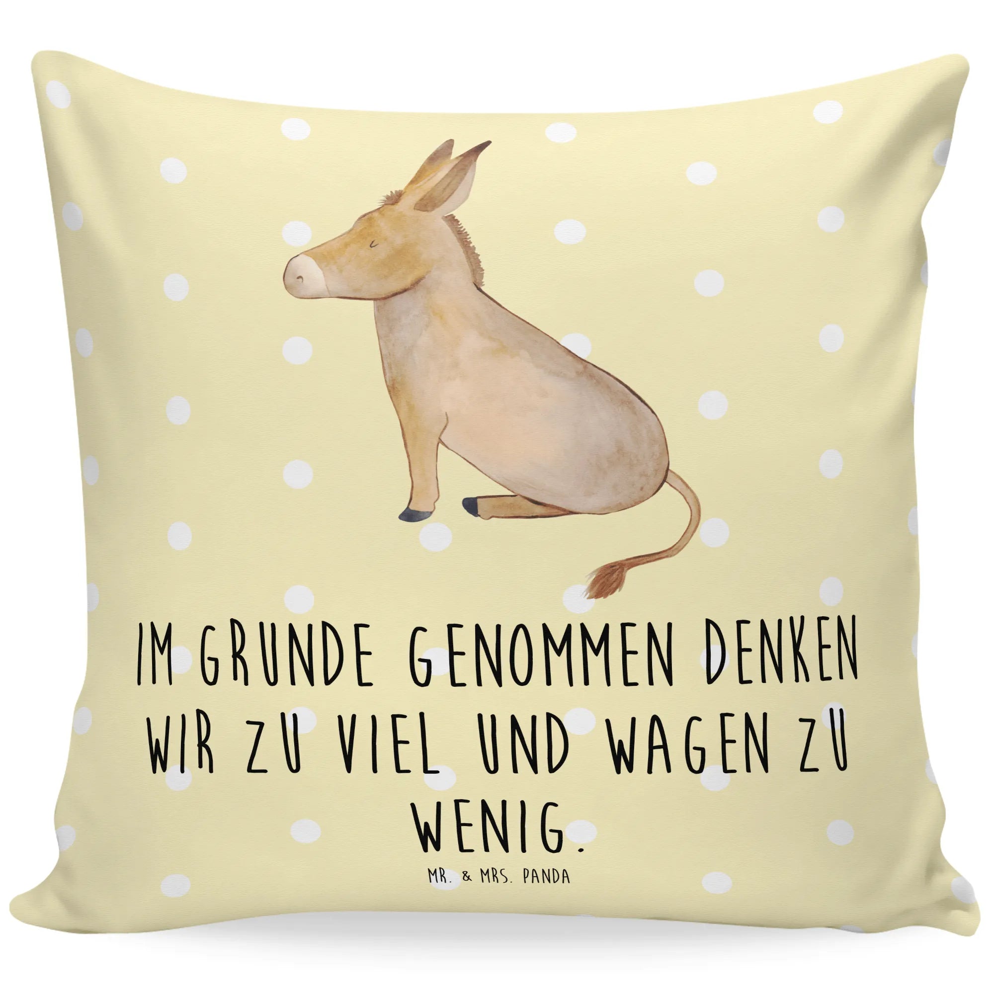 Entdecke das bezaubernde 40x40 Kissen Esel aus der Small World Kollektion von Mr. & Mrs. Panda! Dieses wunderschöne Kissen ist nicht nur ein echter Hingucker, sondern auch perfekt geeignet, um deiner Wohnung eine ganz besondere Note zu verleihen. Mit einem lustigen Spruch "Im Grunde genommen denken wir zu viel und wagen zu wenig." bringt es nicht nur Farbe, sondern auch positive Gedanken in dein Zuhause. Das sanft designte Motiv eines Eselchens in sitzender Position ist ein wahrer Freund, der dir täglich Lebensmut und Zuversicht schenkt.