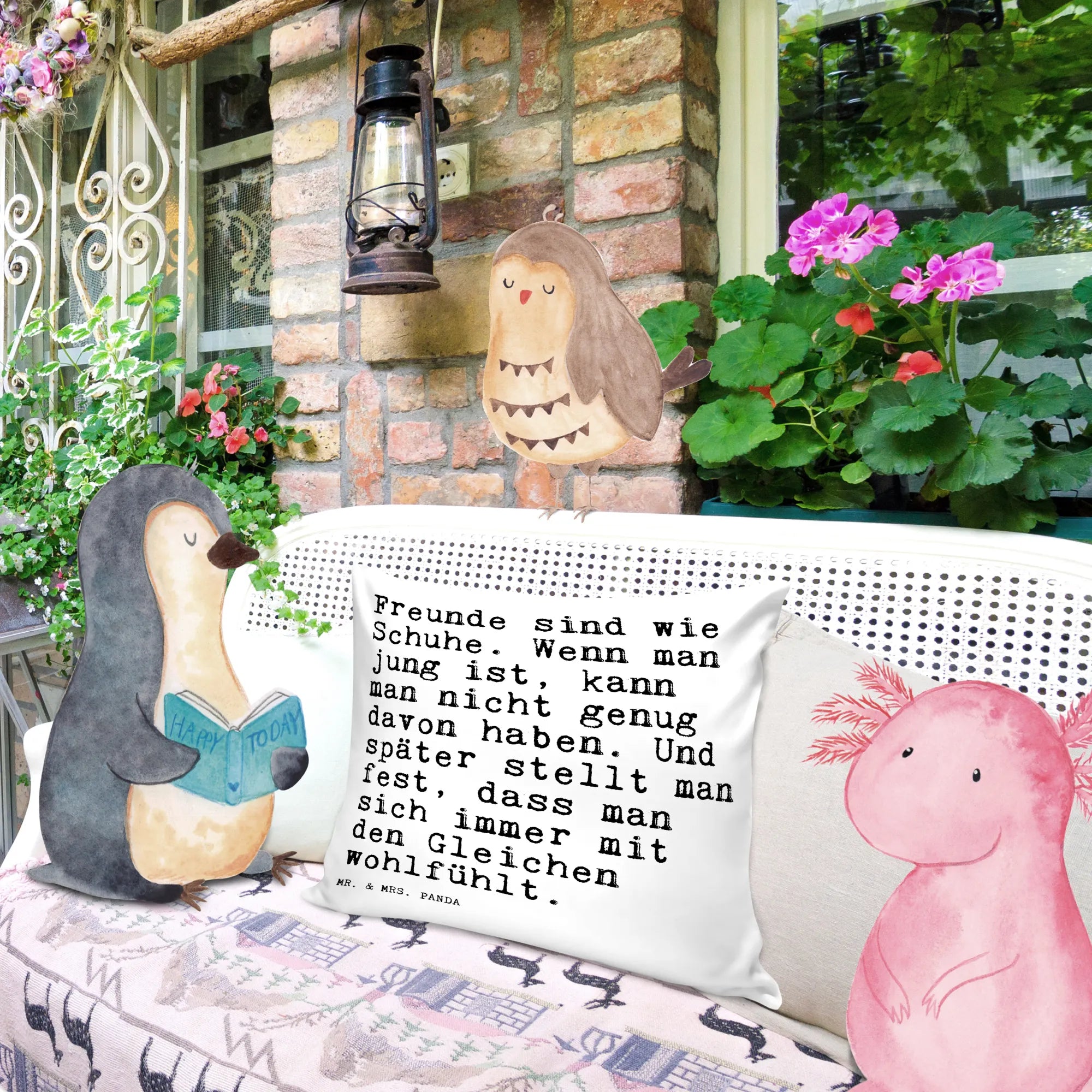 Das Kissen "Freunde sind wie Schuhe" von Mr. & Mrs. Panda ist der perfekte Begleiter für alle, die ihr Zuhause mit einem Hauch von Liebe und Freundschaft dekorieren möchten.