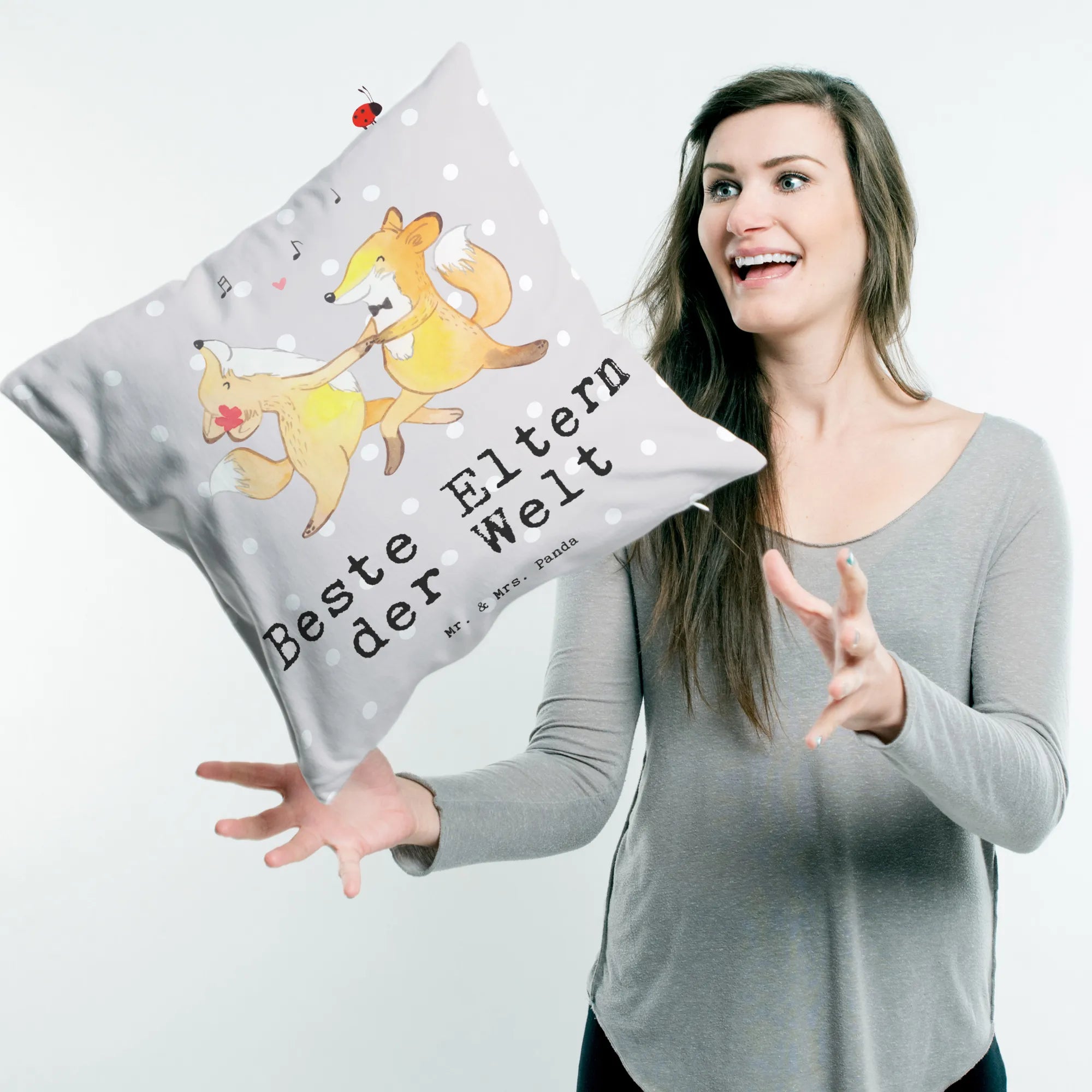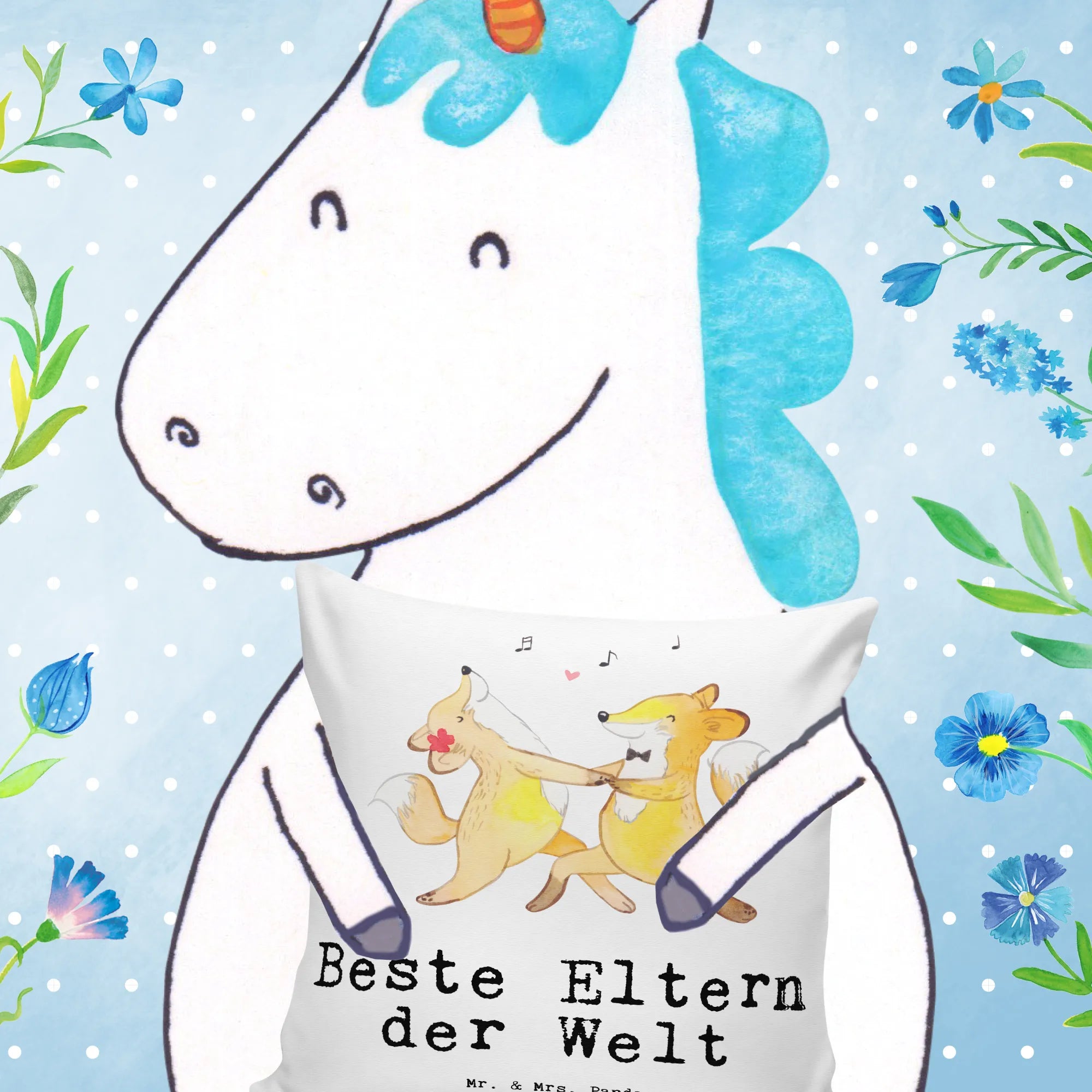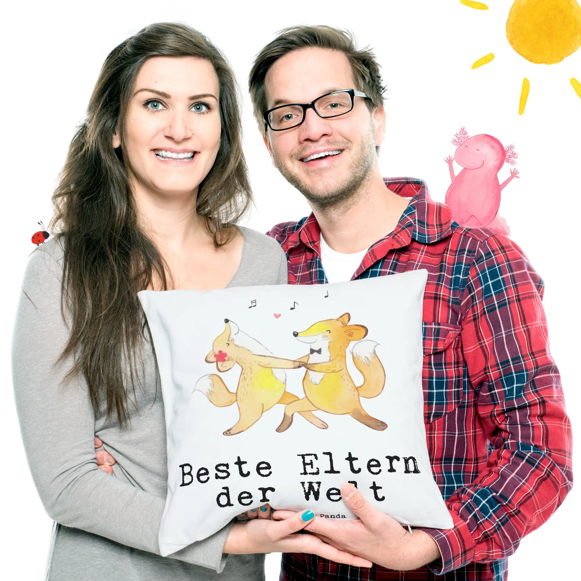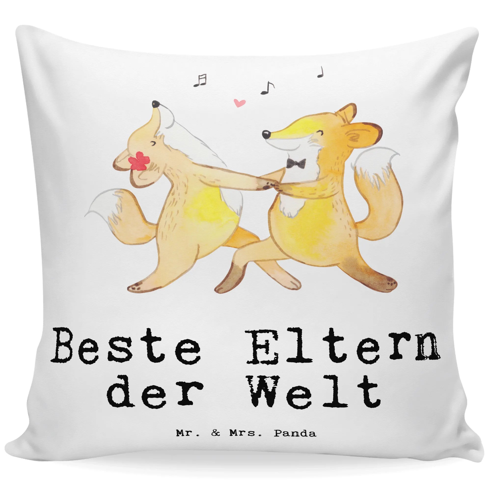 Das Motiv zeigt ein süßes Fuchs-Liebespaar, das ausgelassen zu toller Musik tanzt. Es ist eine liebevolle Hommage an die besten Eltern der Welt, die uns immer begleiten und unterstützen. Das Kissen ist aus superflauschiger Mikrofaser gefertigt und fühlt sich einfach himmlisch an. Mit seiner hochwertigen, herausnehmbaren Füllung ist es ideal zum Kuscheln und Entspannen.