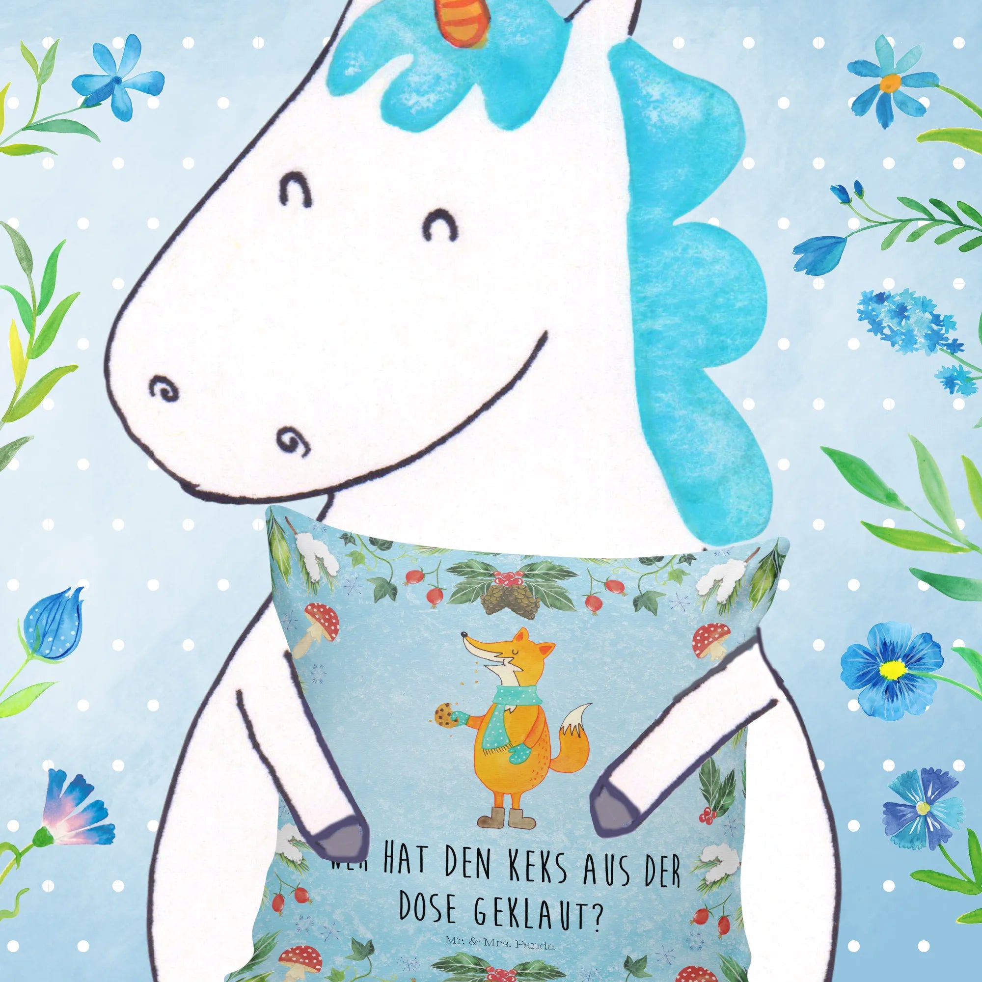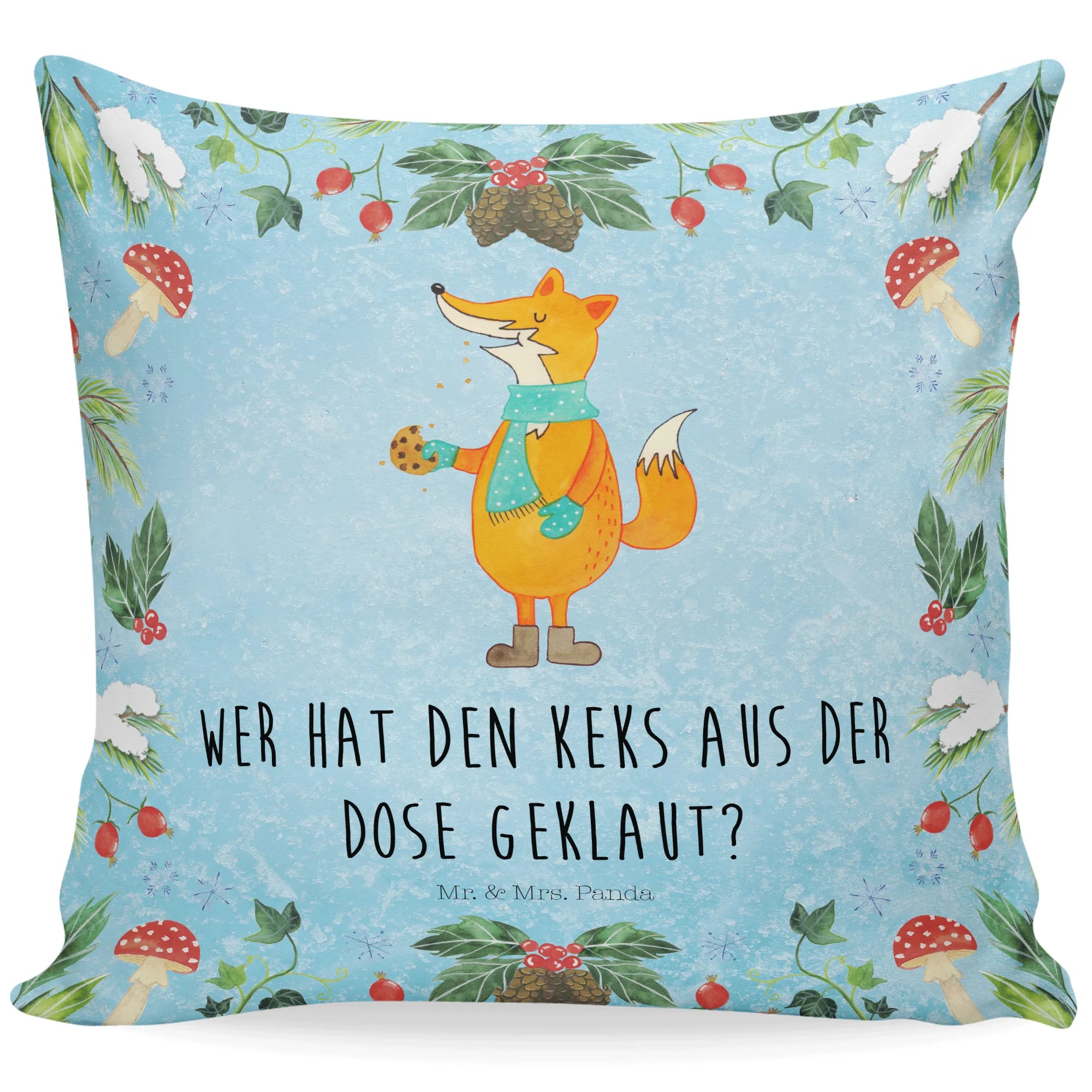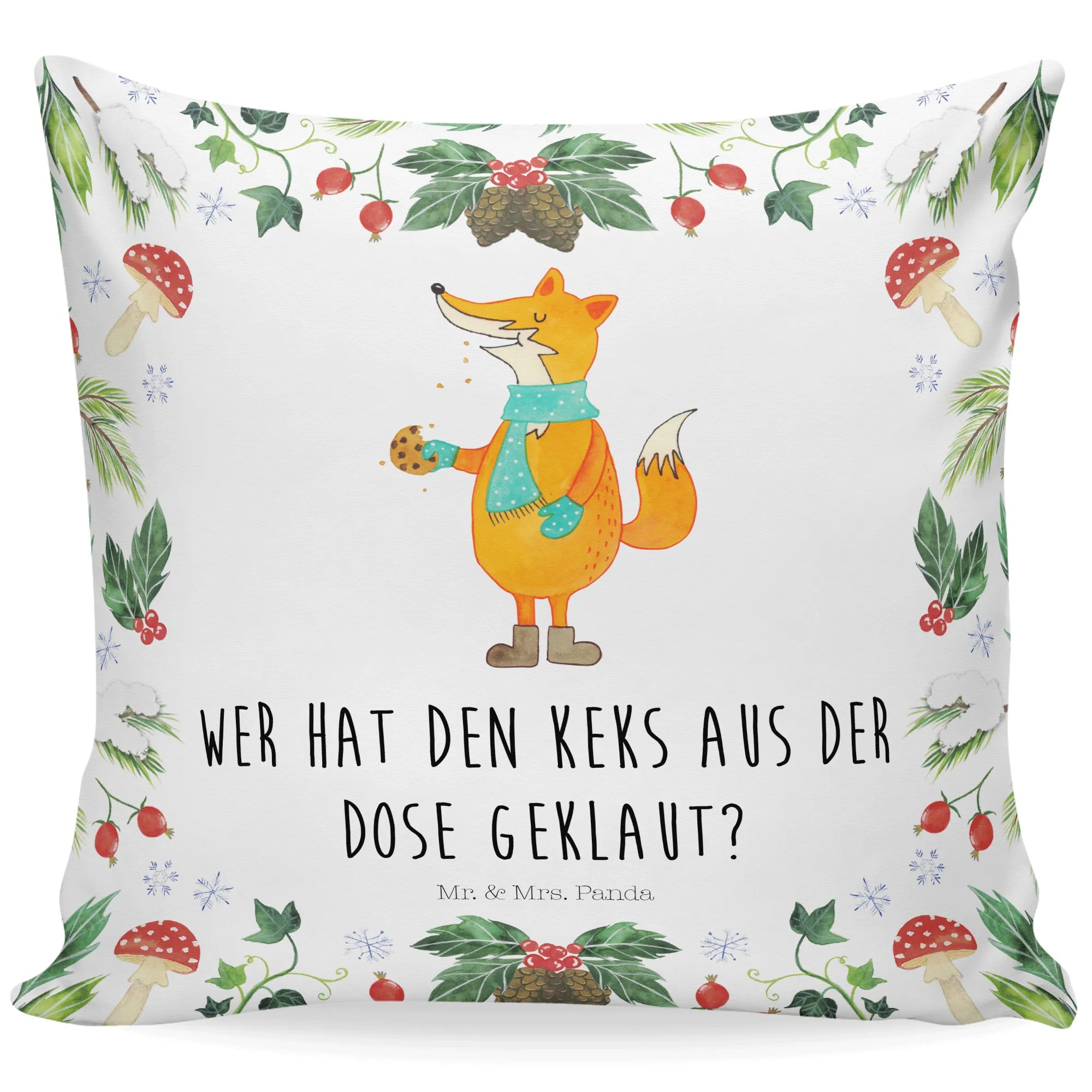 Das Kissen "Fuchs Keksdose" von Mr. & Mrs. Panda ist das perfekte Geschenk für die kalte Jahreszeit! Mit seinem liebevollen Design und dem frechen Spruch „Wer hat den Keks aus der Dose geklaut?“ zaubert es jedem ein Lächeln ins Gesicht. Insbesondere für Winter- und Weihnachtsliebhaber ist dieses Kissen ein absolutes Must-Have. Der süße Fuchs mit seinem türkisfarbenen Schal und den braunen Stiefeln hält stolz einen Keks in der Hand und verbreitet eine fröhliche Atmosphäre in deinem Zuhause.