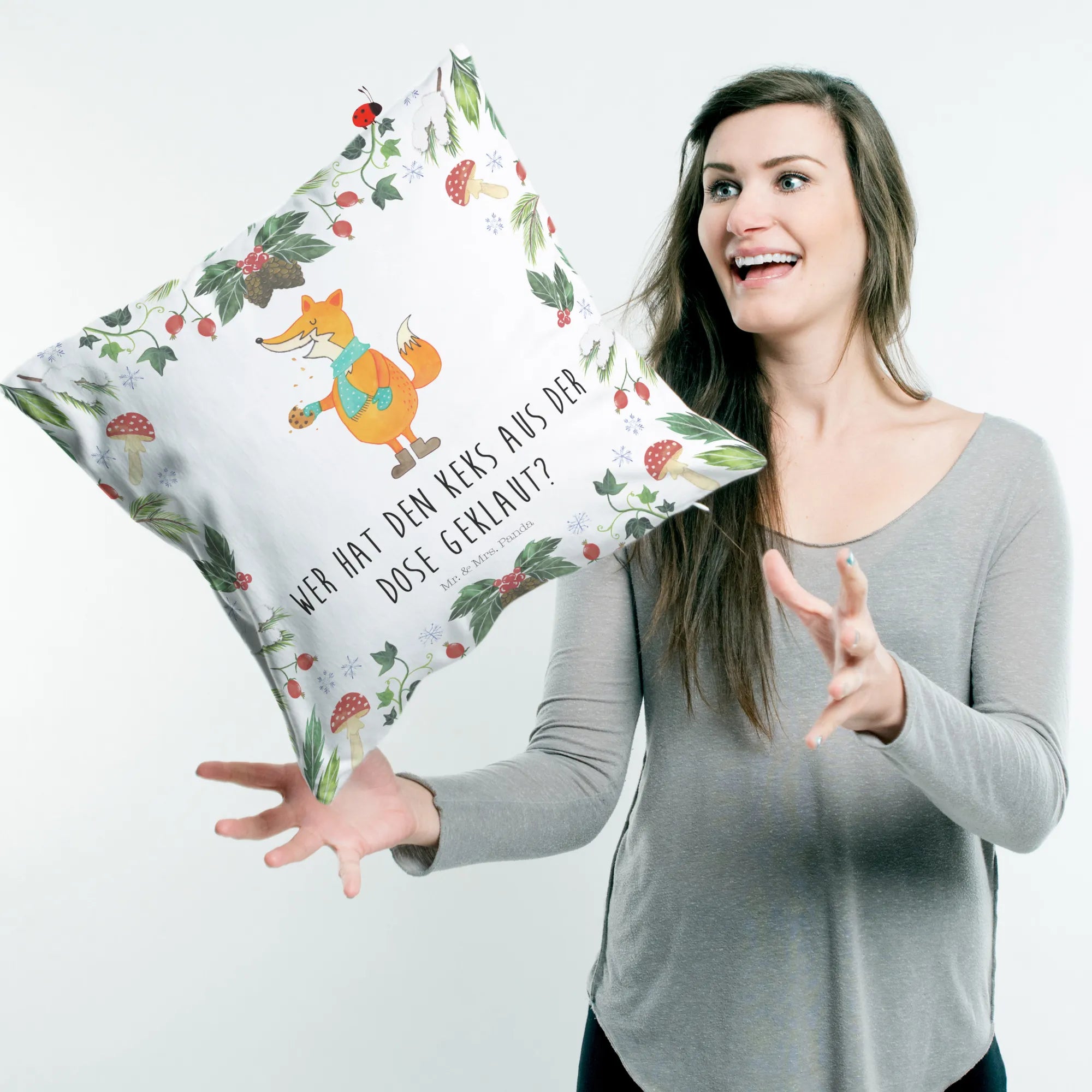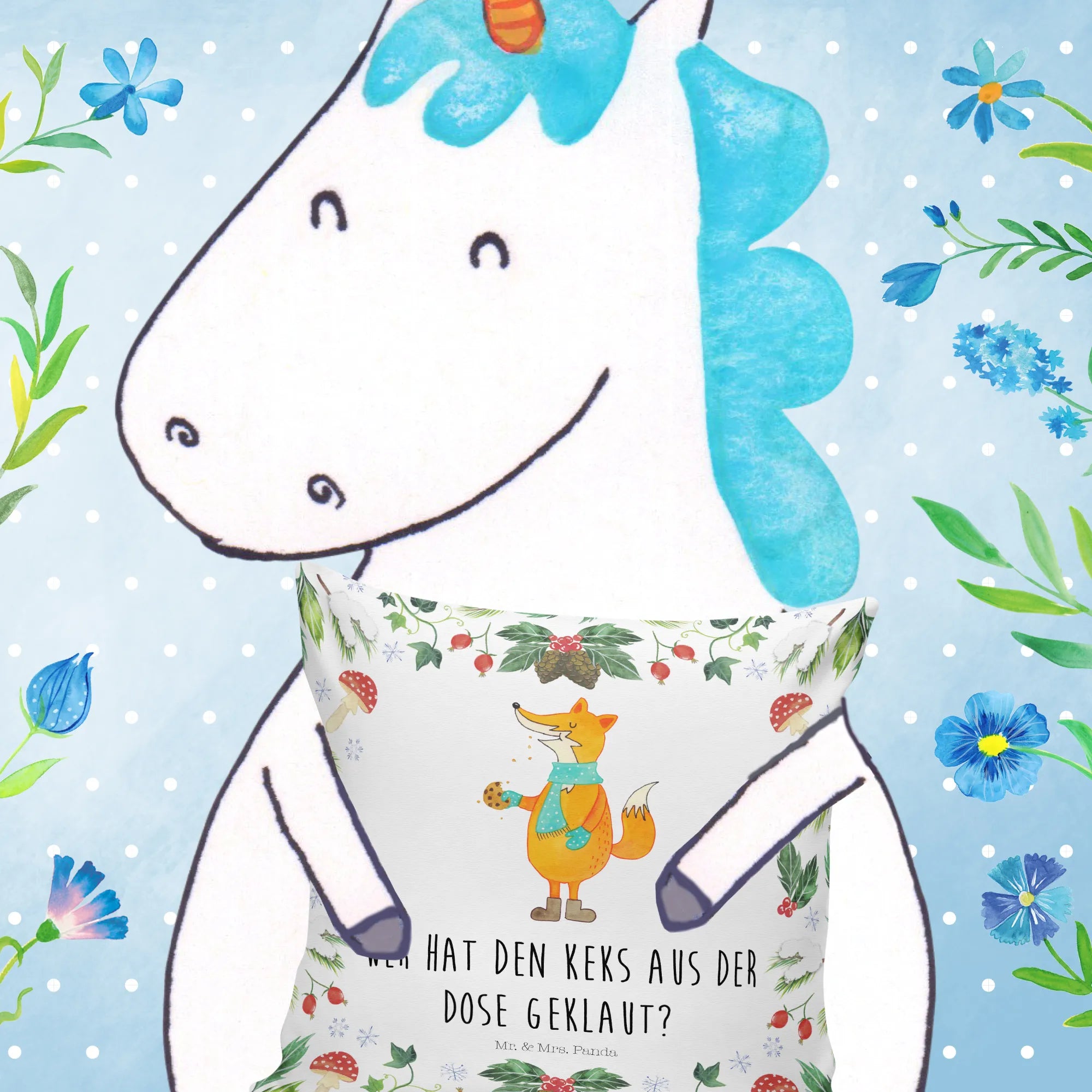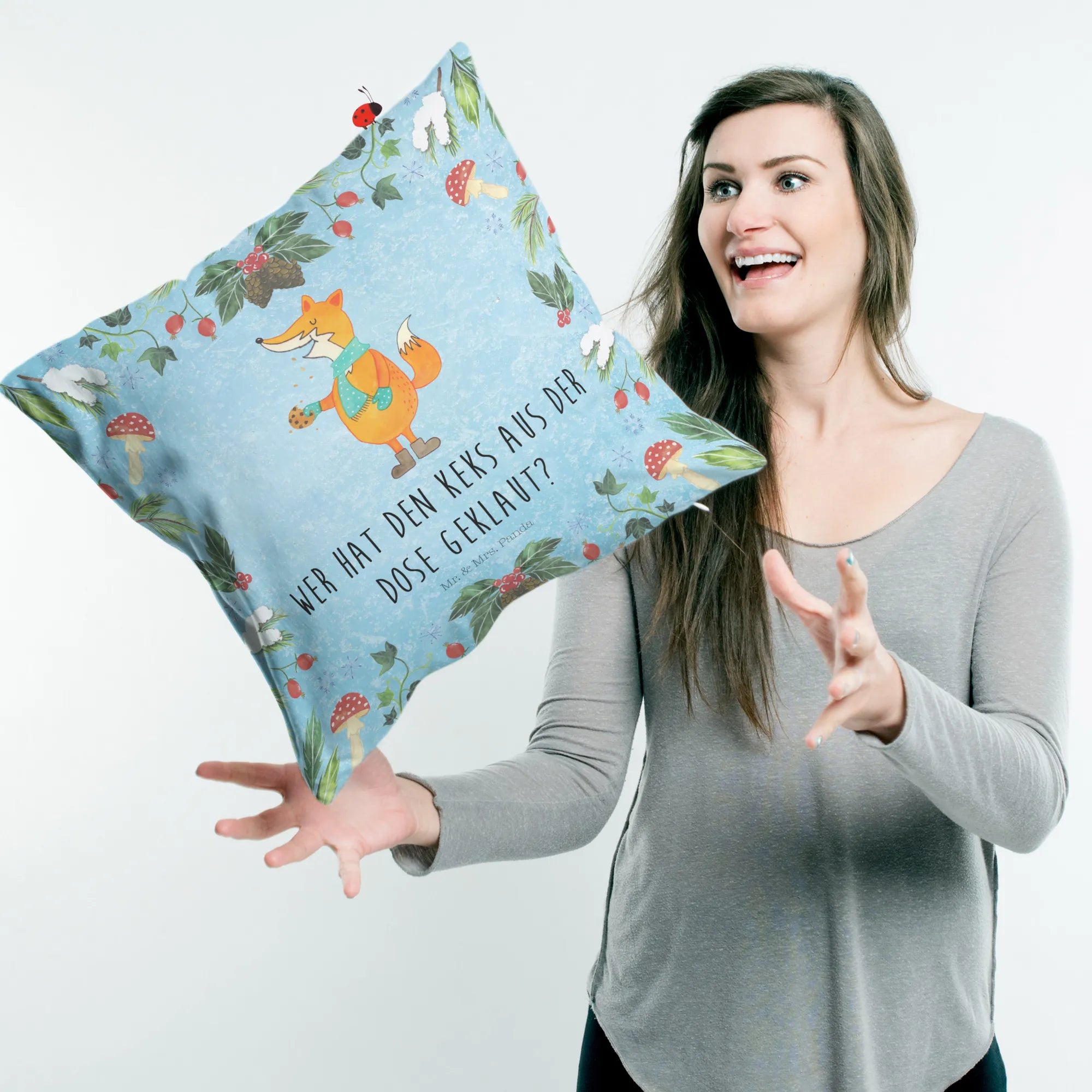 Das Kissen "Fuchs Keksdose" von Mr. & Mrs. Panda ist das perfekte Geschenk für die kalte Jahreszeit! Mit seinem liebevollen Design und dem frechen Spruch „Wer hat den Keks aus der Dose geklaut?“ zaubert es jedem ein Lächeln ins Gesicht. Insbesondere für Winter- und Weihnachtsliebhaber ist dieses Kissen ein absolutes Must-Have. Der süße Fuchs mit seinem türkisfarbenen Schal und den braunen Stiefeln hält stolz einen Keks in der Hand und verbreitet eine fröhliche Atmosphäre in deinem Zuhause.