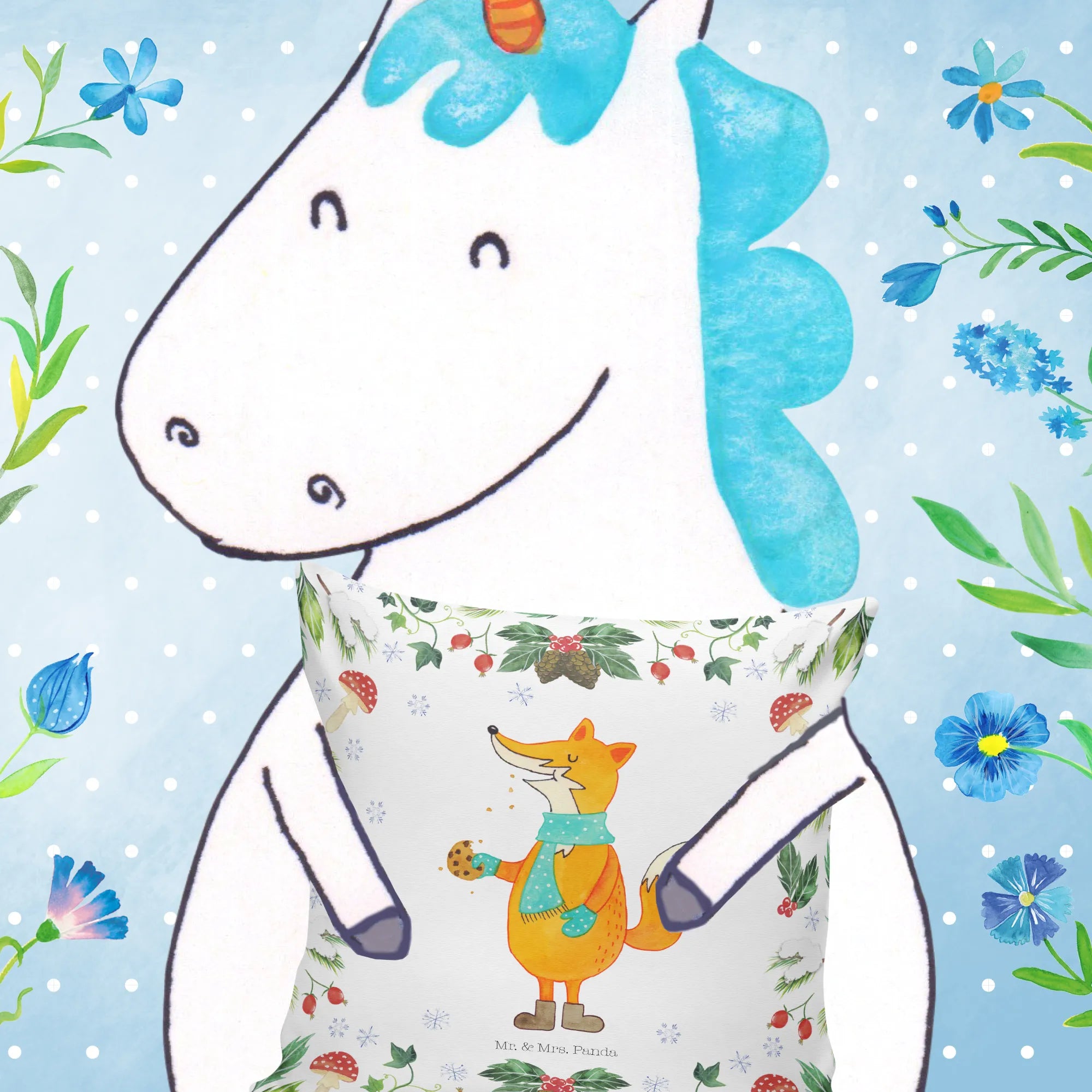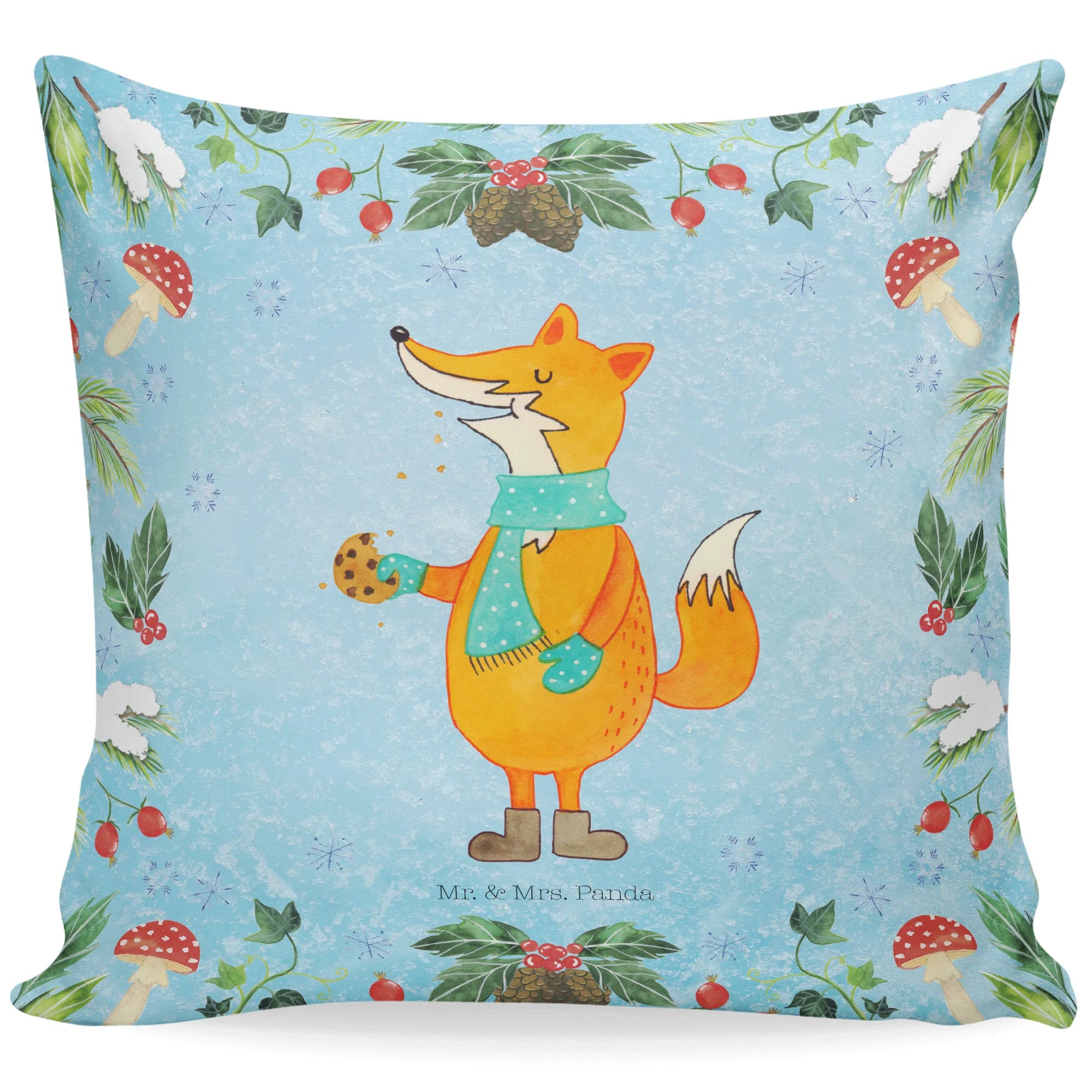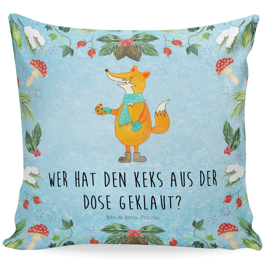 Entdecke unser zauberhaftes 40x40 Kissen mit dem lustigen Motiv Fuchs Keksdose aus der Winter Kollektion von Mr. & Mrs. Panda! Dieses Kissen ist nicht nur ein echter Hingucker, sondern bringt auch eine fröhliche Note in dein Zuhause. Der niedliche Fuchs trägt einen türkisfarbenen Schal mit weißen Punkten und hält einen halb gegessenen Keks in der Hand. Seine warme und freundliche Ausstrahlung macht es zu einem perfekten Begleiter für die gemütliche Winterzeit.