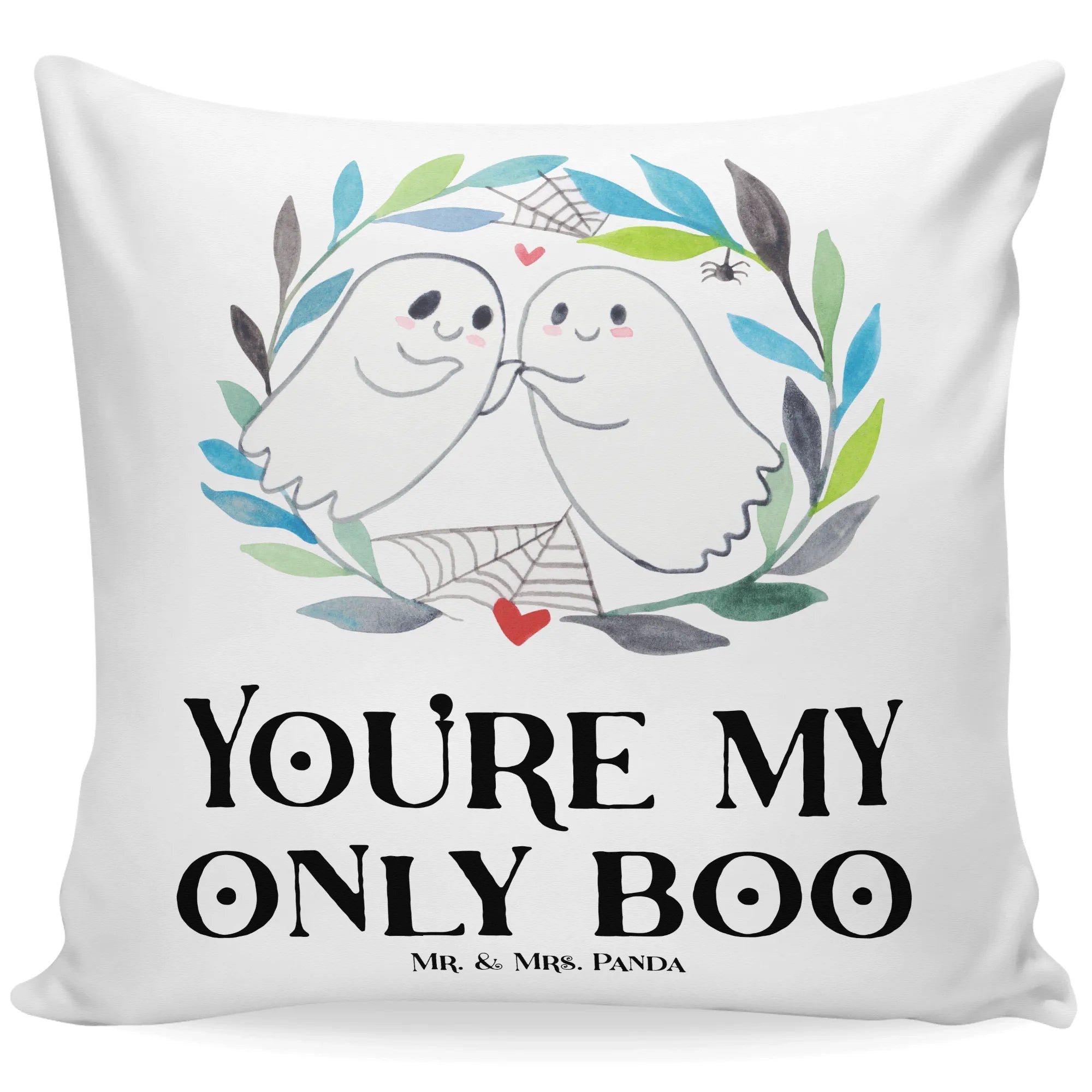 Entdecke das perfekte 40x40 Kissen mit dem zauberhaften Motiv "Gespenster Liebe" aus der Halloween-Kollektion von Mr. & Mrs. Panda! Dieses Kissen ist nicht nur ein exquisites Dekokissen, sondern auch ein liebevolles Geschenk für besondere Anlässe. Mit den stilisierten Gespenstern, die sich händchenhaltend in die Augen schauen, versprüht es romantische Halloween-Vibes. Das Kissen zeigt zudem ein süßes kleines Herz, das die Verbundenheit der beiden Gespenster unterstreicht. Die sanften Farbtöne der Blättergirlande in Grün und Blau sowie die feinen Spinnweben fügen sich perfekt in die Halloween-Dekoration ein und machen es zu einem echten Hingucker für dein Zuhause.