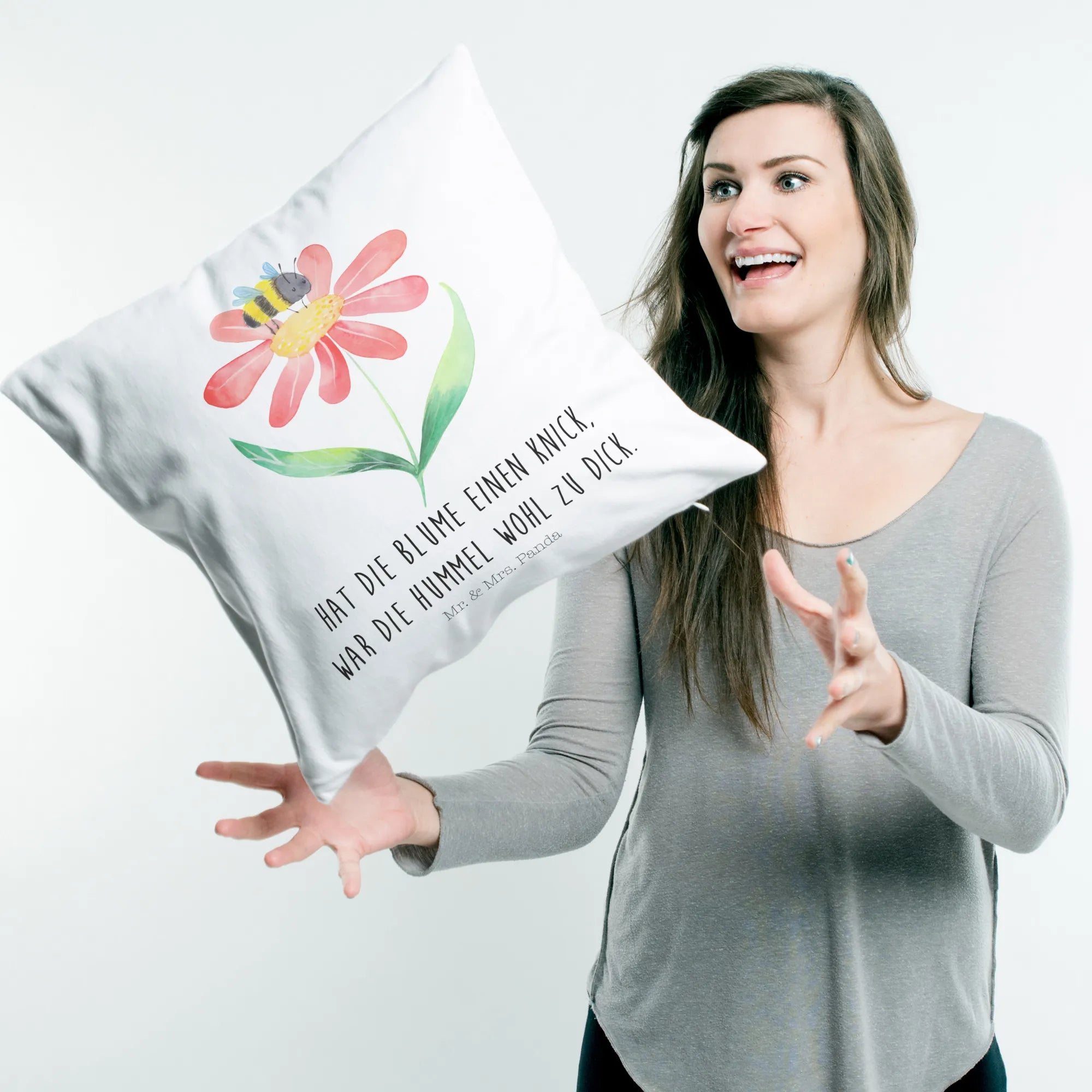 Das 40x40 Kissen "Hummel Blume" von Mr. & Mrs. Panda ist das perfekte Geschenk für alle, die die Natur und Ihre kleinen Wunder lieben. Mit seiner verspielten Illustration einer süßen Hummel, die auf einer Blüte landet, bringt dieses tolle Kissen fröhliche Atmosphäre in jedes Zuhause. Ob auf der Couch, im Schlafzimmer oder als Dekoration im Kinderzimmer - dieses Dekokissen sorgt immer für gute Laune und einen Hauch von Natur. Das Motiv stammt aus unserer beliebten Small World Kollektion, die für ihre liebevollen und bunten Tiermotive bekannt ist. Der Slogan „Hat die Blume einen Knick, war die Hummel wohl zu dick.“ sorgt zusätzlich für Schmunzeln und bringt Freude in den Alltag.