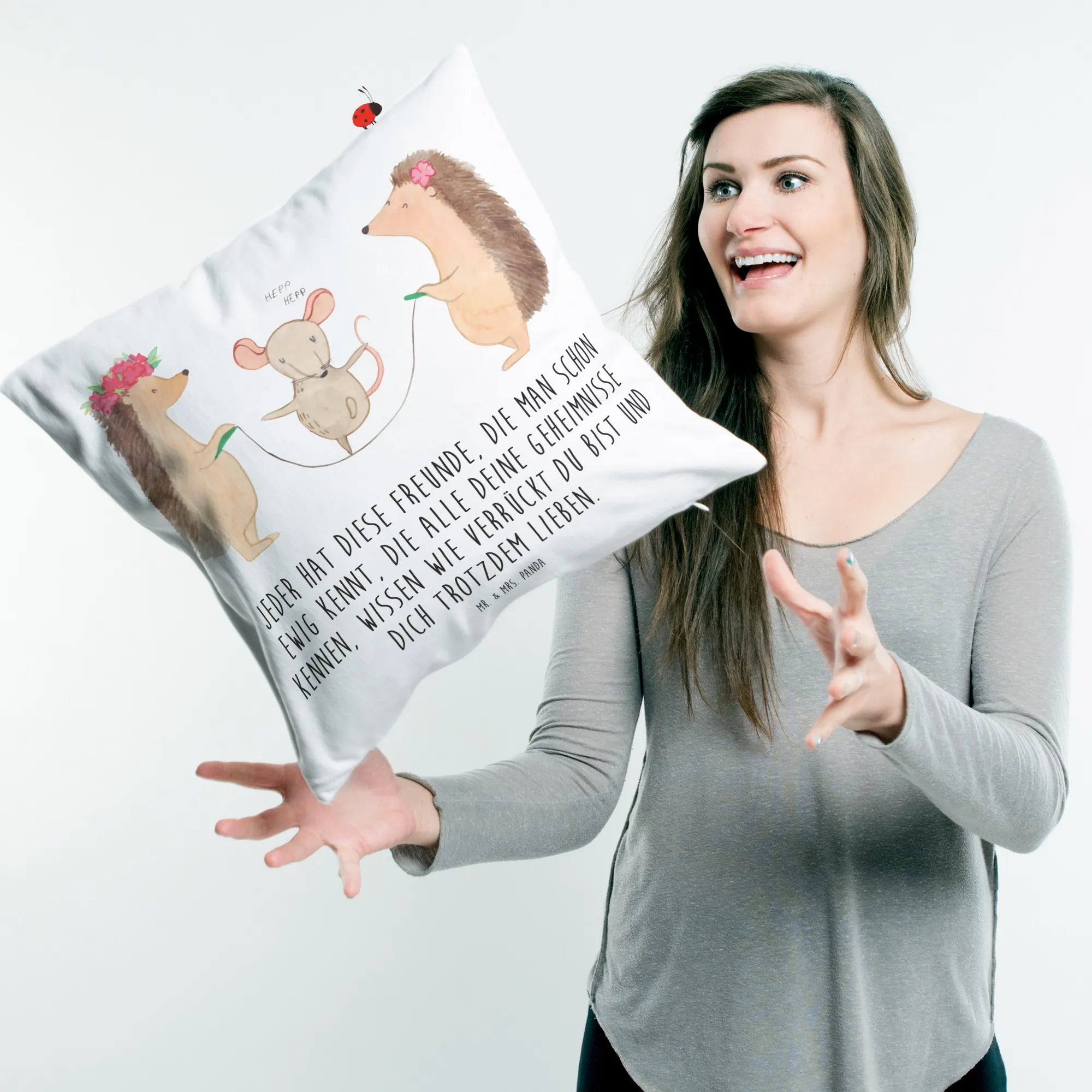 Das kuschelige Kissen ist aus hochwertigen, super flauschigen Mikrofaser gefertigt und mit einer weichen, herausnehmbaren Füllung versehen. Der Kissenbezug mit den tollen Tiermotiven und dem kreativen Spruch "Jeder hat diese Freunde, die man schon ewig kennt, die alle deine Geheimnisse kennen, wissen wie verrückt du bist und dich trotzdem lieben." lädt zum Schmunzeln ein und sorgt für eine positive Atmosphäre.