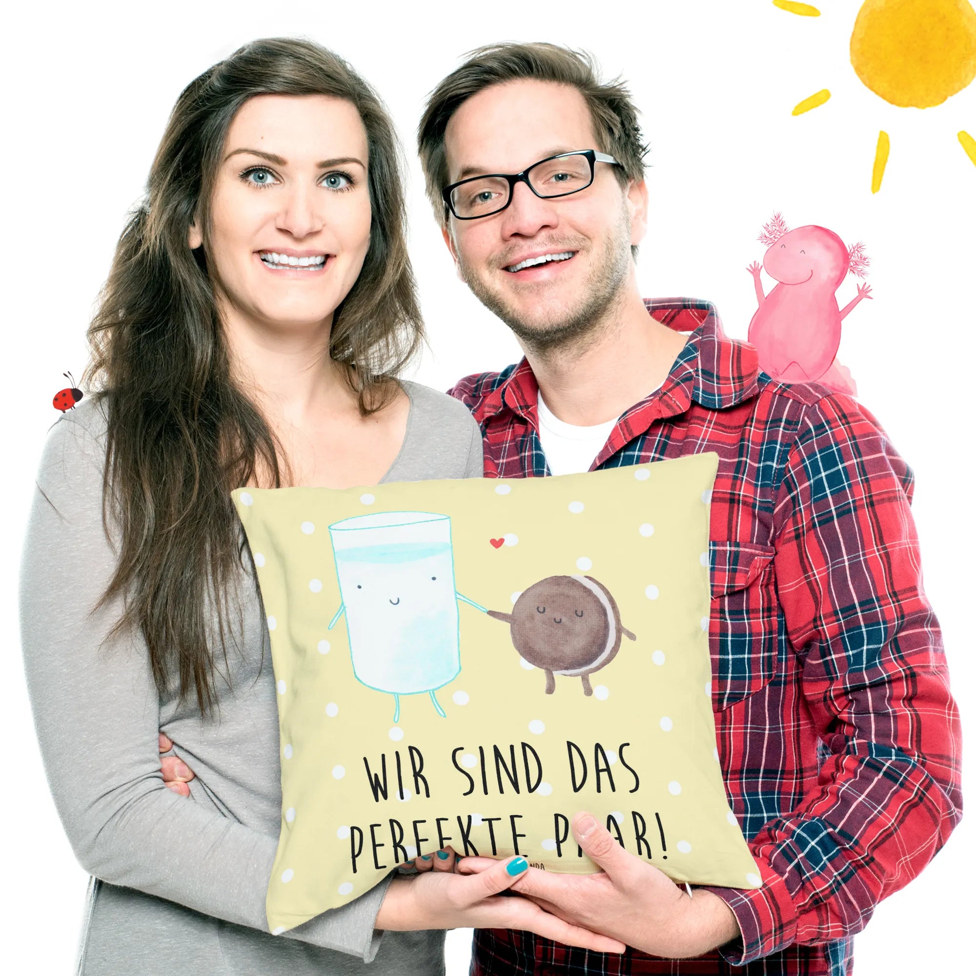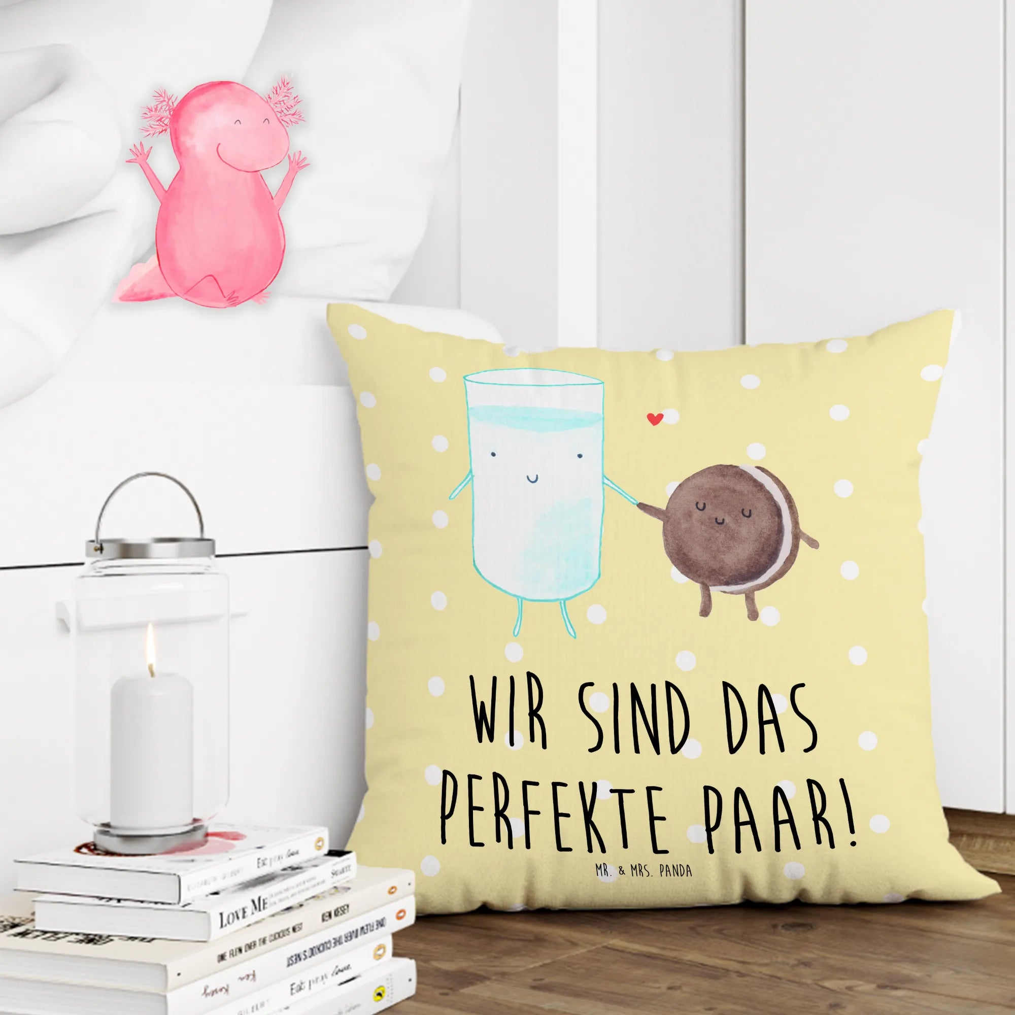 Dieses niedliche Sofakissen zeigt ein Glas Milch und einen Keks, die Händchen halten – begleitet vom liebevollen Schriftzug „Wir sind das perfekte Paar!“. Das pastellige Gelb sorgt für warme Akzente in Deinem Zuhause und bringt sofort gute Laune. Ideal als Dekokissen, Couchkissen oder als süßes Geschenk zum Frühstück oder zur Einladung.