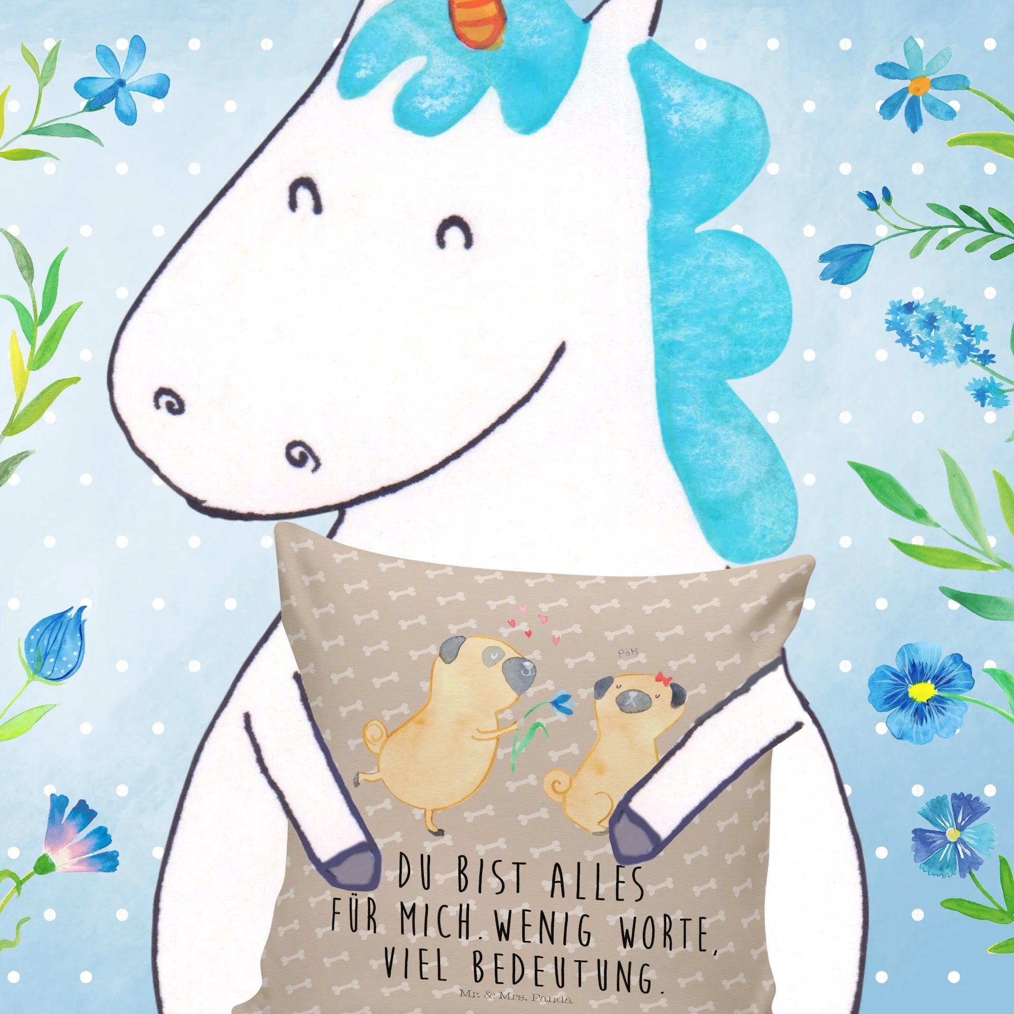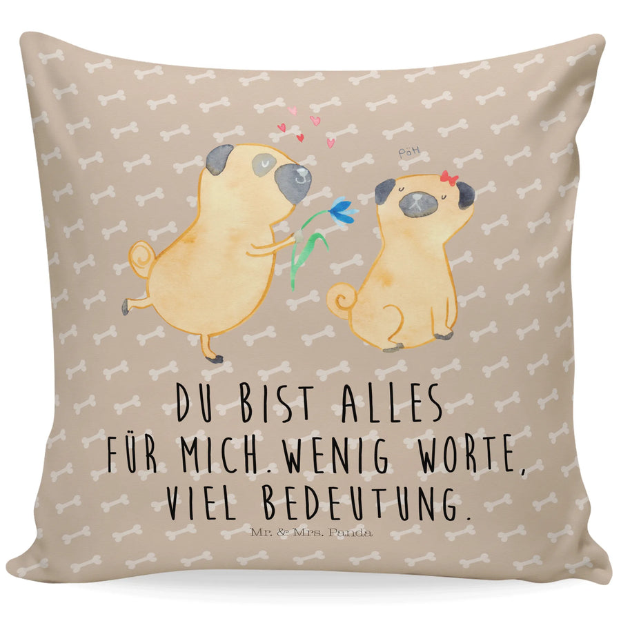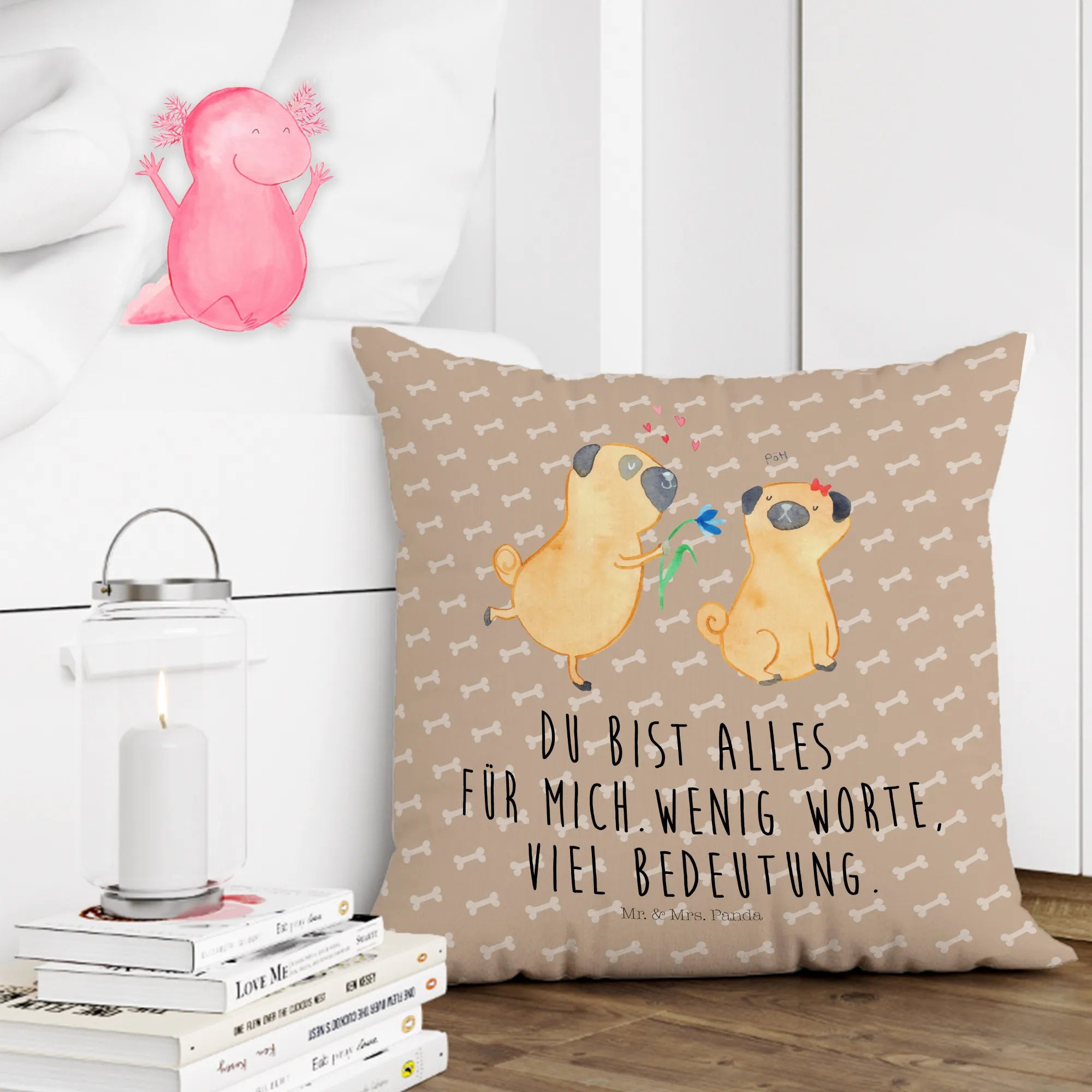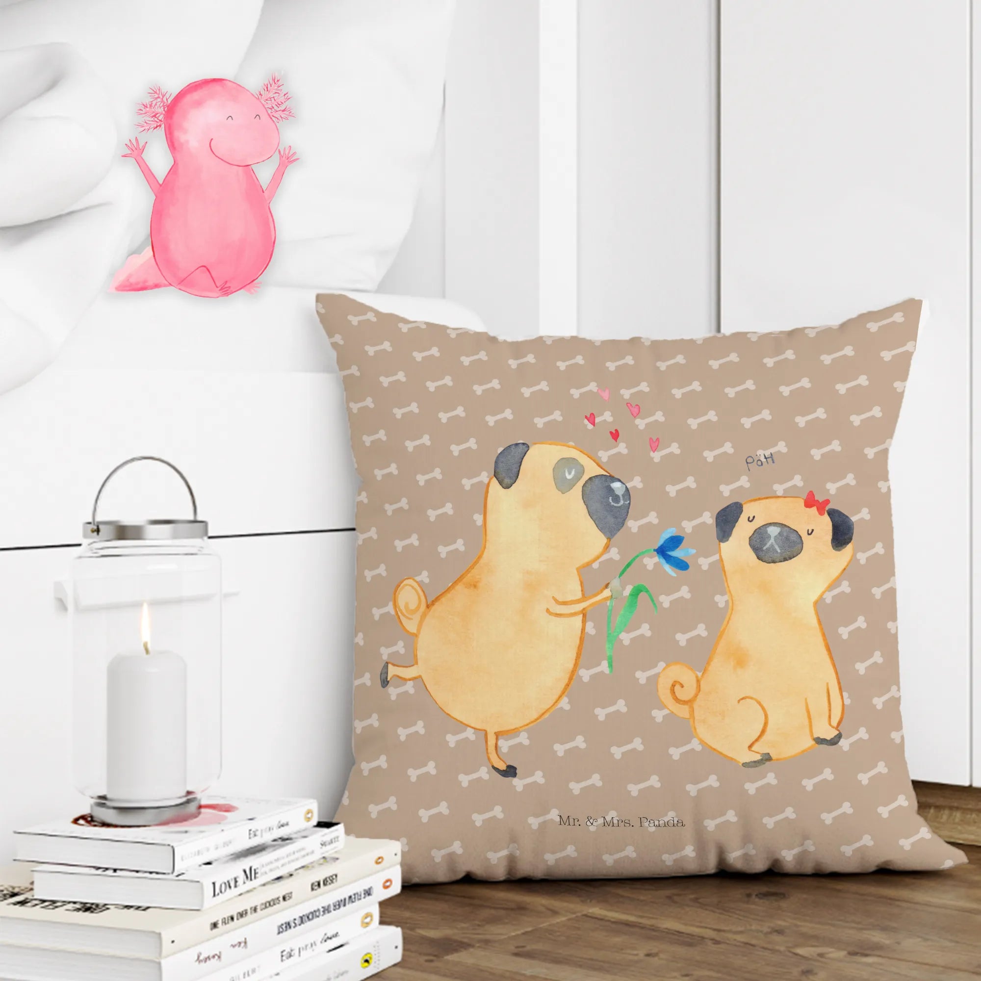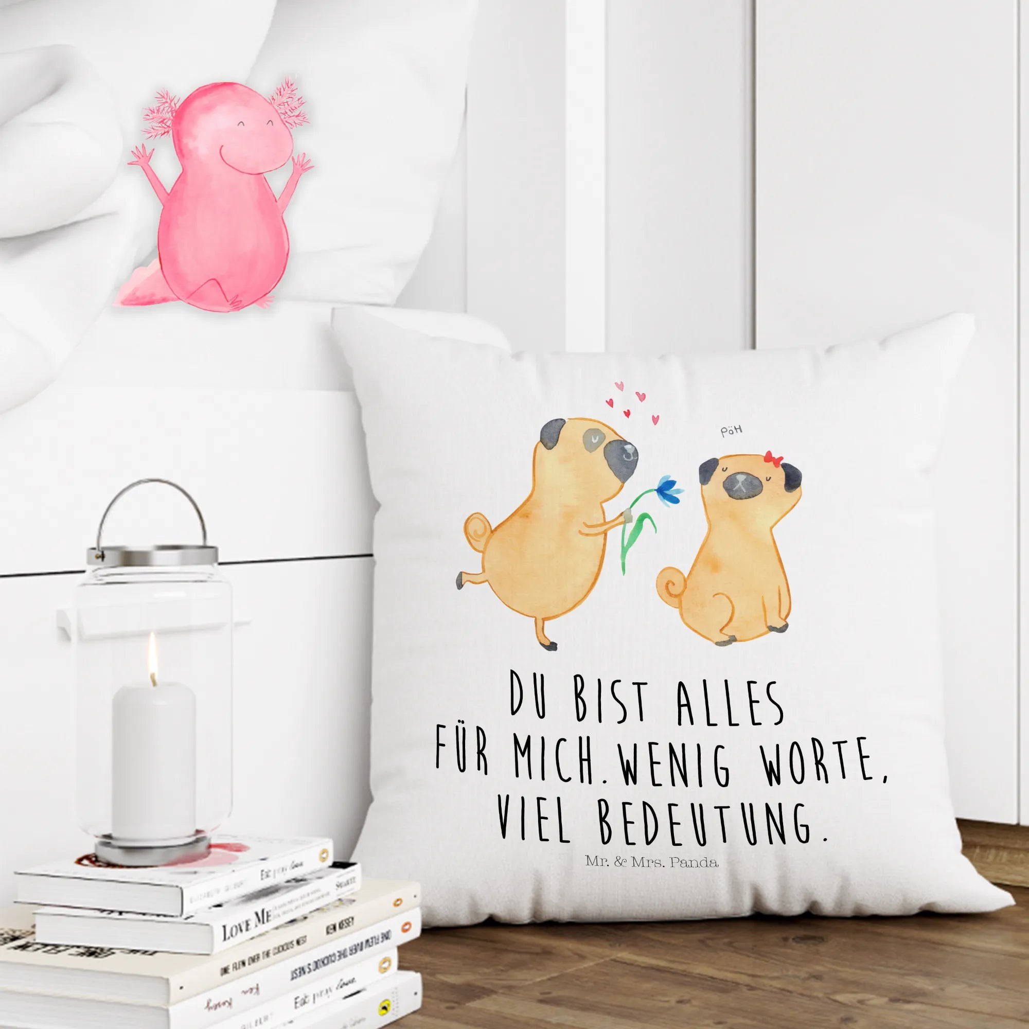 Auf der Kissenhülle prangen zwei süße Möpse, die verliebt dastehen und sich gegenseitig mit einer Blume beschenken. Diese liebevolle Illustration wurde von Mrs. Panda mit viel Herz designed und strahlt pure Freude aus.