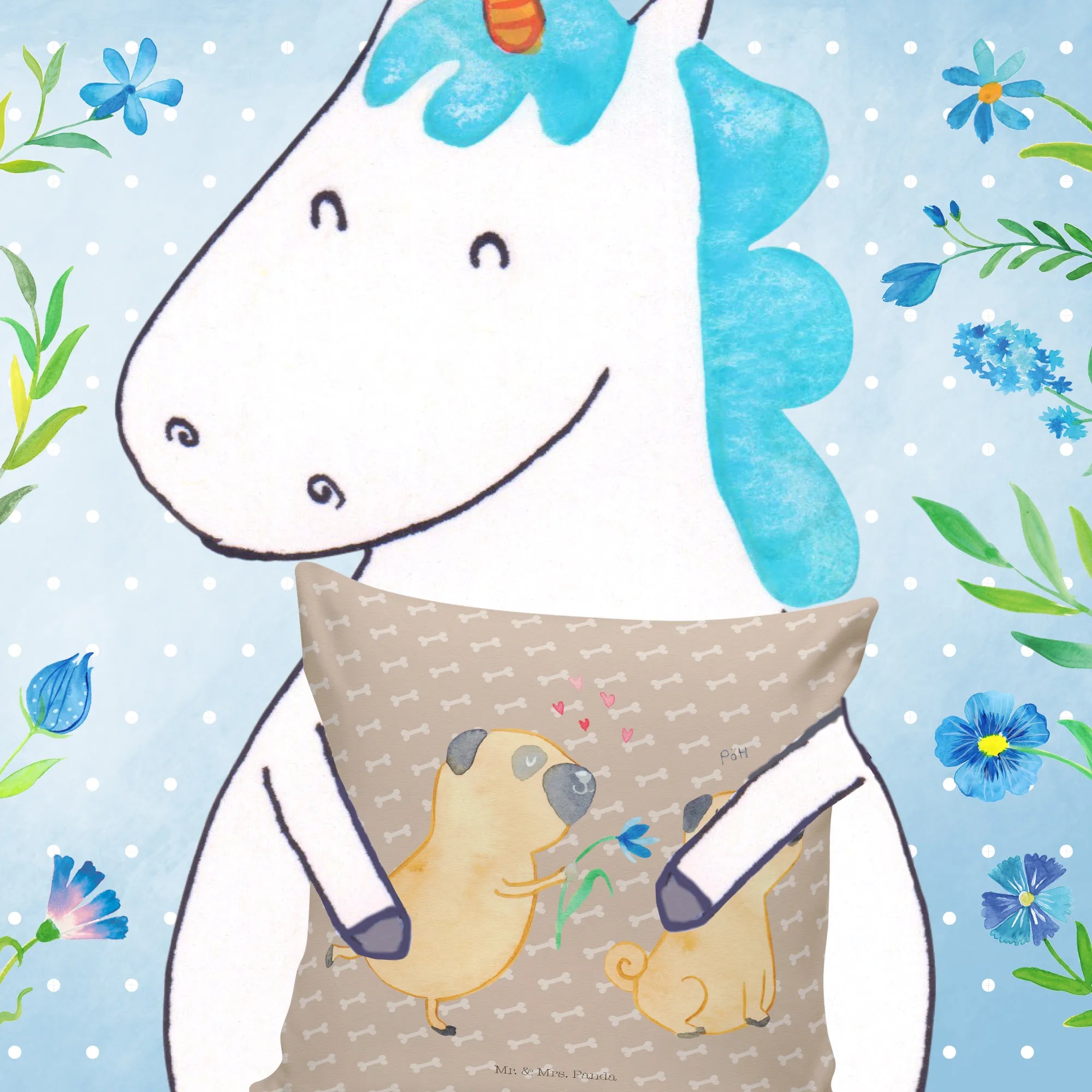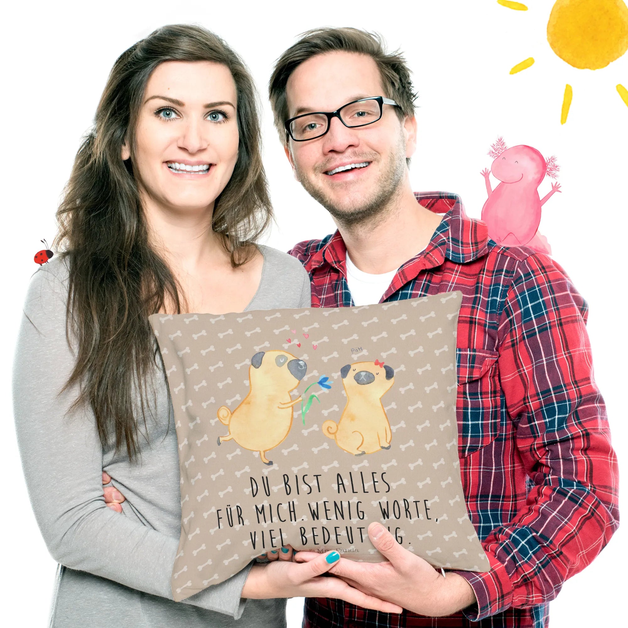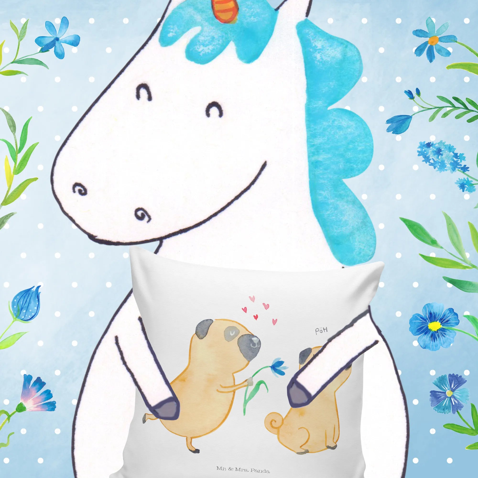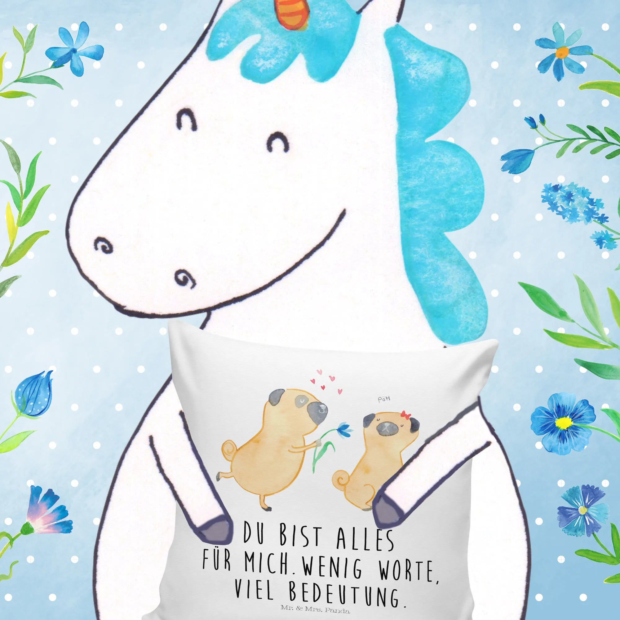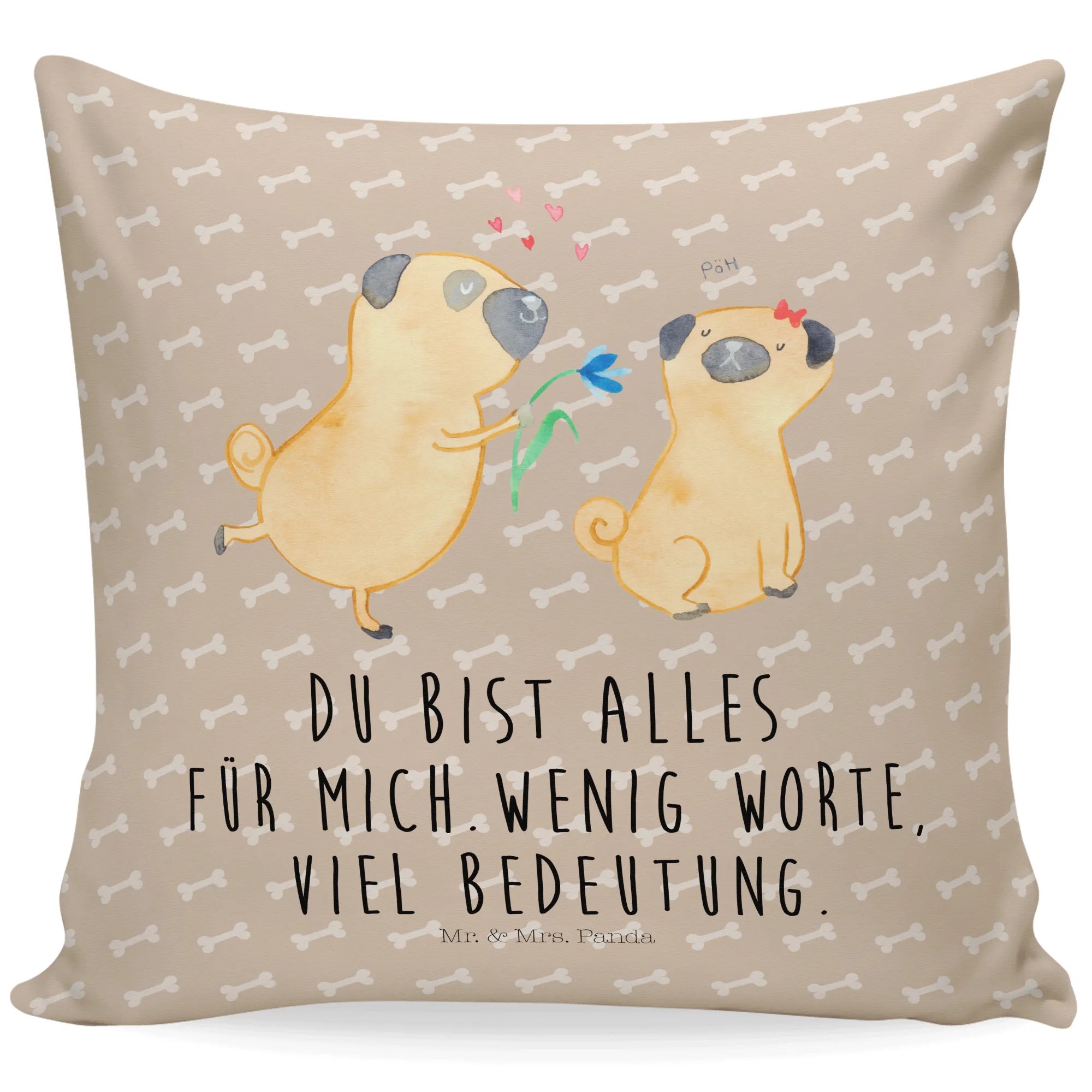 Auf der Kissenhülle prangen zwei süße Möpse, die verliebt dastehen und sich gegenseitig mit einer Blume beschenken. Diese liebevolle Illustration wurde von Mrs. Panda mit viel Herz designed und strahlt pure Freude aus.