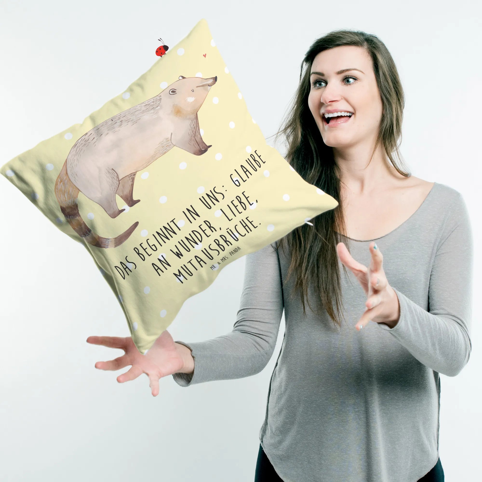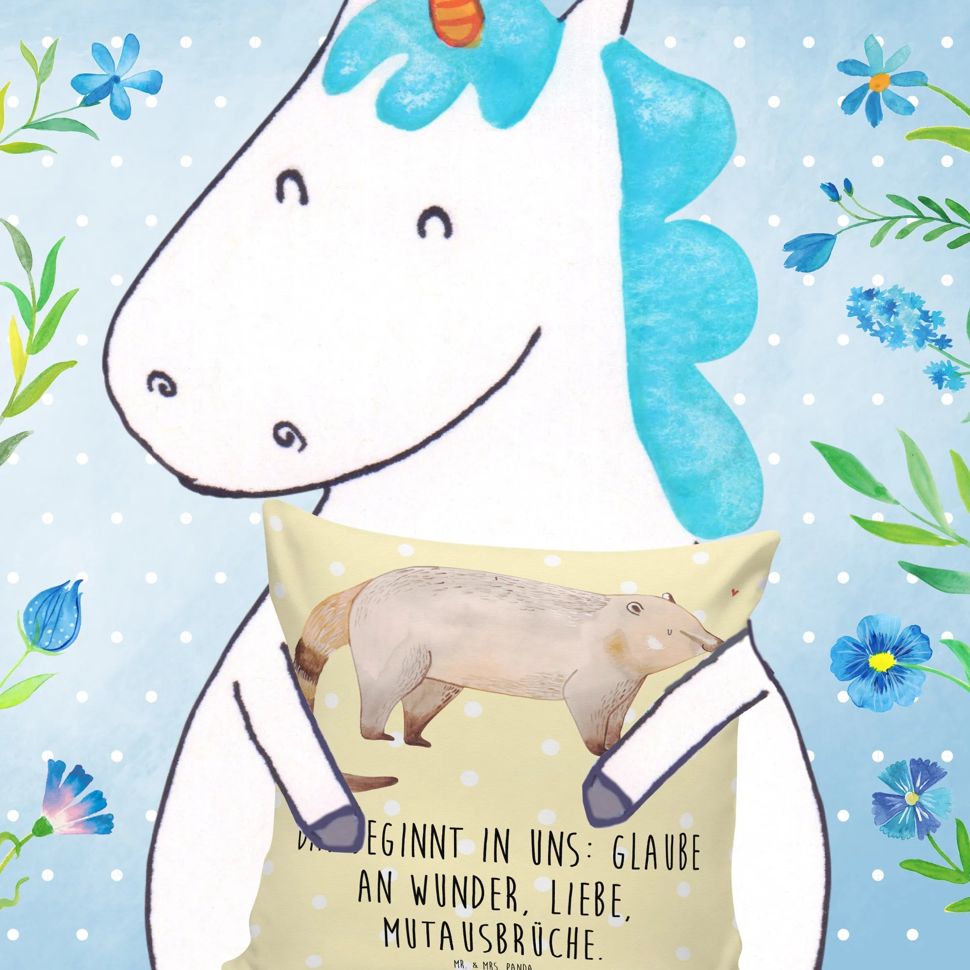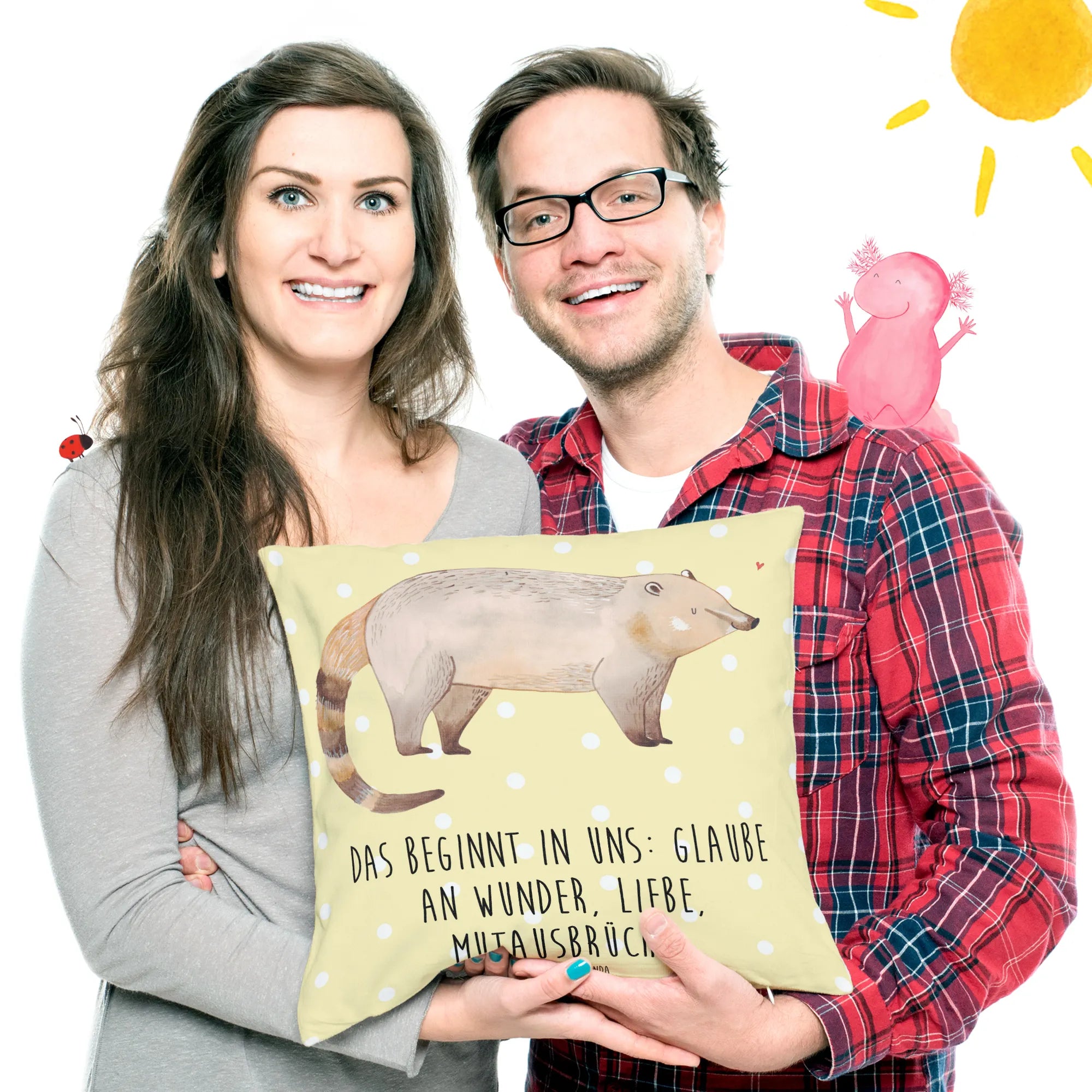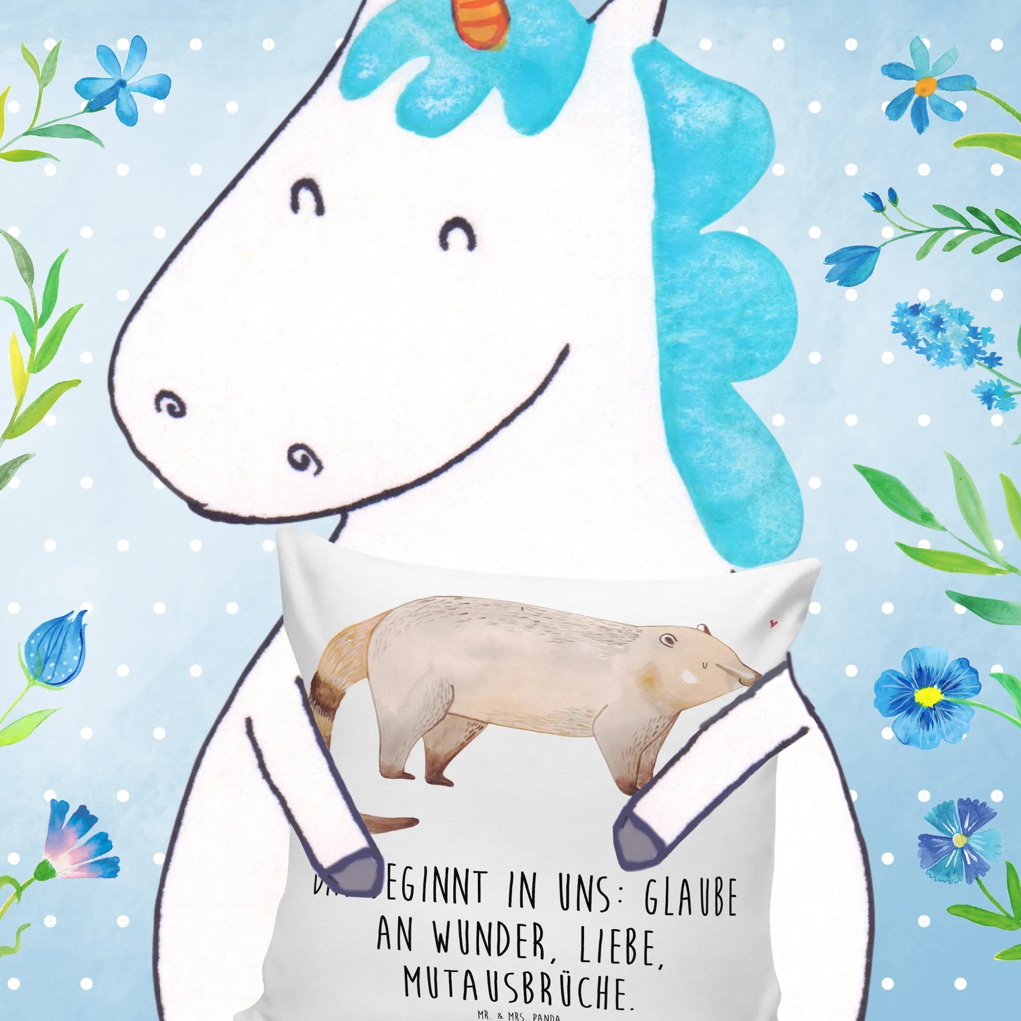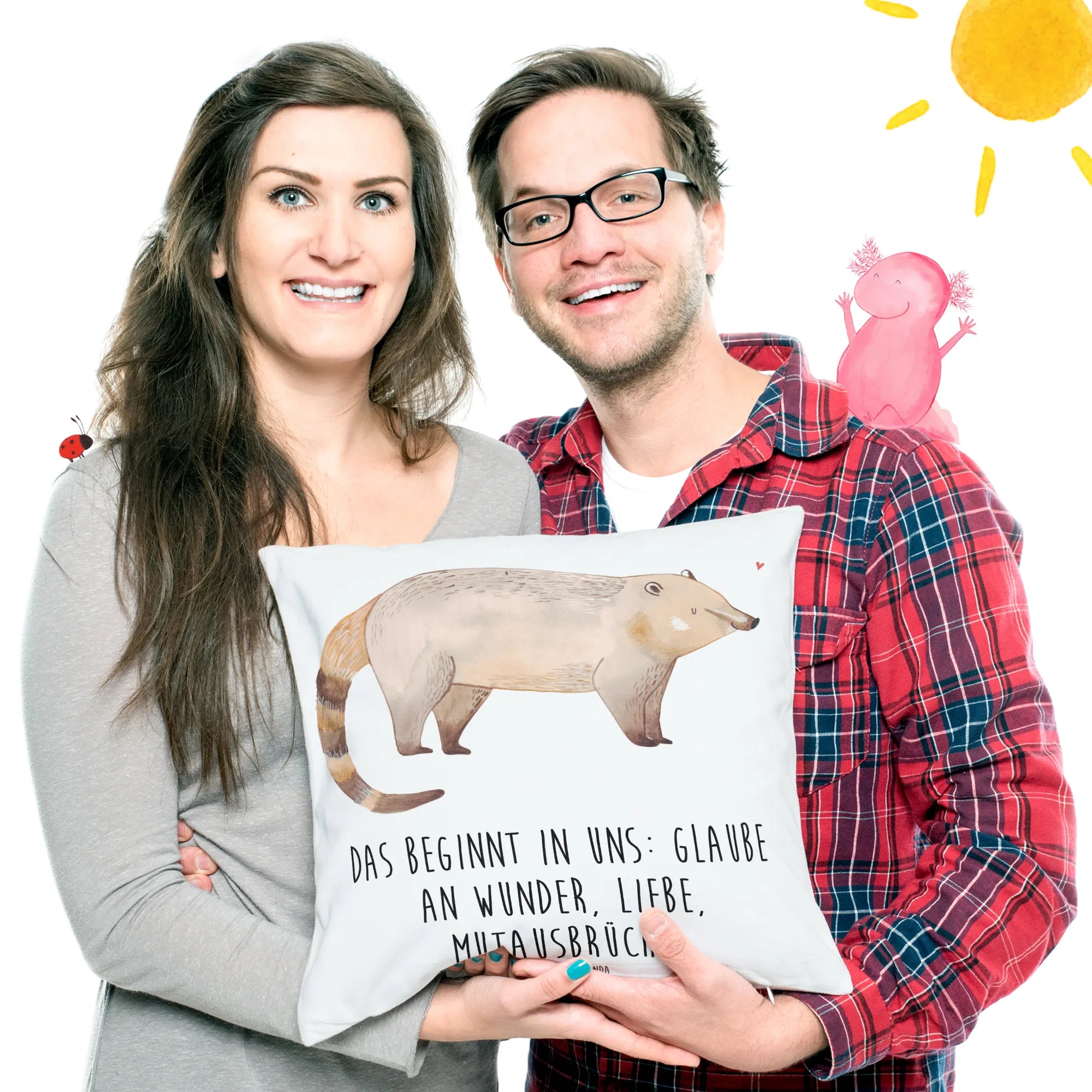 Verschenke Liebe und Freude mit diesem dekorativen Sofakissen, das jeden Raum aufhellt und zum Kuscheln einlädt. Wenn du auf der Suche nach einem besonderen Geschenk bist, das sowohl stilvoll als auch herzerwärmend ist, dann ist das Nasenbär-Kissen genau das Richtige für dich! Es bringt nicht nur Farbe und guten Geschmack in dein Zuhause, sondern verbreitet auch gute Laune. Mach jemandem eine Freude oder gönne dir selbst dieses wunderbare Stück aus der Welt von Mr. & Mrs. Panda – der perfekte Mix aus Komfort, Stil und Freude in einem Kissen.