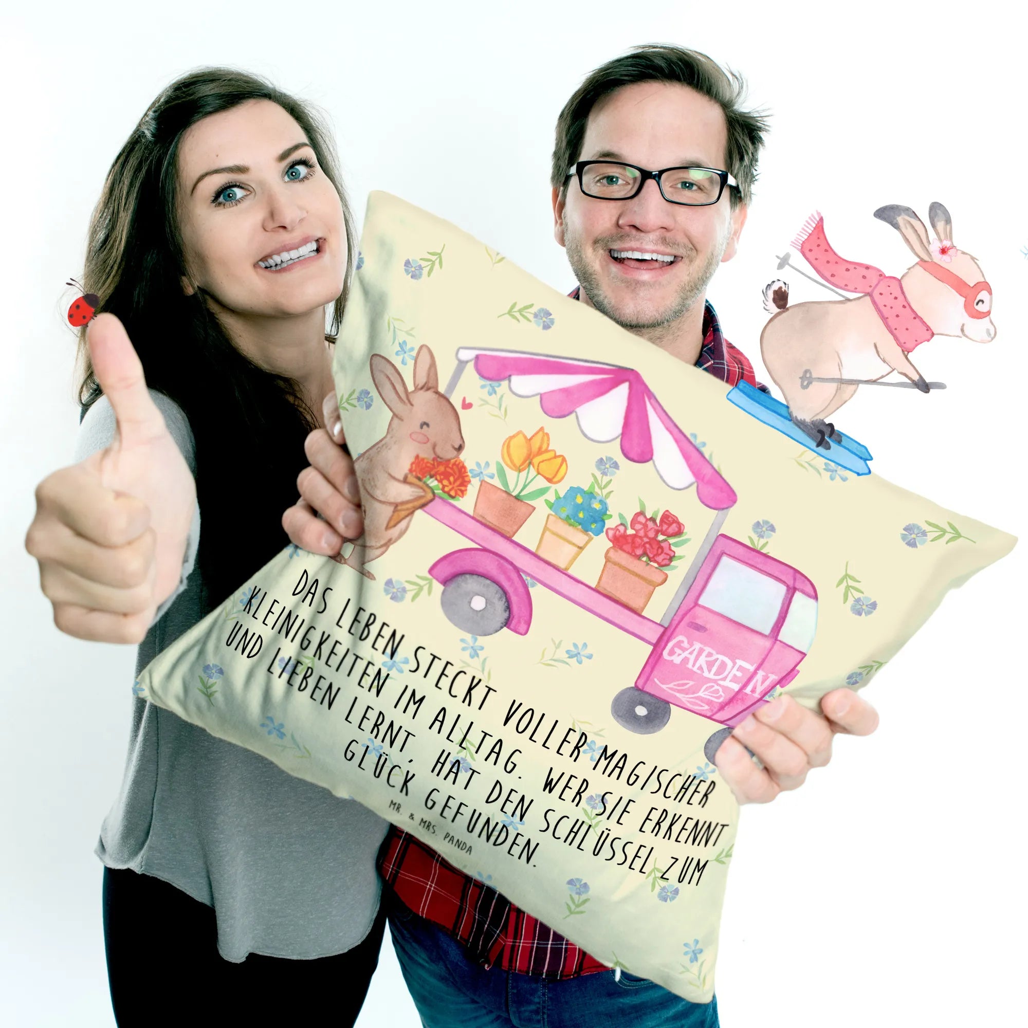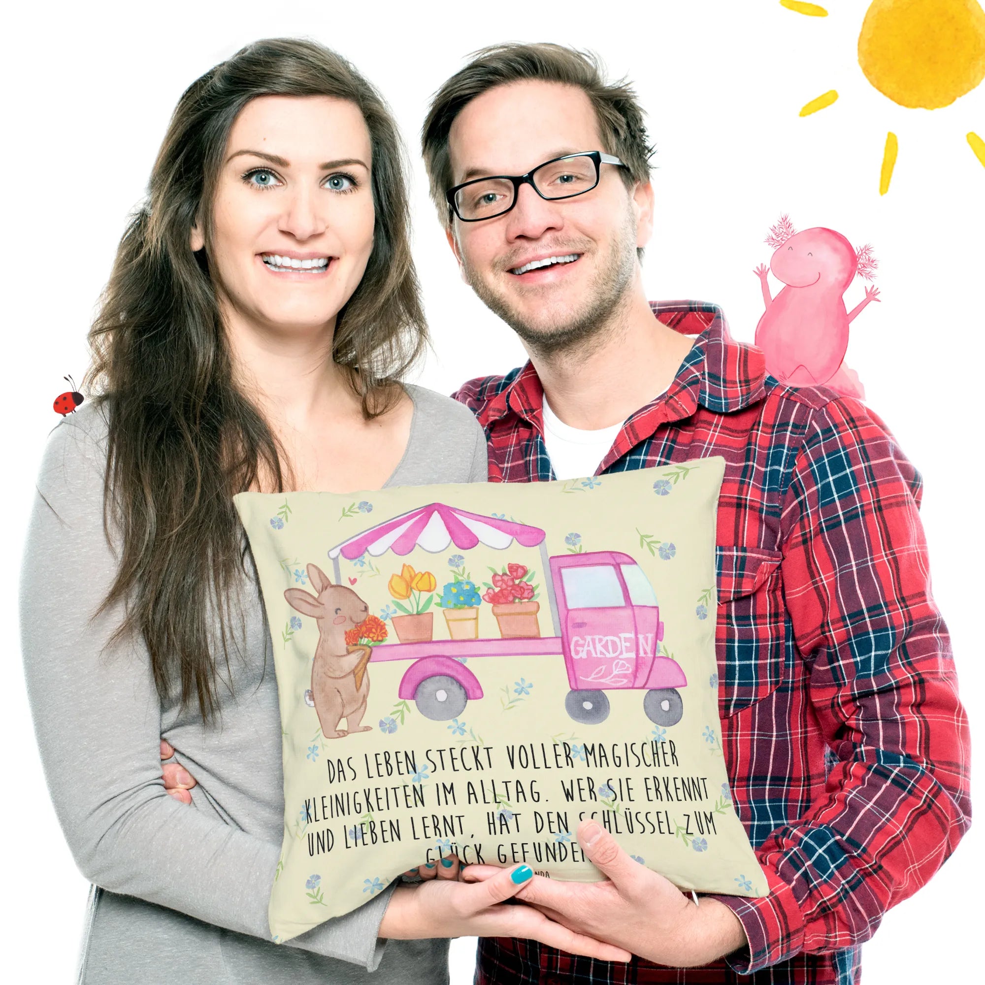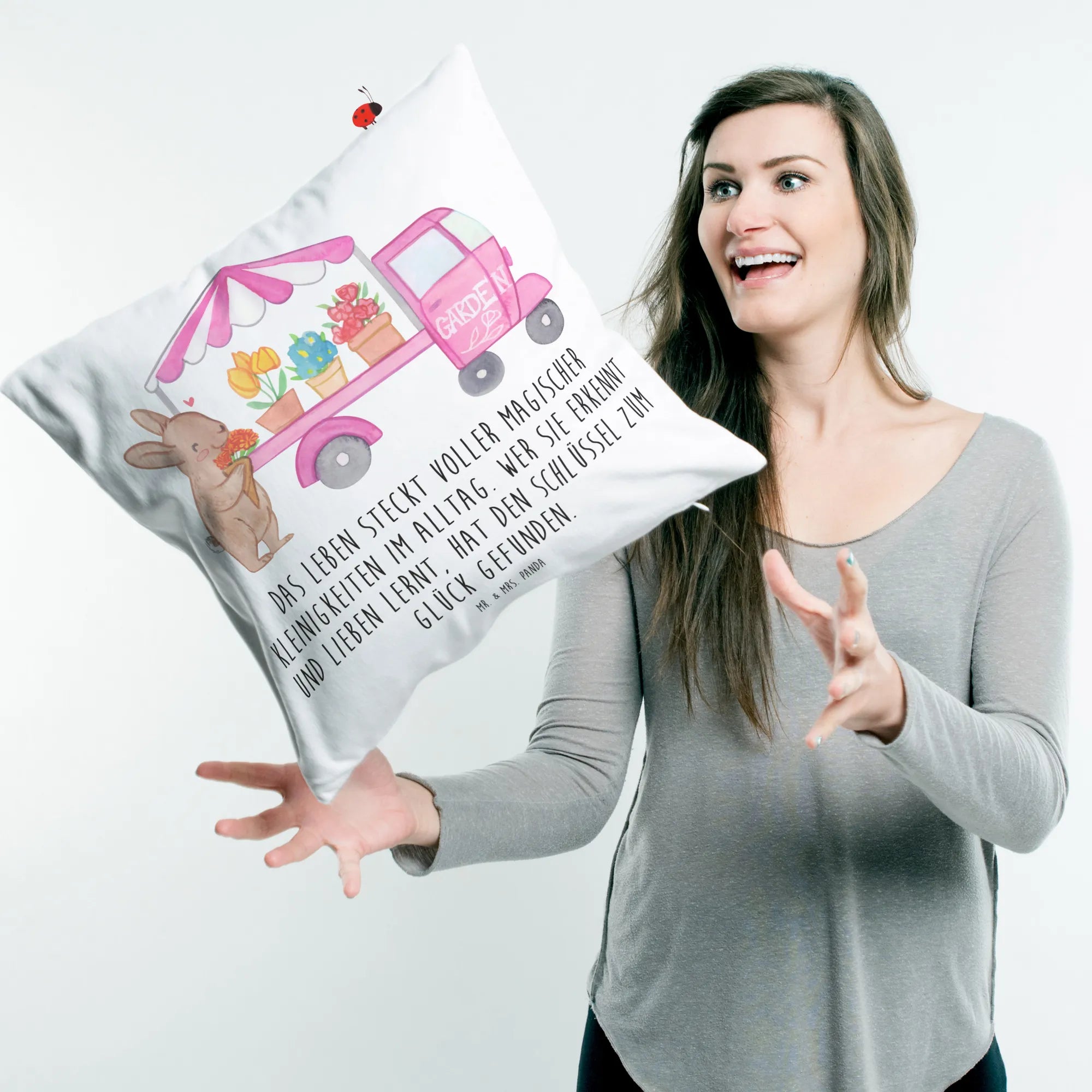 Der Hase hält liebevoll einen Strauß von orange-roten Blumen und der Wagen ist vollgepackt mit strahlenden Tulpen und einer Vielzahl von Blumen, die das Bild farbenfroh abrunden. 🌷 Das Kissen ist aus superfluschiger Mikrofaser gefertigt und bietet höchsten Komfort. Es eignet sich hervorragend als Sofakissen, Dekokissen oder einfach als süßes Kuschelkissen für dein Zuhause.