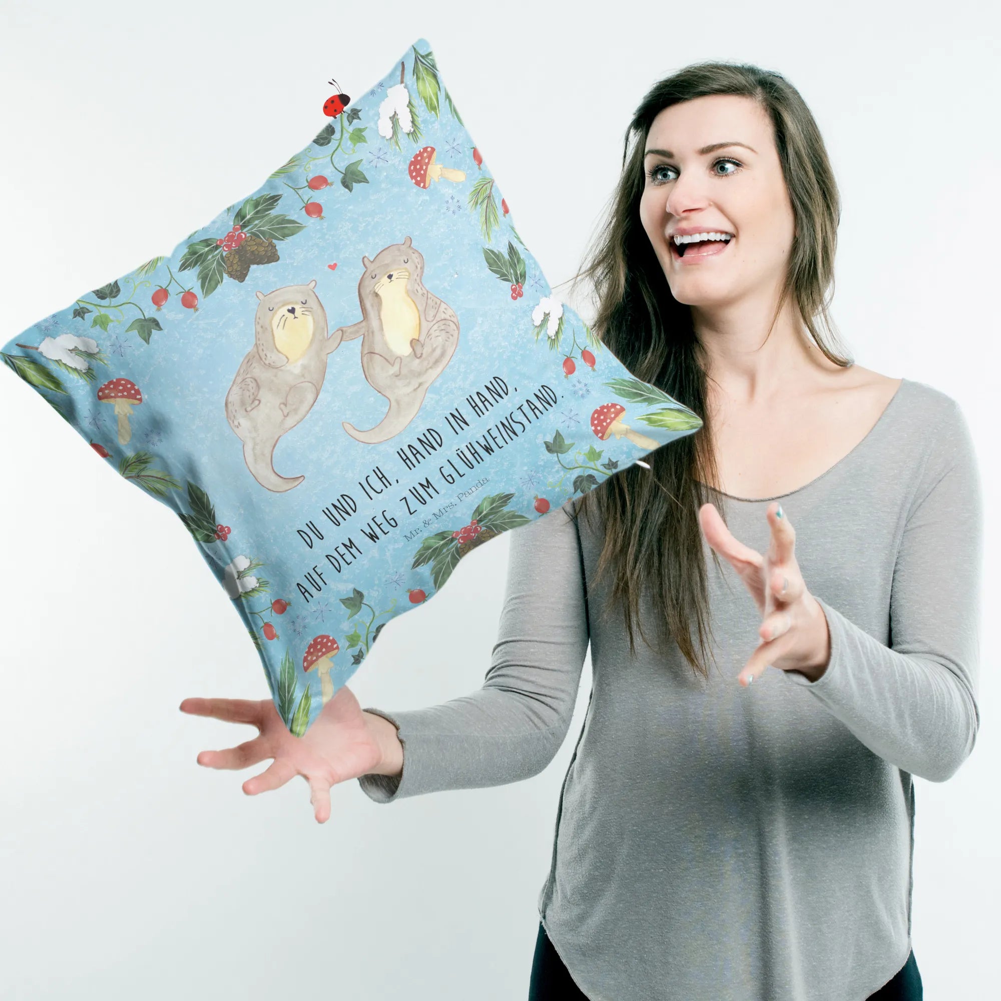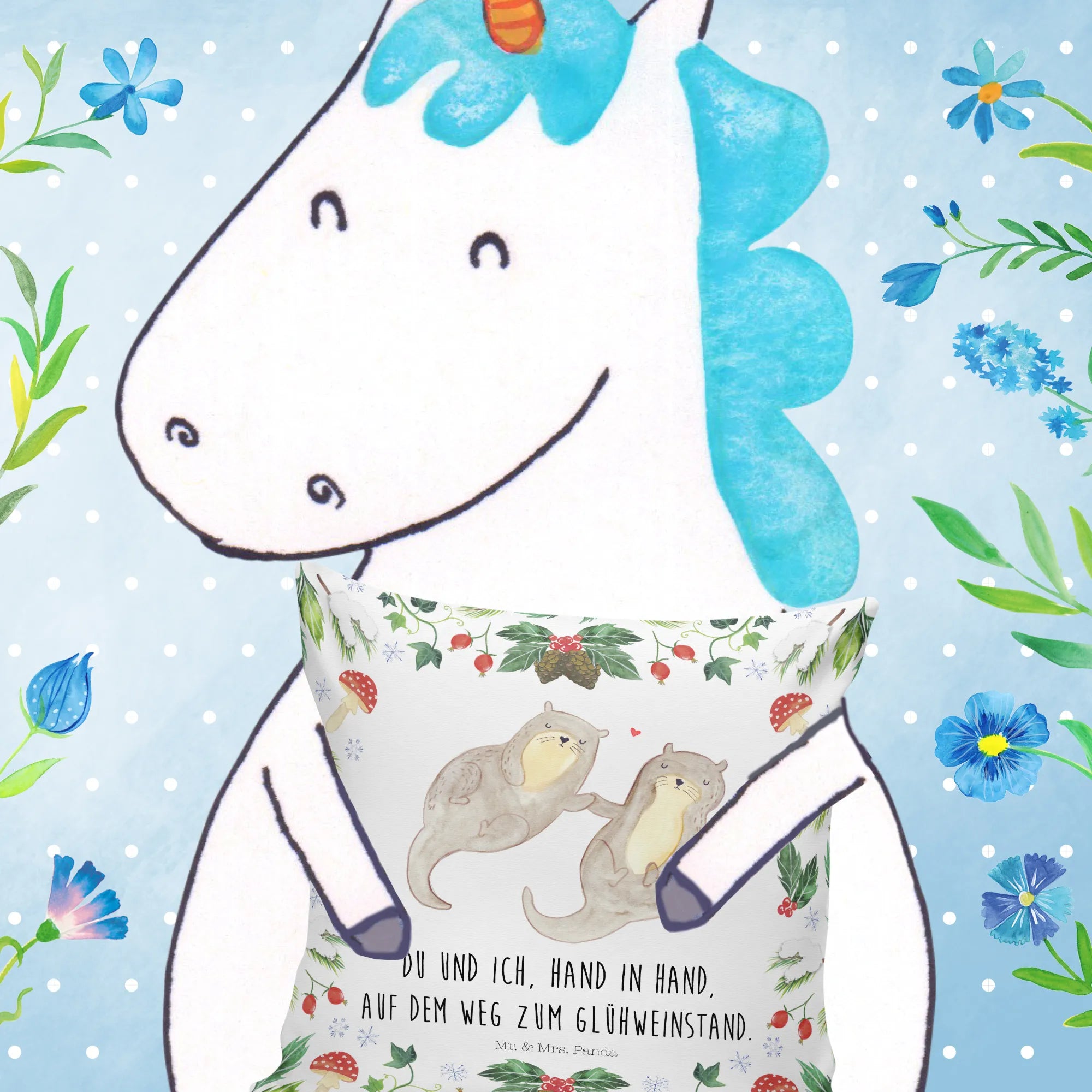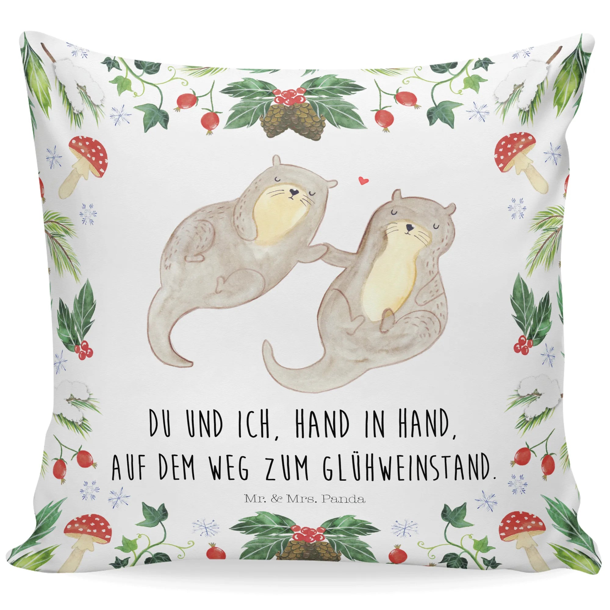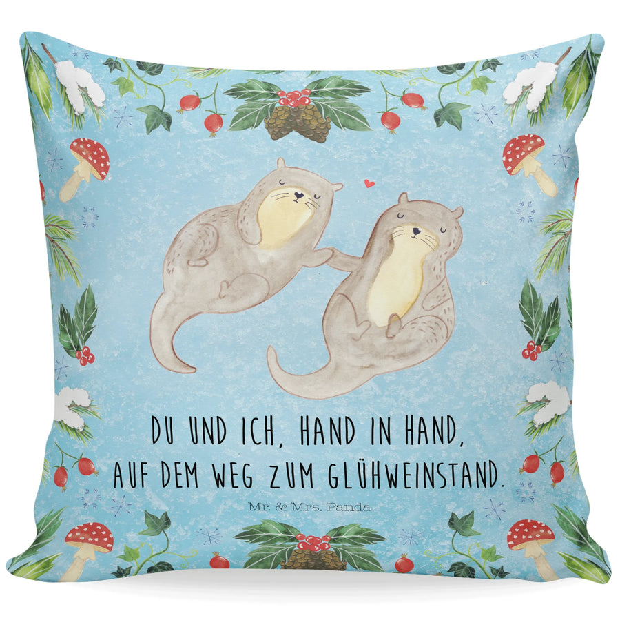Das Kuschelkissen "Otter Glühweinstand" aus der Winter Kollektion von Mr. & Mrs. Panda ist das perfekte Geschenk für alle, die die winterliche Gemütlichkeit lieben!