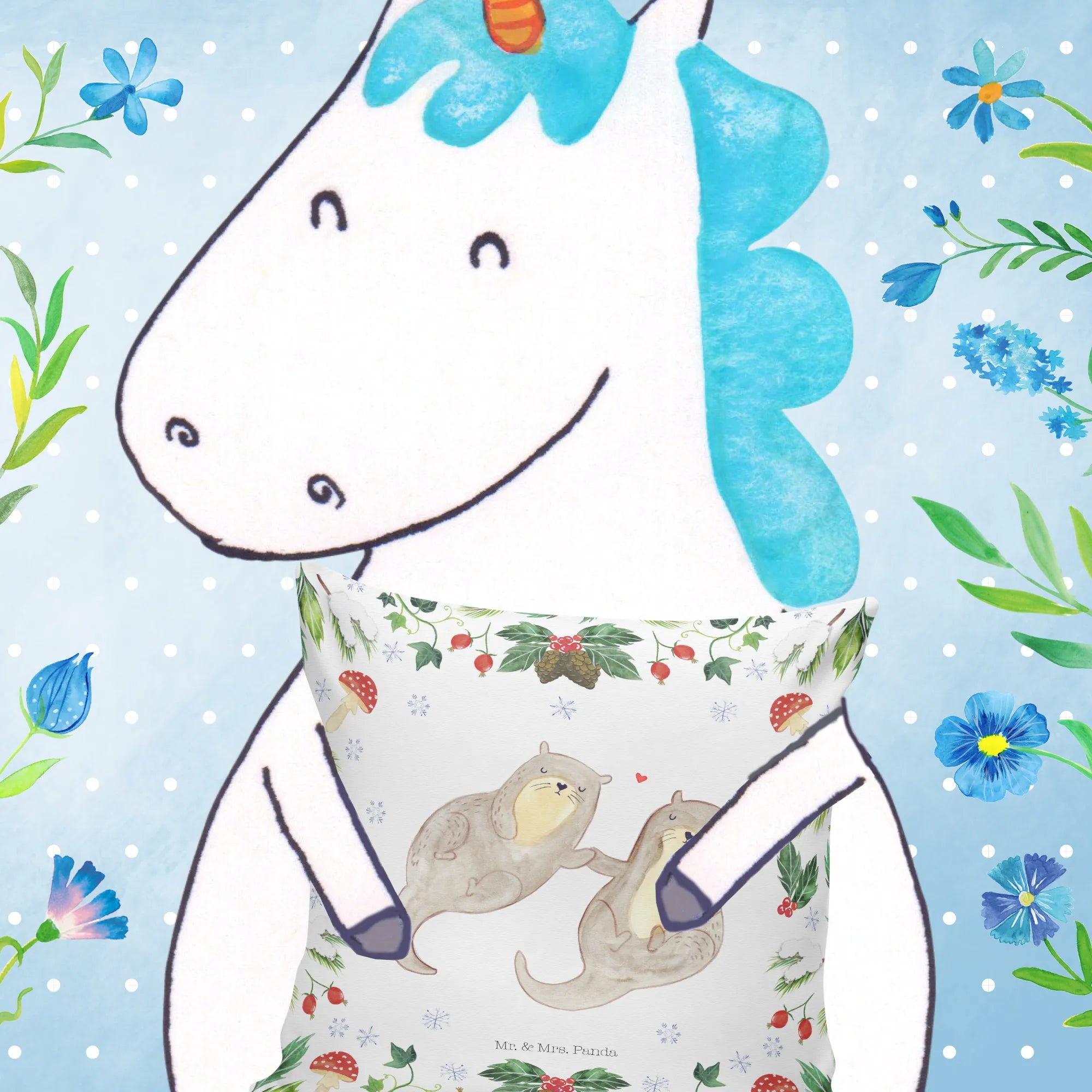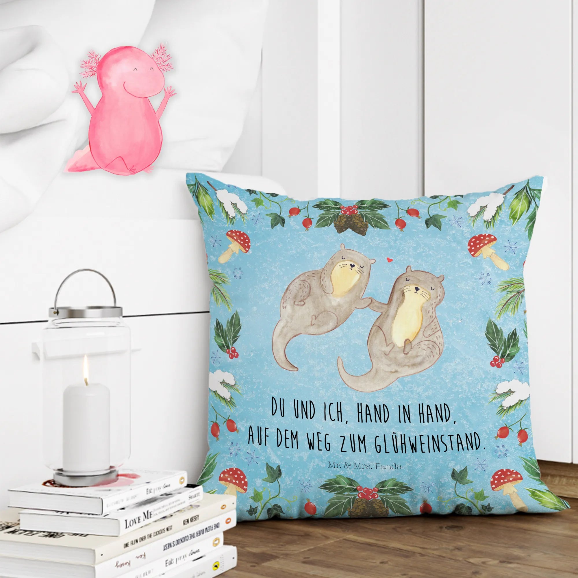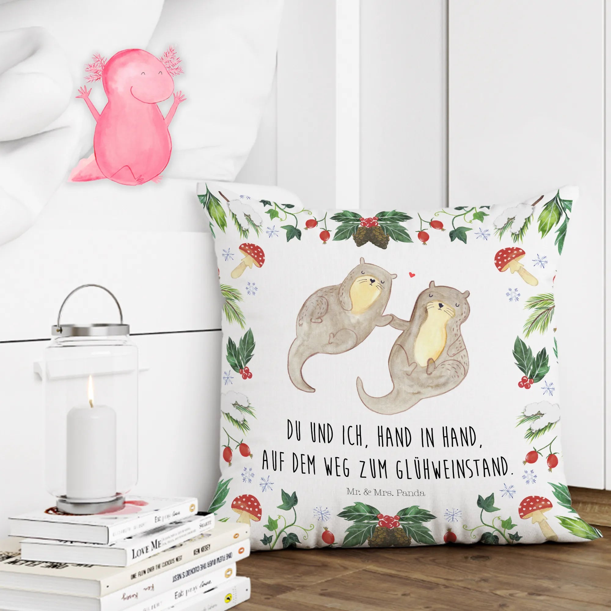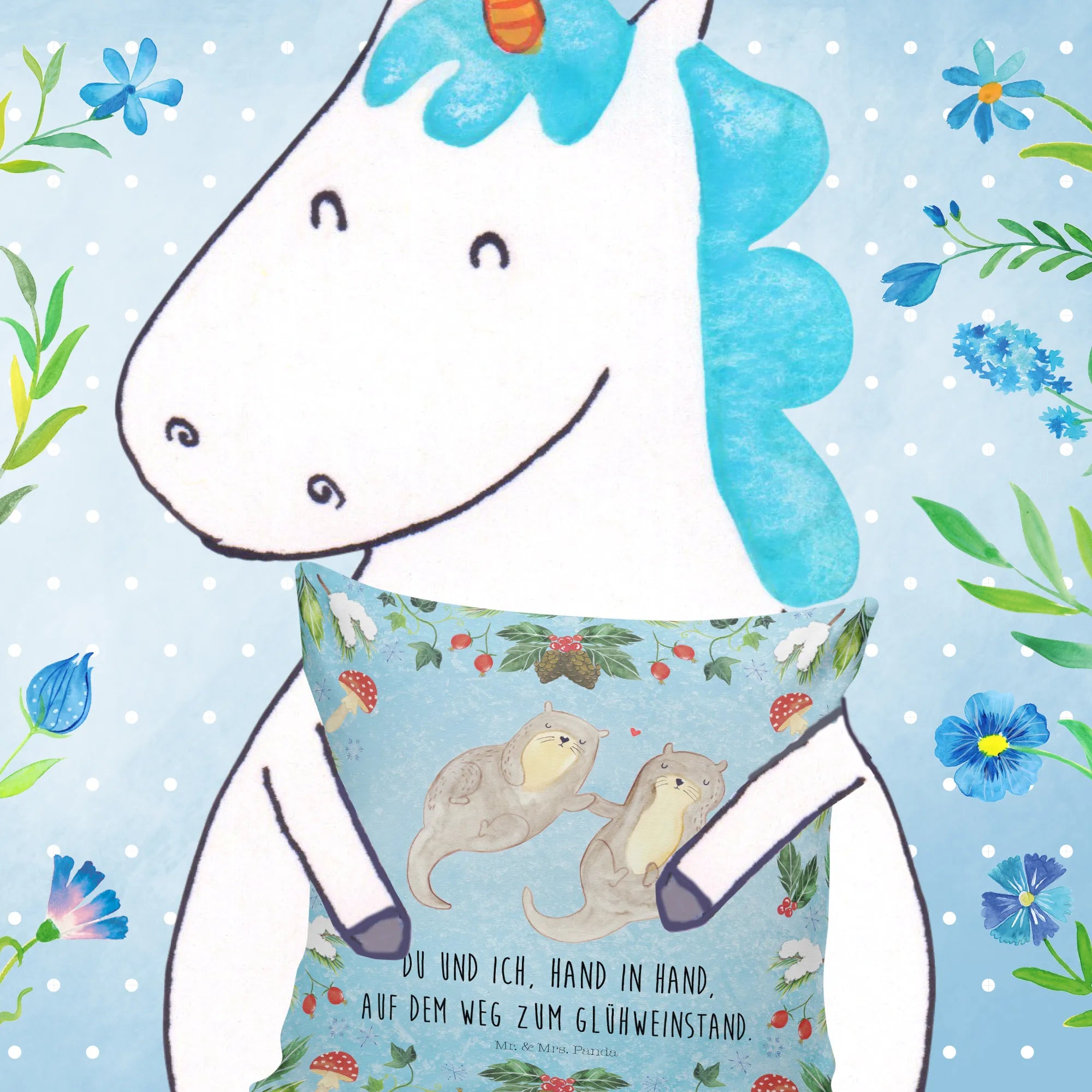 Das Kuschelkissen "Otter Glühweinstand" aus der Winter Kollektion von Mr. & Mrs. Panda ist das perfekte Geschenk für alle, die die winterliche Gemütlichkeit lieben!
