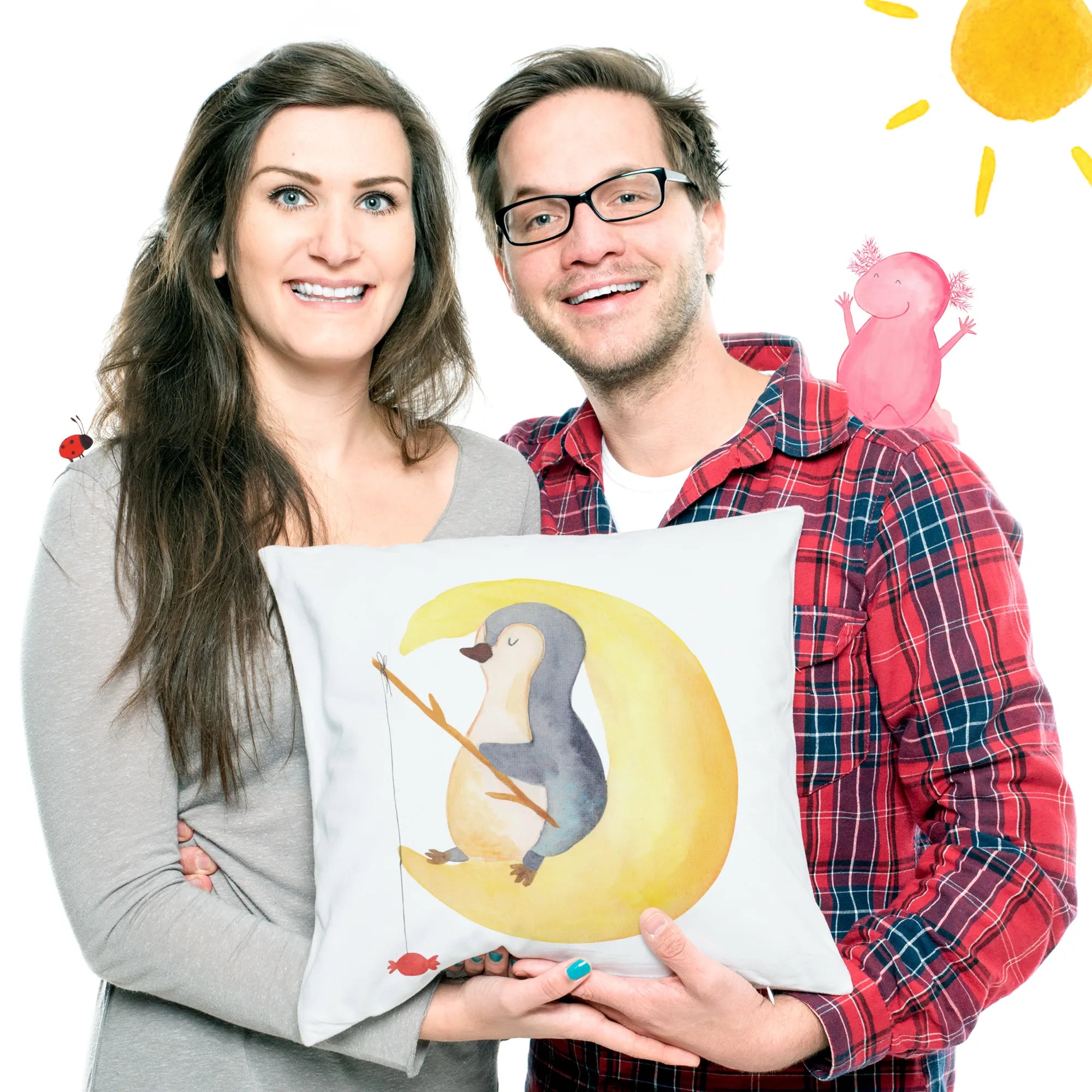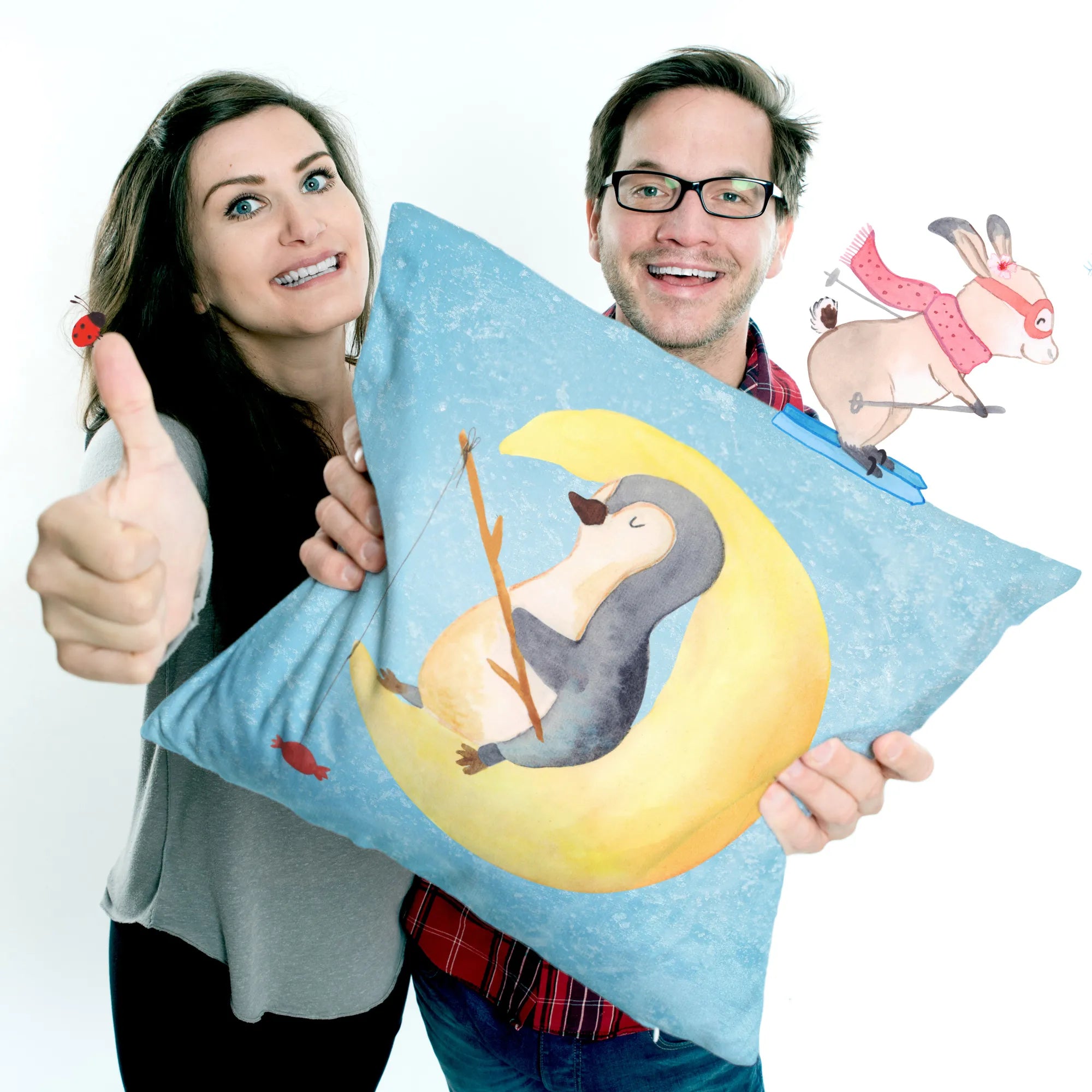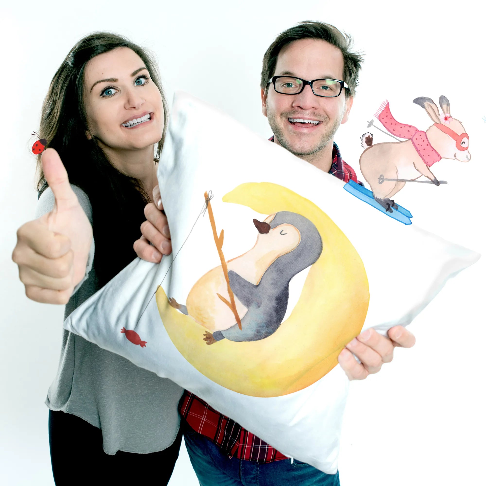 Das Kissen "Pinguin Mond" von Mr. & Mrs. Panda ist der perfekte Begleiter für gemütliche Stunden auf der Couch oder im Schlafzimmer. Die süße Illustration eines Pinguins, der entspannt auf einer Mondsichel sitzt und mit einer Angel nach Sternen angelt, bringt eine ganz besondere Stimmung in jedes Zuhause.