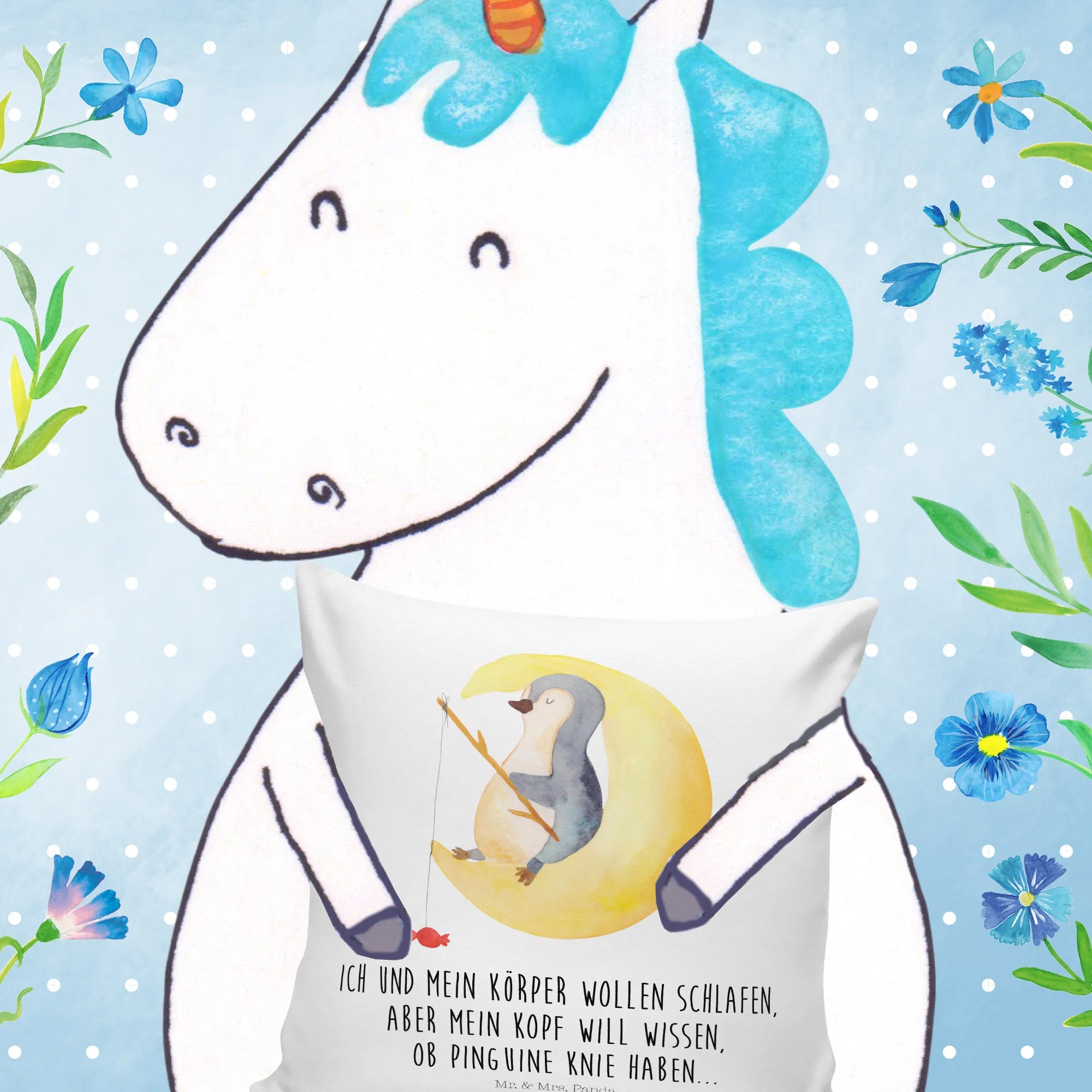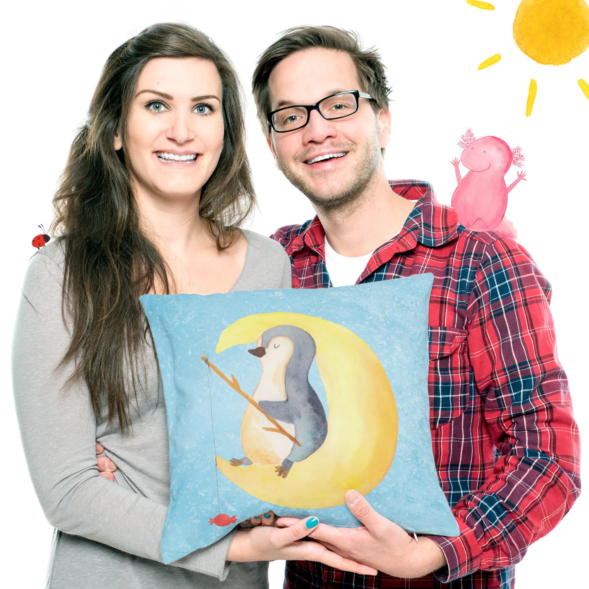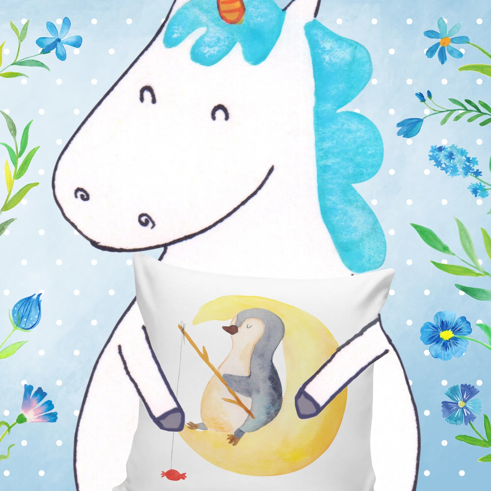 Das Kissen "Pinguin Mond" von Mr. & Mrs. Panda ist der perfekte Begleiter für gemütliche Stunden auf der Couch oder im Schlafzimmer. Die süße Illustration eines Pinguins, der entspannt auf einer Mondsichel sitzt und mit einer Angel nach Sternen angelt, bringt eine ganz besondere Stimmung in jedes Zuhause.