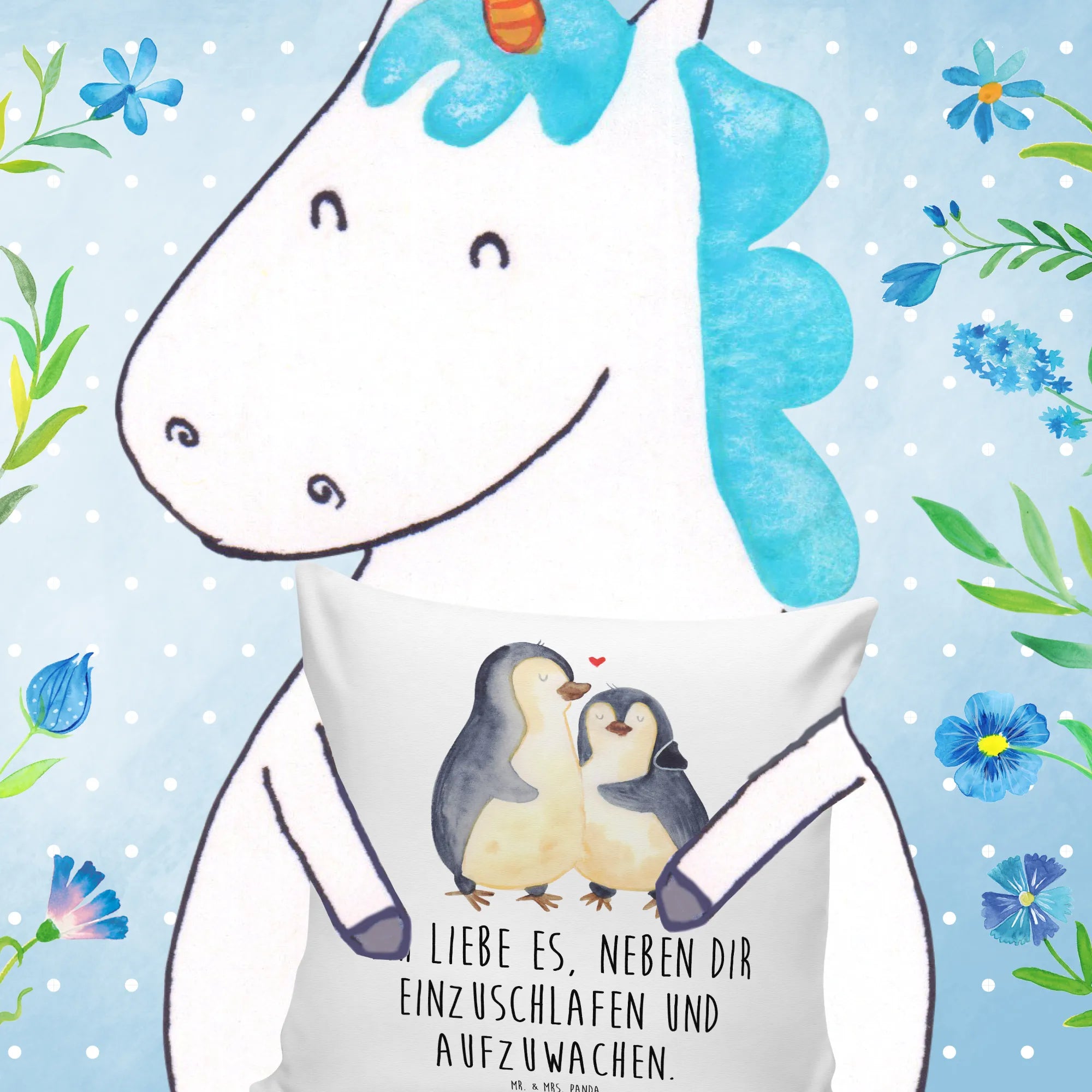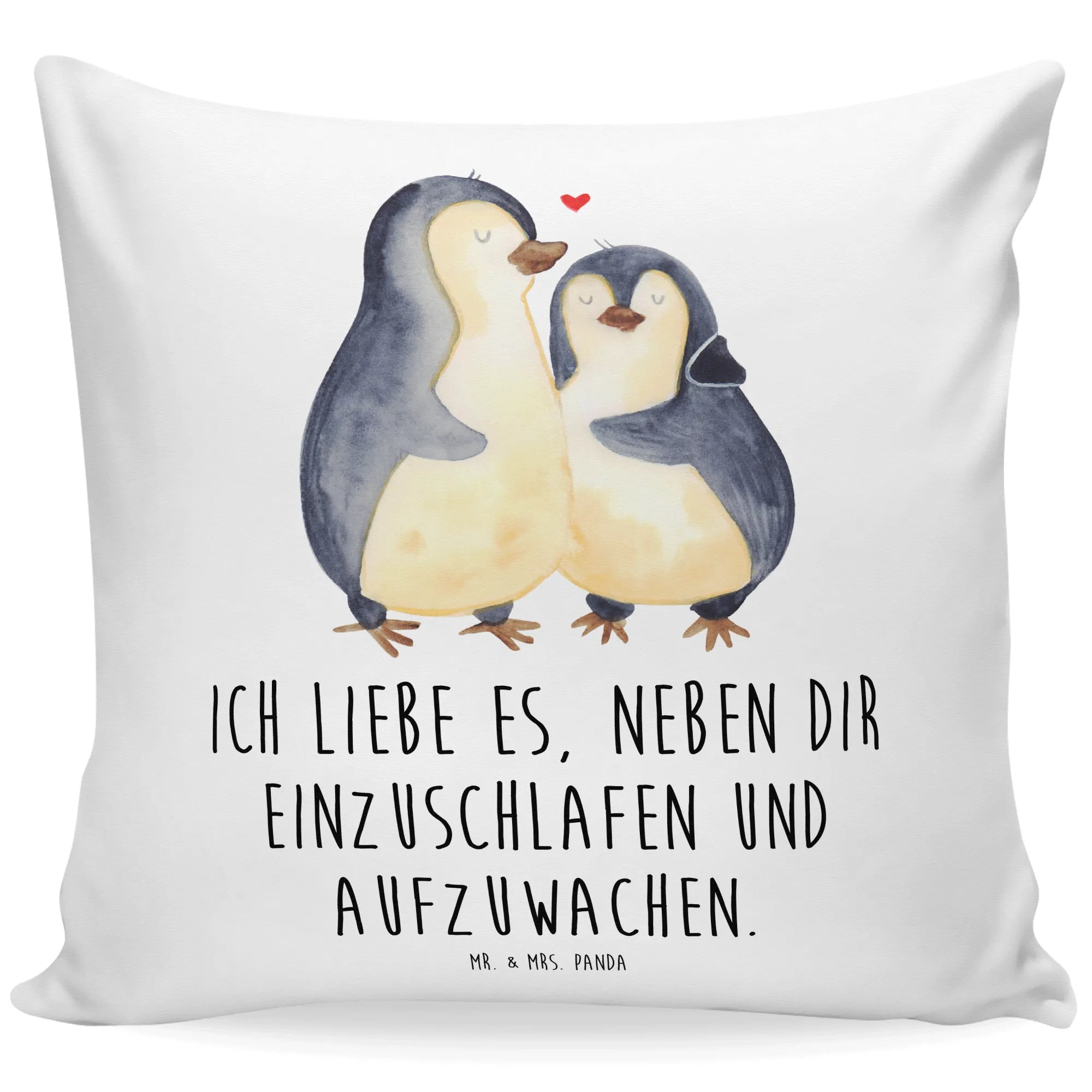 Das 40x40 Kissen "Pinguine Einschlafen" aus der Liebe Kollektion von Mr. & Mrs. Panda ist das ideale Geschenk für alle, die die süße Zweisamkeit lieben. Du wirst begeistert sein von den beiden kuschelnden Pinguinen, die sich in einem romantischen Aquarell-Stil umarmen – genau das richtige Motiv für eine liebevolle Botschaft!