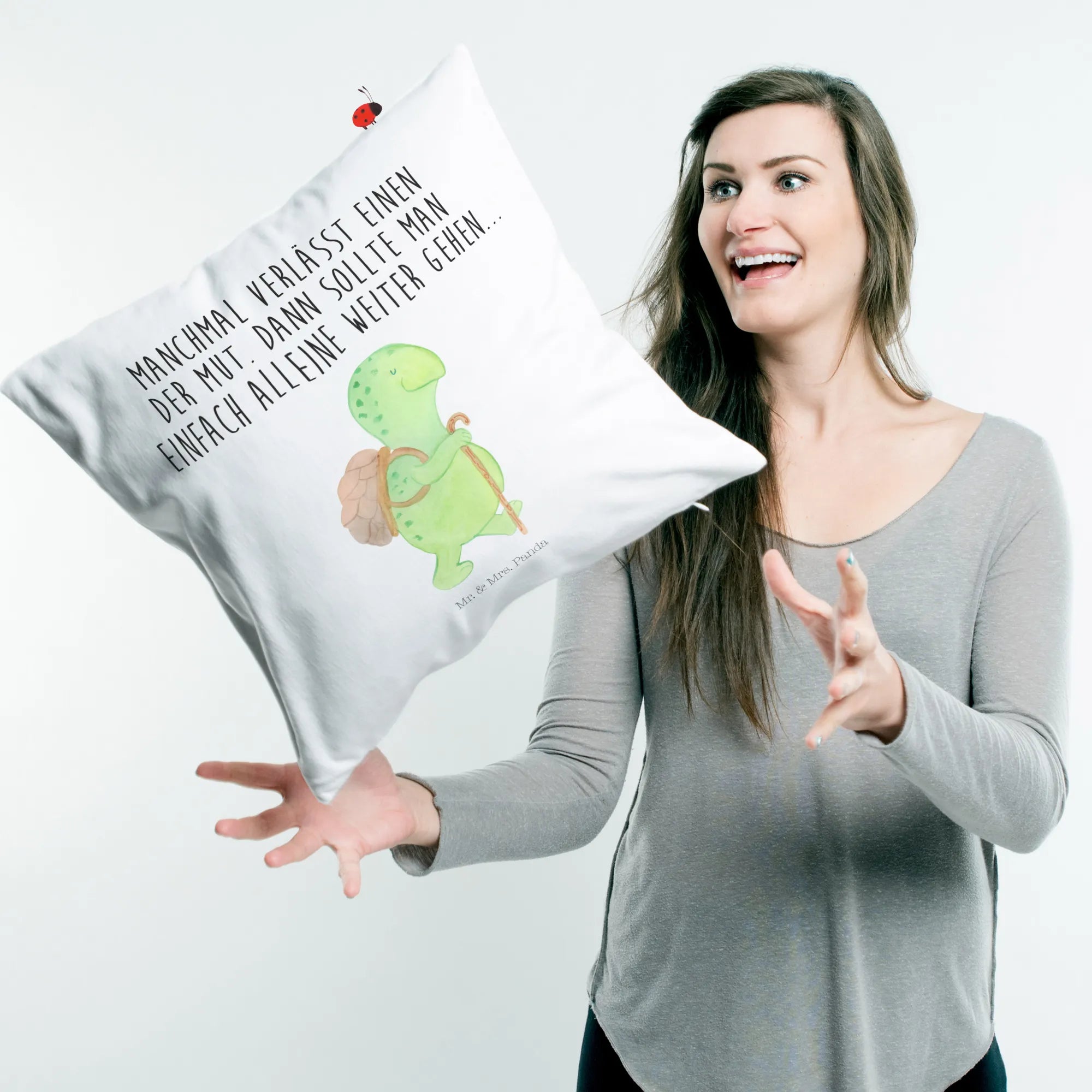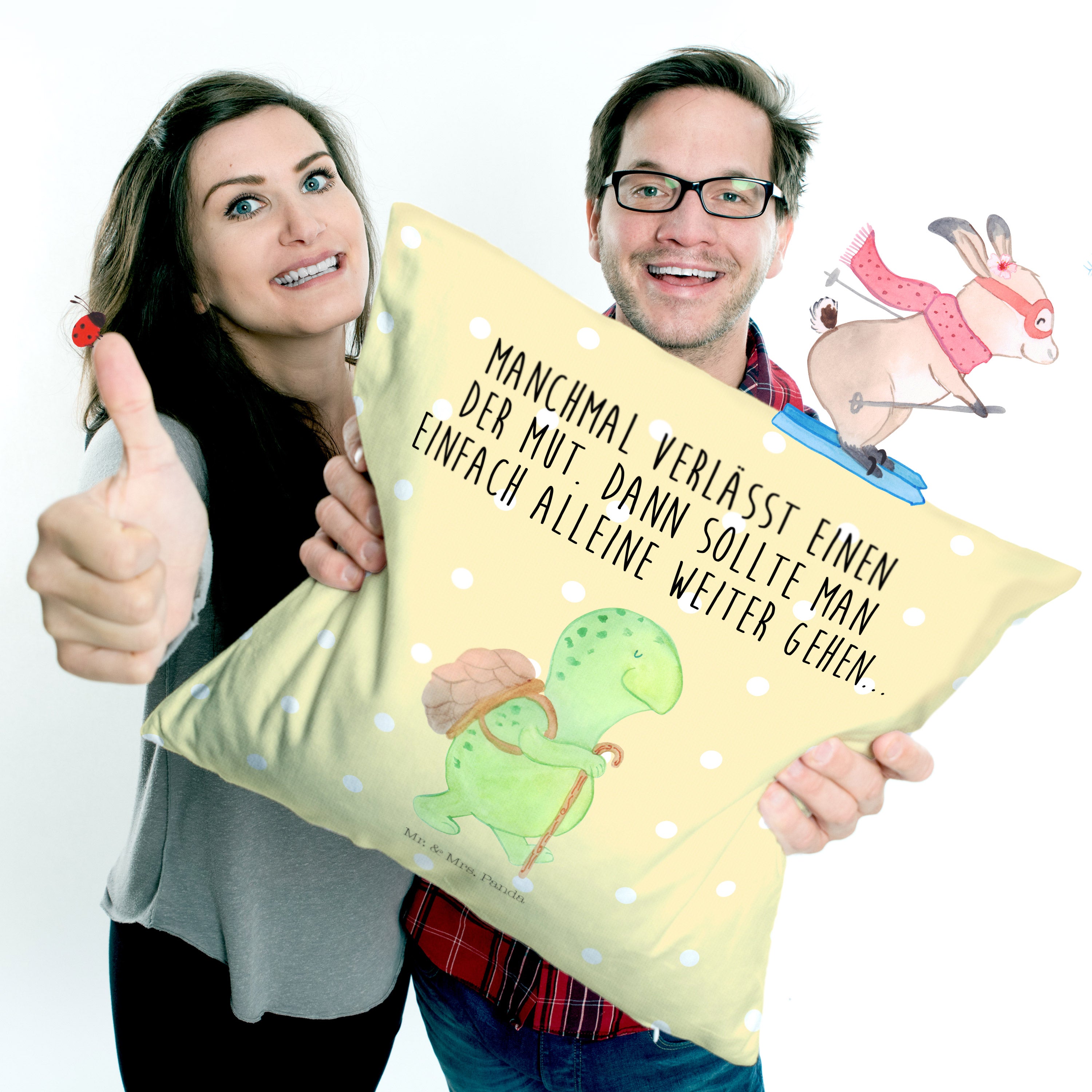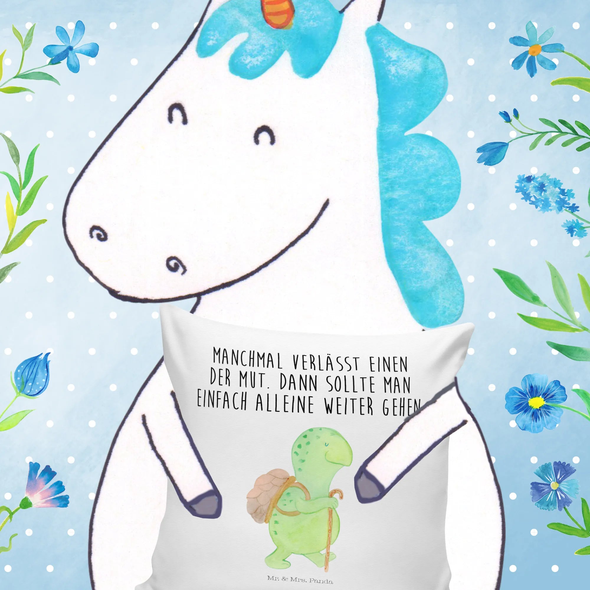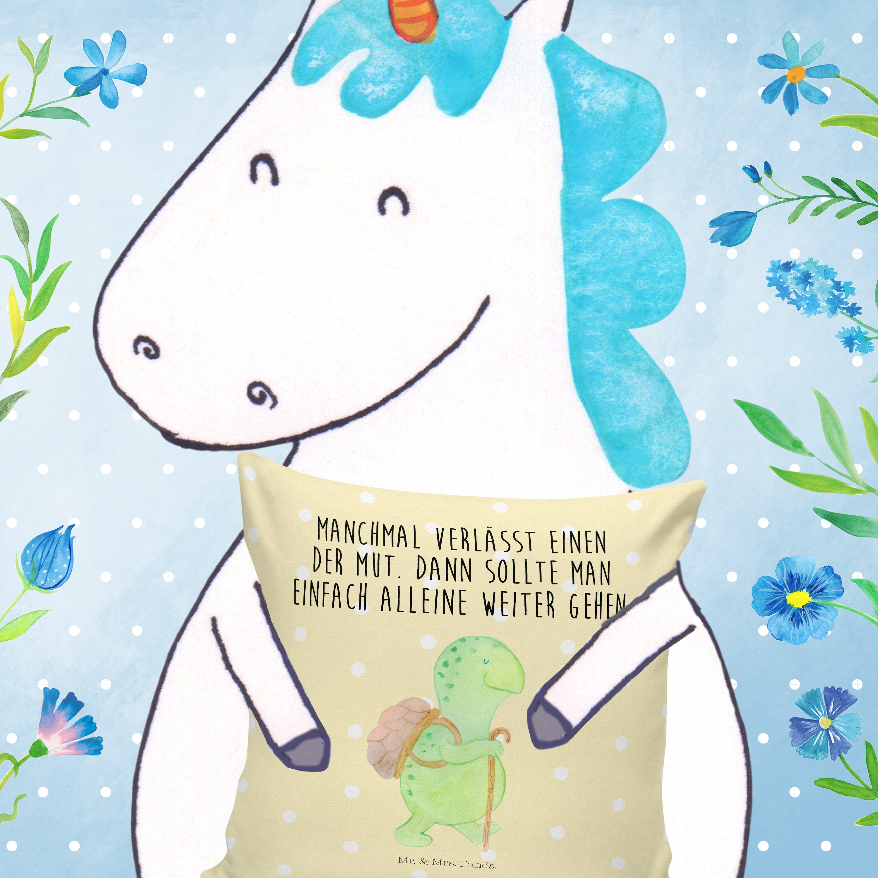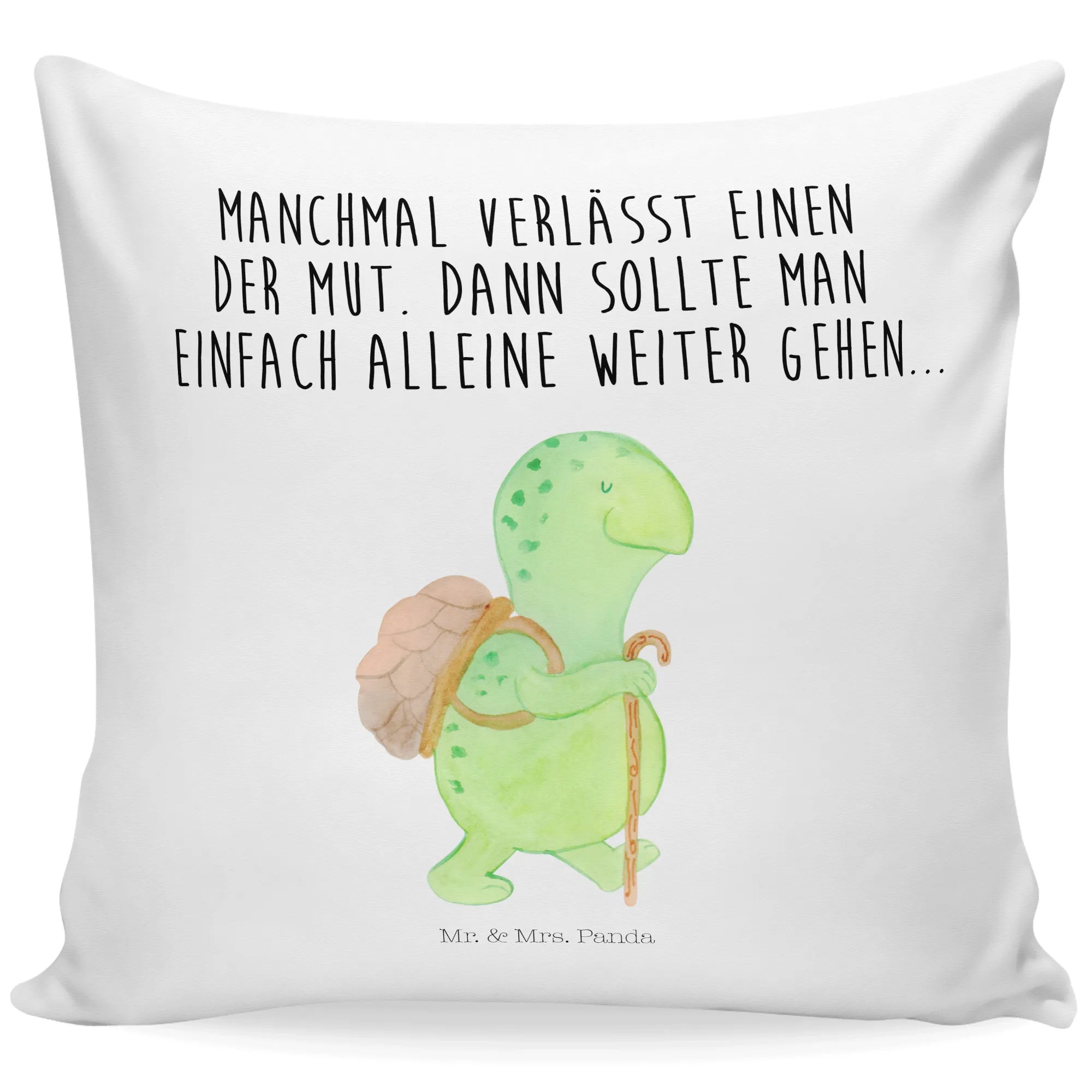 Das 40x40 Kissen mit dem bezaubernden Motiv „Schildkröte Wanderer“ von Mr. & Mrs. Panda ist das perfekte Geschenk für alle, die Abenteuer und Inspiration lieben. Diese süße Schildkröte, die ihren Panzer wie einen kleinen Rucksack trägt und mit einem Gehstock für ihren Spaziergang gerüstet ist, symbolisiert Sehnsucht nach Freiheit und den Mut, neue Wege zu gehen. Ihr Slogan "Manchmal verlässt einen der Mut. Dann sollte man einfach alleine weiter gehen..." spricht das Herz an und ermutigt dazu, auch in schwierigen Zeiten weiterzumachen. Ob für Freunde, Familie oder Dich selbst, dieses Kissen ist mehr als nur ein Dekorationsobjekt – es ist ein täglicher Begleiter auf dem Weg zu neuen Abenteuern.