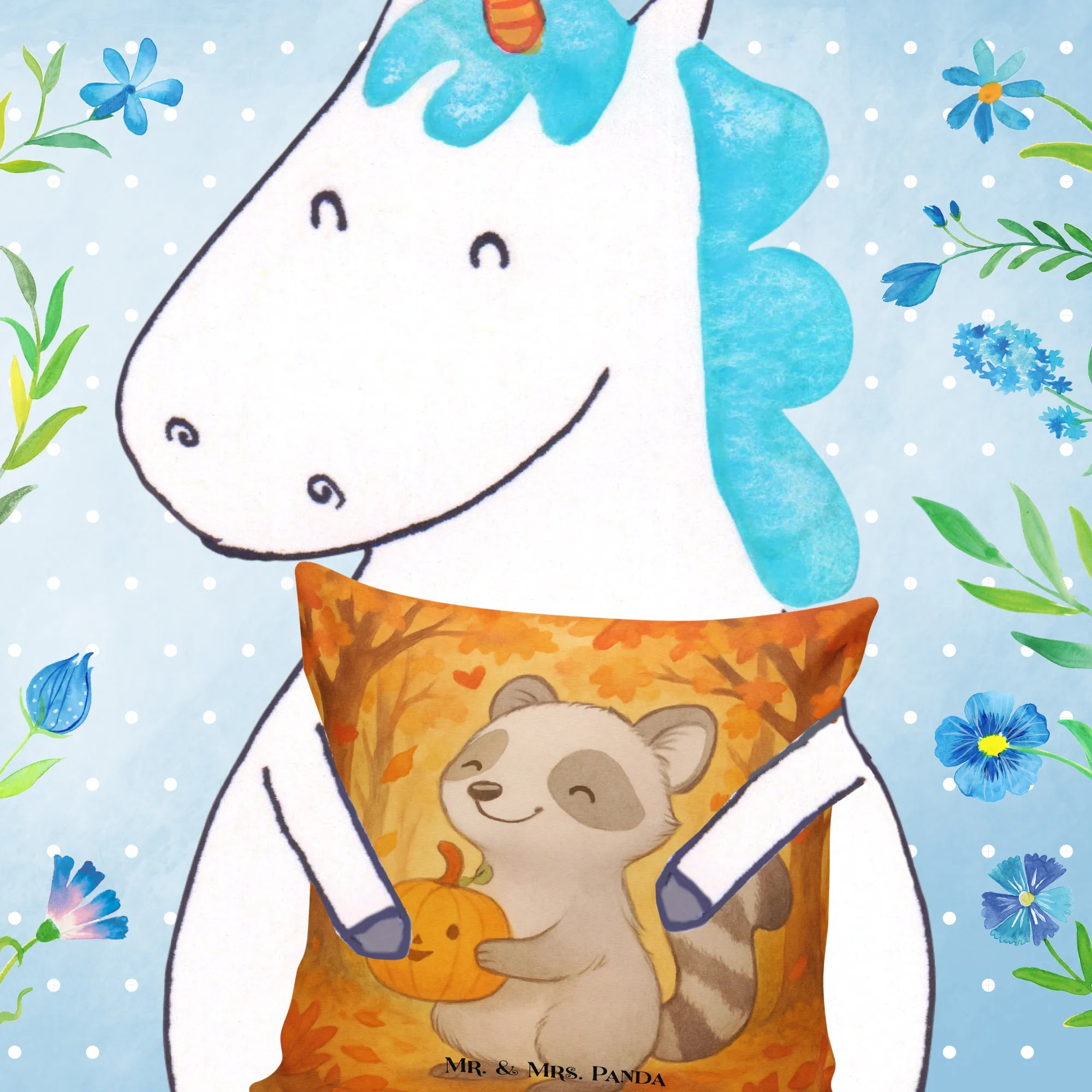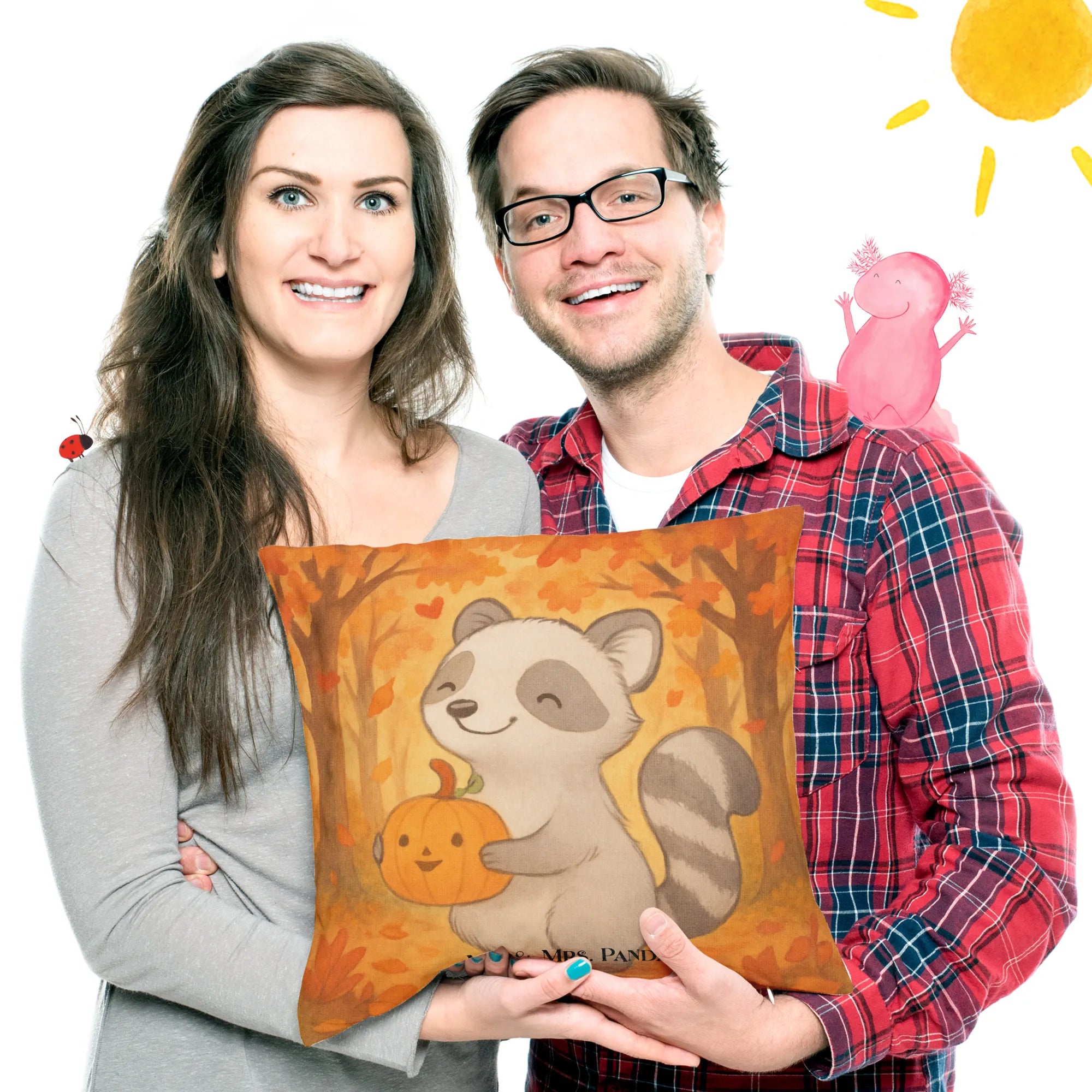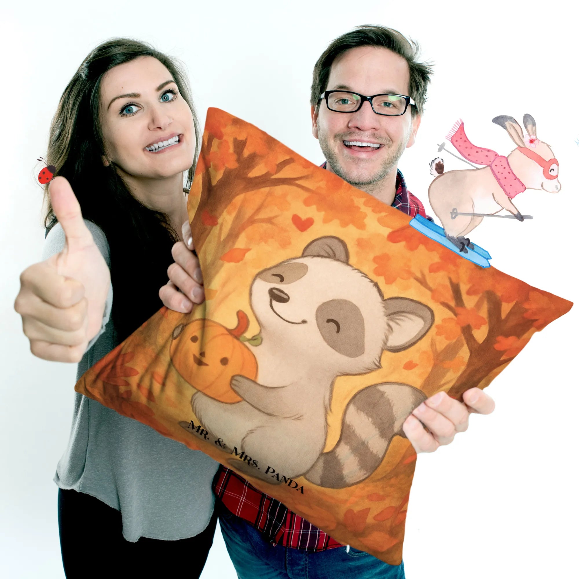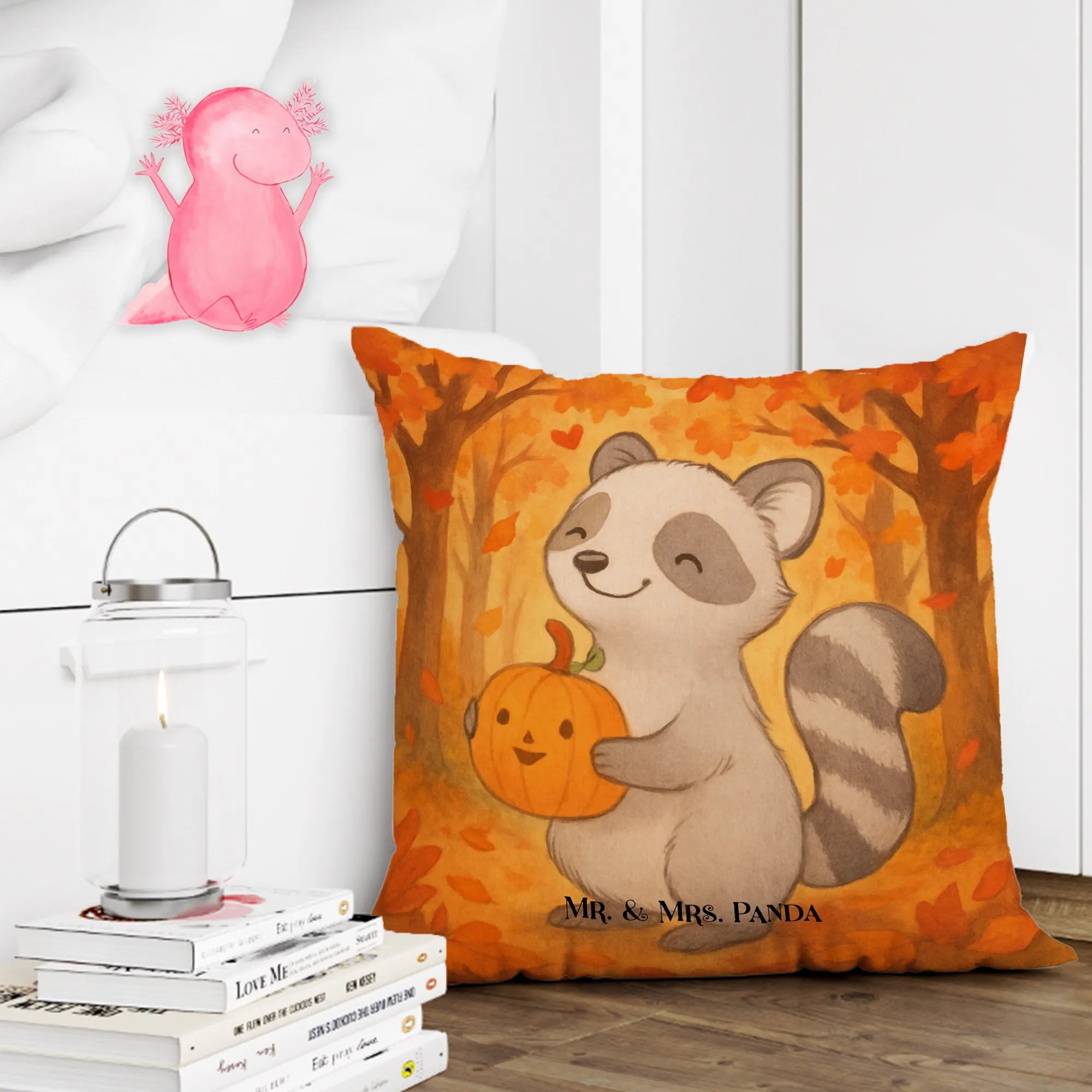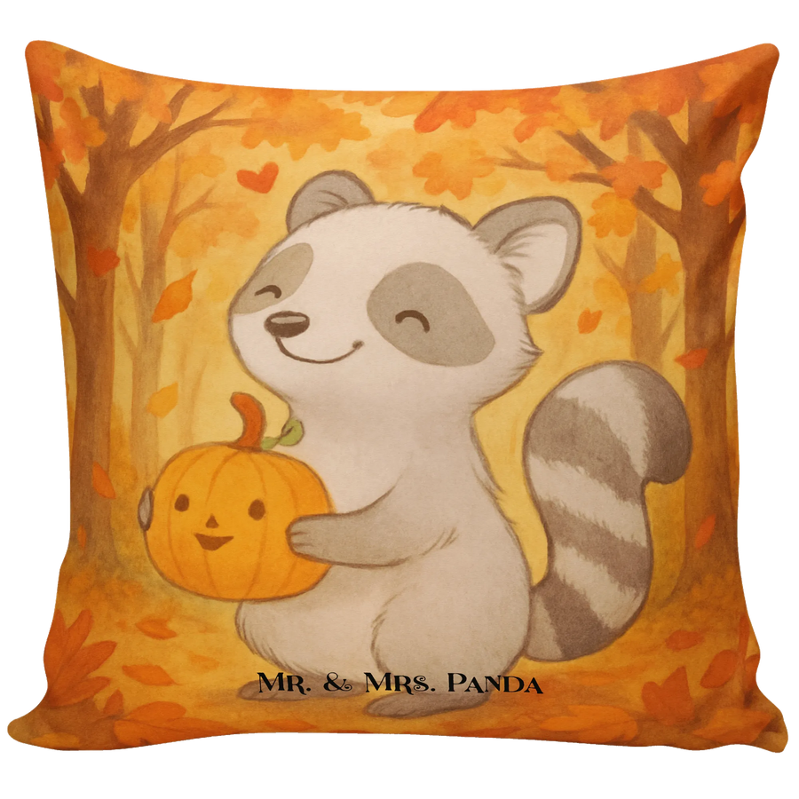 Herbstzauber für dein Zuhause 🍂✨ Hol dir den niedlichen Waschbären mit Kürbis in deine Kuschelecke! Dieses 40x40 Kissen von Mr. & Mrs. Panda bringt warme Herbstfarben und ein fröhliches Motiv auf dein Sofa oder ins Kinderzimmer.