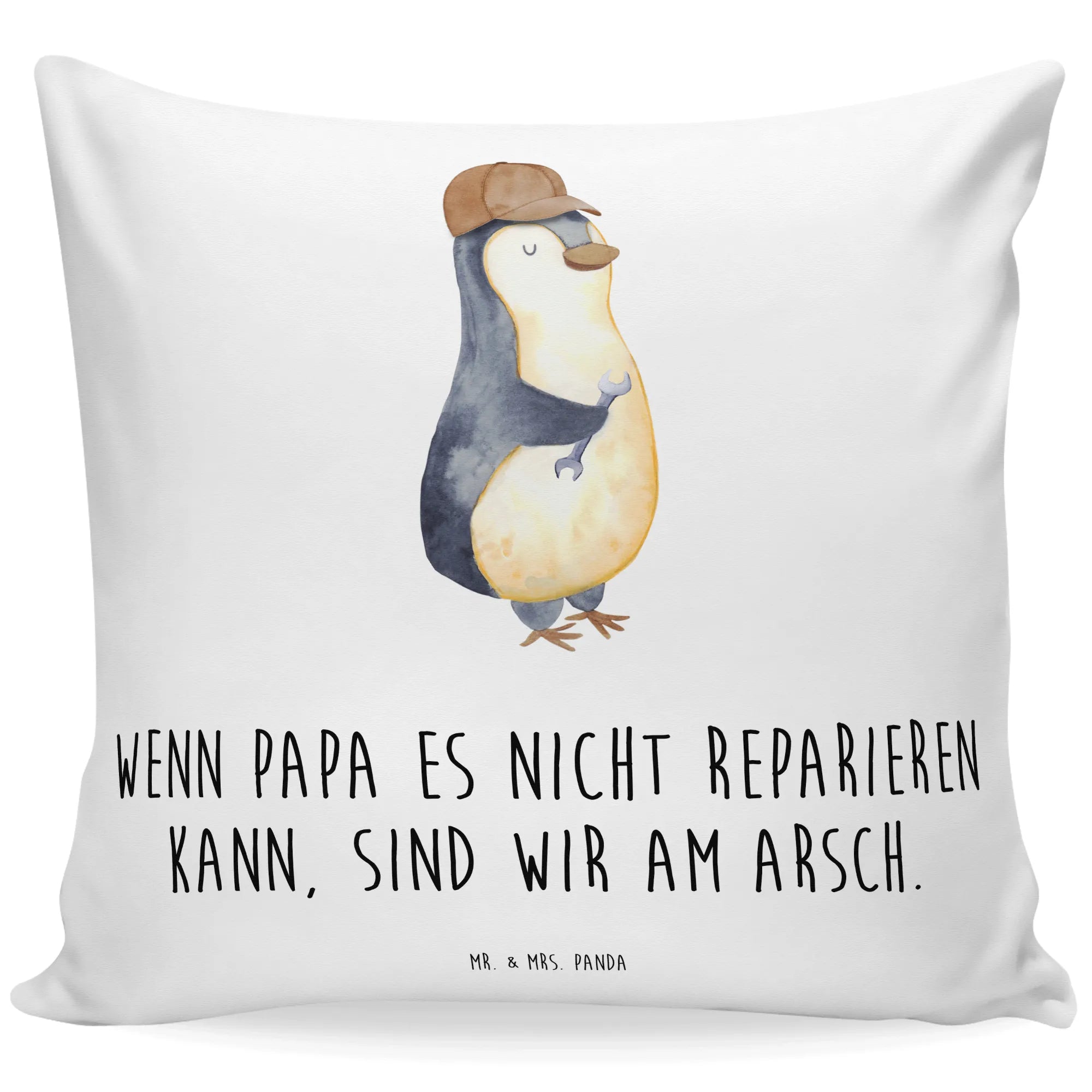 Das Kissen mit dem Motiv "Wenn Papa es nicht reparieren kann, sind wir am Arsch" von Mr. & Mrs. Panda ist das perfekte Geschenk für alle Väter, die mit einem Lächeln und einer Prise Humor durchs Leben gehen. Dieses kuschelige 40x40 Kissen bezaubert nicht nur mit einem witzigen Spruch, sondern auch mit einem liebevoll gestalteten Pinguin, der in seiner verschmitzten Art ein absolutes Highlight auf jedem Sofa ist. Ob zum Vatertag, Geburtstag oder einfach zwischendurch, dieses Kissen bringt jeden Papa zum Schmunzeln und ist gleichzeitig eine wunderbare Dekoration für die Couch oder das Schlafzimmer.