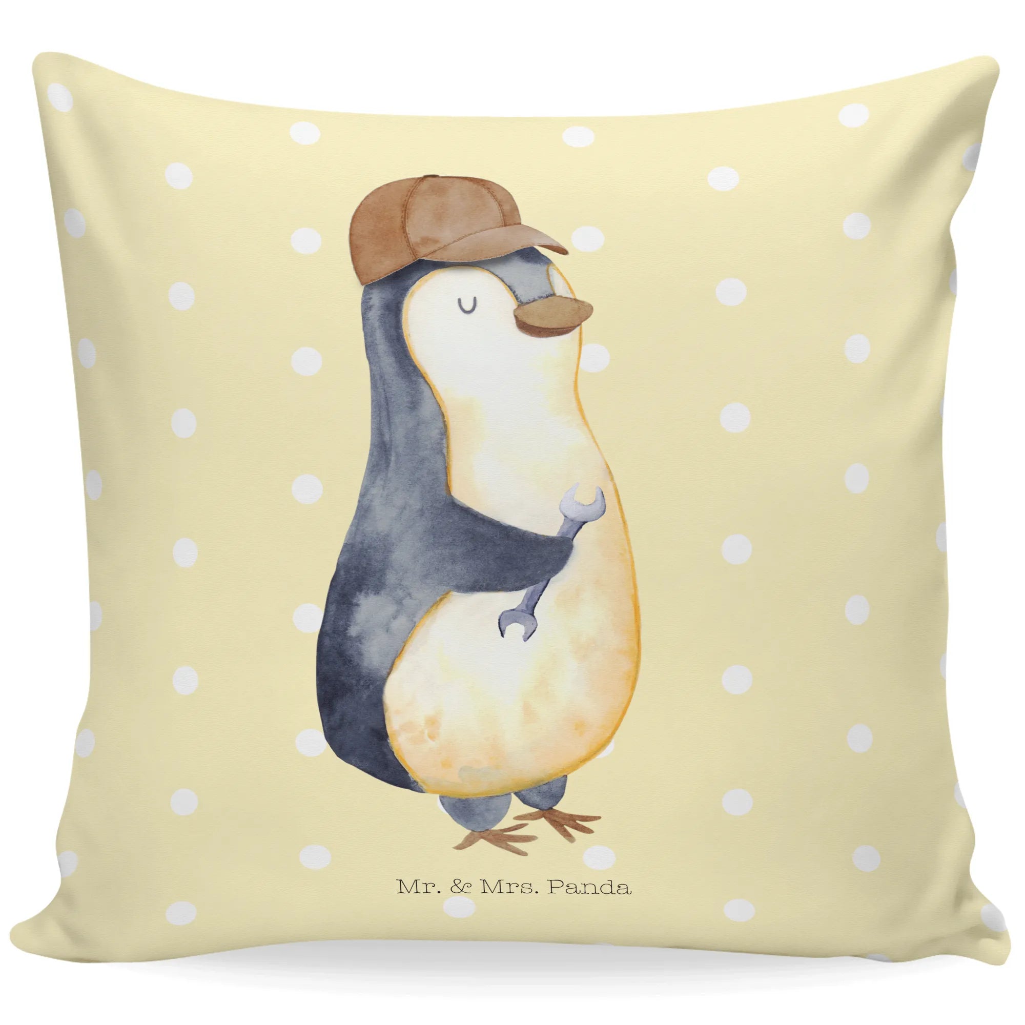 Auf dem Motiv siehst du einen charmanten Pinguin mit brauner Kappe, lässigem Blick und einem Schraubenschlüssel in der Flosse – ein Symbol für handwerkliches Geschick und helfende Hände. Das Motiv ist in Aquarell-Optik gehalten und verleiht dem Kissen eine freundliche, handgemachte Note. Dieses Zierkissen sorgt garantiert für Schmunzeln im Wohnzimmer und ist ein treuer Begleiter bei Familientreffen oder gemütlichen Filmabenden. 😊
