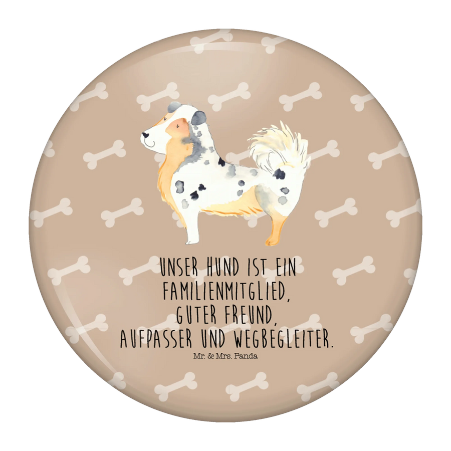 Der 50mm Button mit dem bezaubernden Motiv des Australien Shepherds von Mr. & Mrs. Panda ist das perfekte Geschenk für alle Hundeliebhaber! Dieser Anstecker zeigt nicht nur einen knuffigen Australian Shepherd, sondern trägt auch den liebevollen Spruch: "Unser Hund ist ein Familienmitglied, guter Freund, Aufpasser und Wegbegleiter." Ob für dich selbst oder als wunderschönes Geschenk für Freunde und Familie - dieser Button bringt Hundeliebe in jedes Outfit!