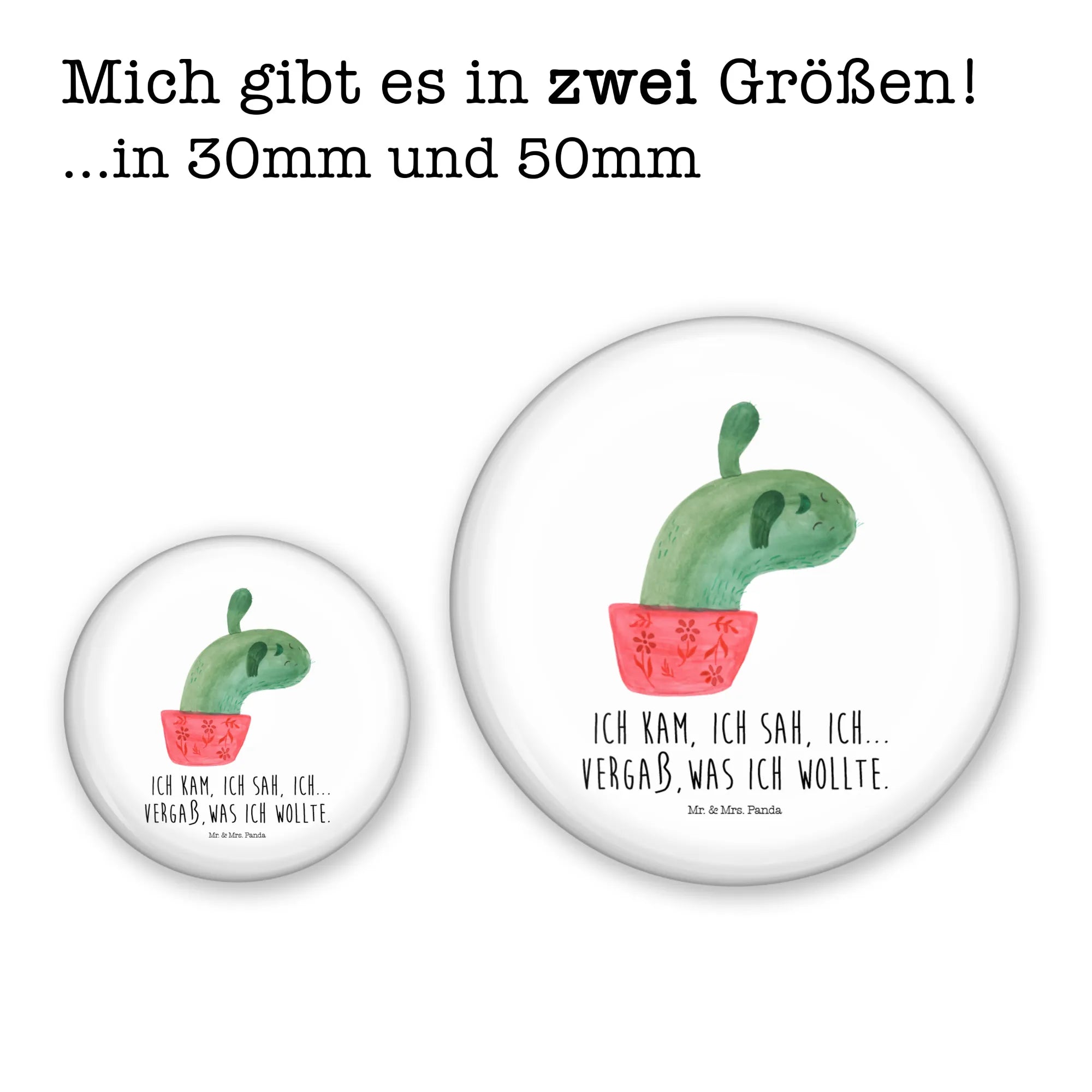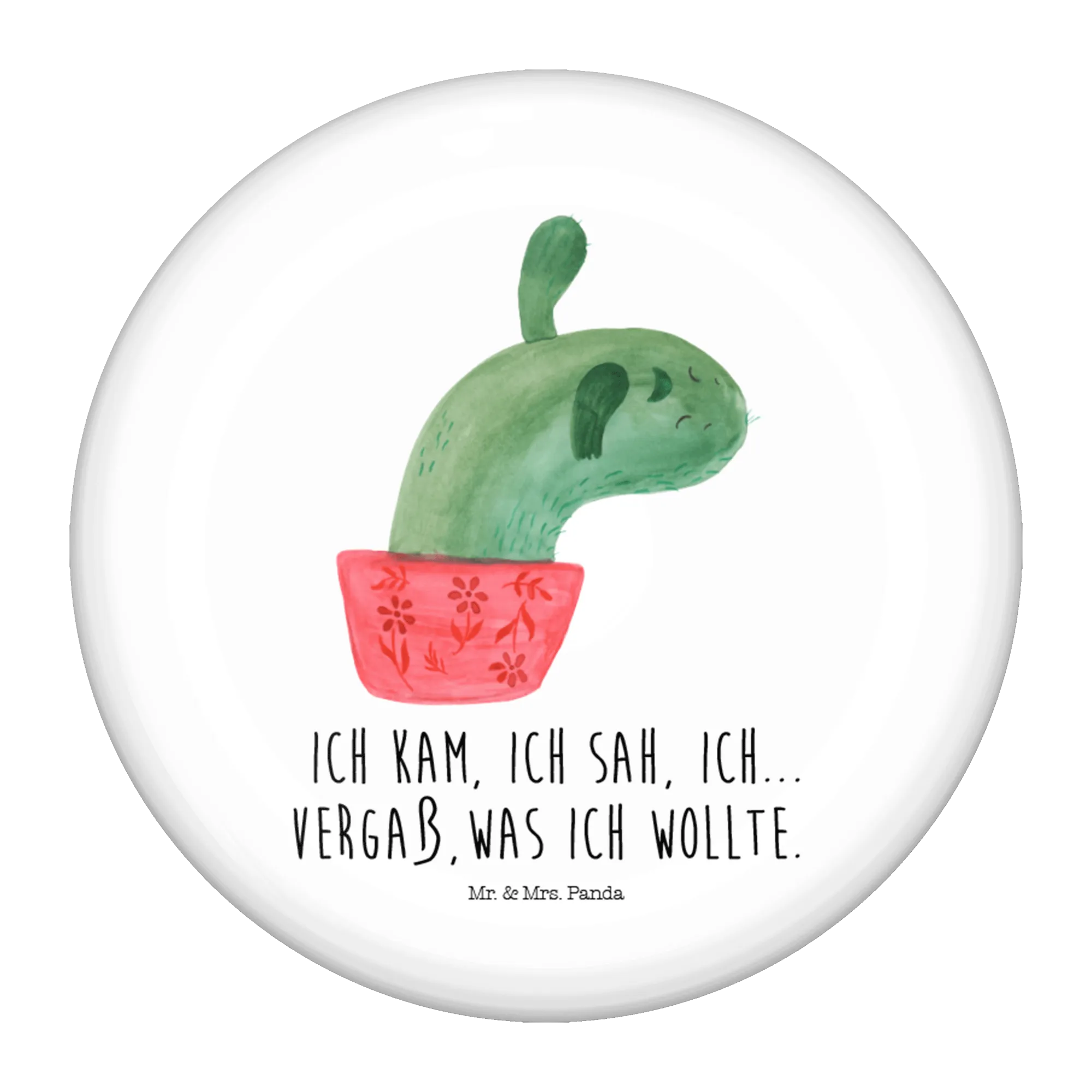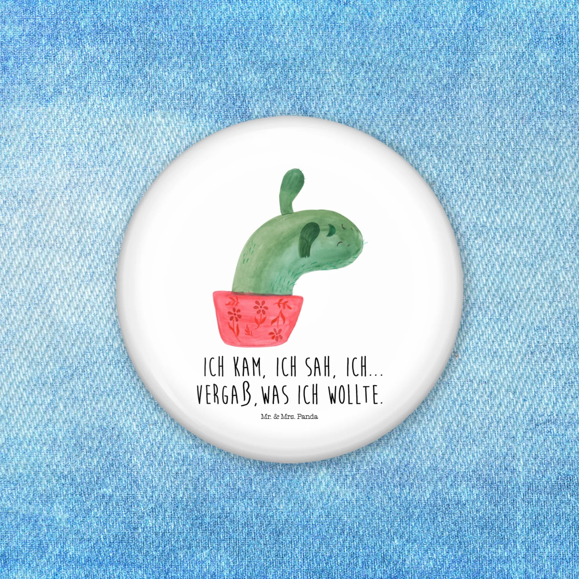 Die fröhlichen Kakteen wurden von Mrs. Panda liebevoll in Aquarell gestaltet und strahlen pure Lebensfreude aus. Der Spruch "Ich kam, ich sah, ich… vergaß, was ich wollte." ist ein witziger Reminder, dass nicht alles im Leben perfekt laufen muss. Dieser Button ist nicht nur ein praktisches Accessoire, sondern auch ein kleiner Muntermacher für jeden Tag.