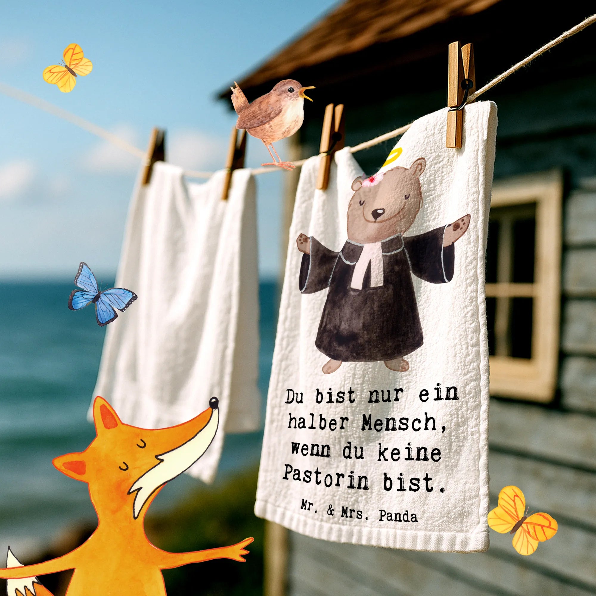 Das Gästehandtuch "Pastorin mit Herz" von Mr. & Mrs. Panda ist das perfekte Geschenk für alle, die in der Kirche tätig sind oder eine besondere Verbindung zur Seelsorge haben. Mit einem liebevoll gestalteten Bären, der eine Priesterrobe trägt und sich segend mit erhobenen Händen zeigt, bringt dieses Handtuch eine fröhliche Note in jedes Badezimmer.