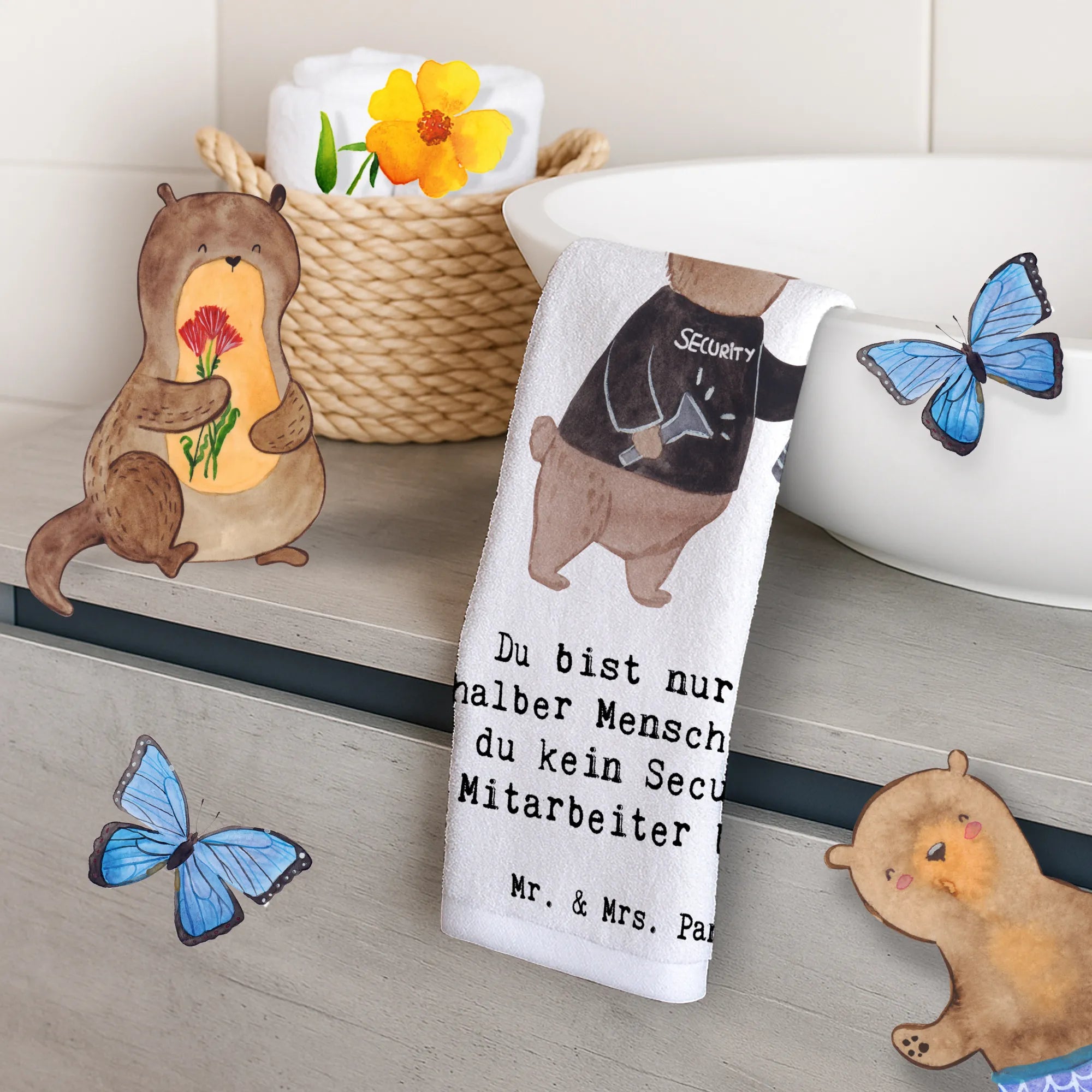 Das Gästetuch "Security Mitarbeiter mit Herz" von Mr. & Mrs. Panda ist das ideale Geschenk für all jene, die in der Sicherheitsbranche tätig sind. Mit einem liebevollen, handgezeichneten Motiv eines süßen Bären, der als Security-Mitarbeiter auftritt, sorgt dieses Handtuch nicht nur für ein Lächeln, sondern auch für viel Freude und Wertschätzung im Alltag.