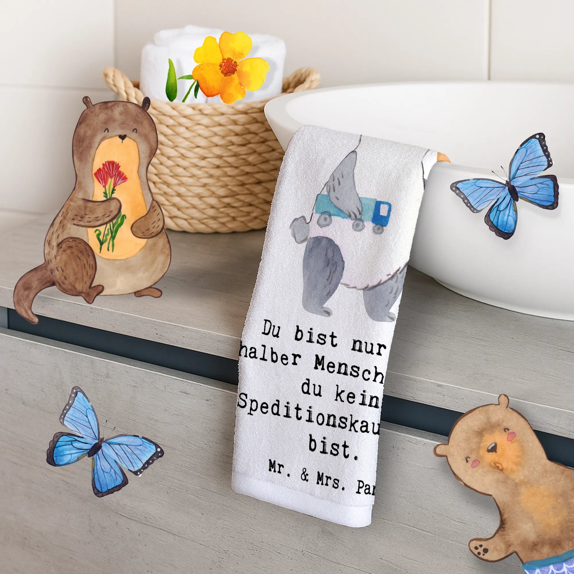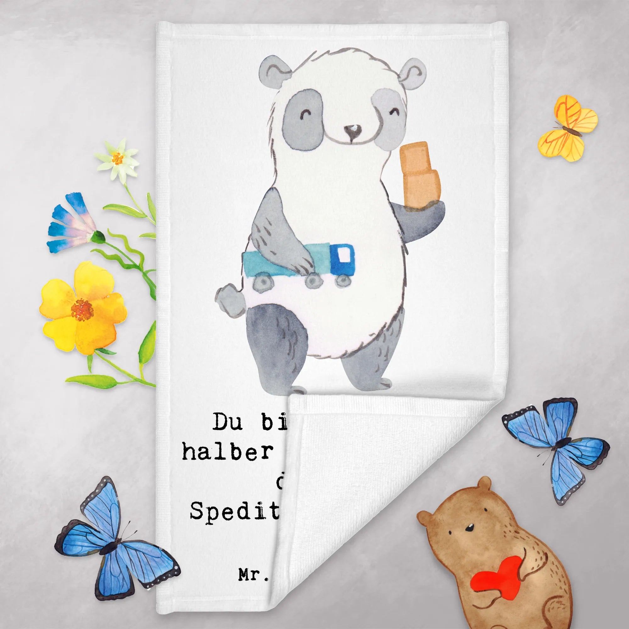 Jedes Motiv in der Berufe Kollektion von Mr. & Mrs. Panda wurde mit Liebe und Fantasie handgezeichnet, um Freude zu bereiten und den Alltag bunter zu gestalten. Werde Teil unserer Panda-Familie und mache dir selbst oder anderen eine besondere Freude. Das Gästehandtuch "Speditionskaufmann mit Herz" wartet darauf, in dein Leben gebracht zu werden!